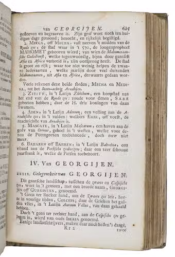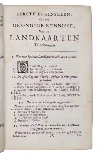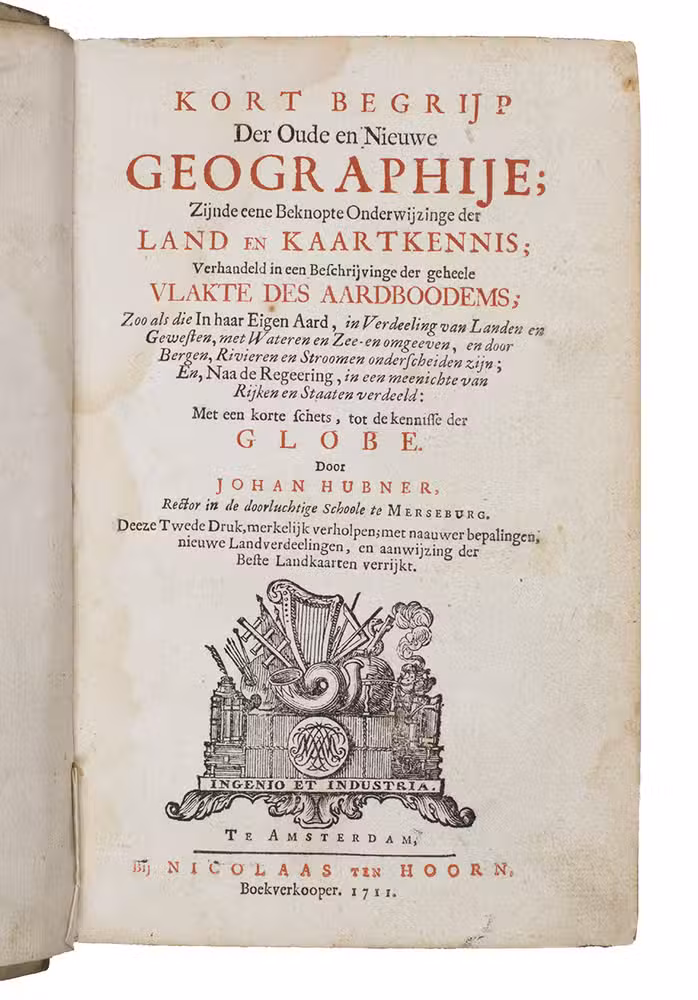 Second enlarged edition of the Dutch translation of Johann Hubners popular Kurtze Fragen aus der alten und neuen Geographie, first published in Leipzig in 1693, followed by 16 editions during his life. Nicolaas ten Hoorn also published the first edition of the Dutch translation, in 1707. Further editions followed in 1722, 1729 and 1737, the last two published by Van Poolsum in Utrecht. As the earliest schoolbook for geography in Europe, it proved very popular and was also translated into French, Italian, Swedish and Russian