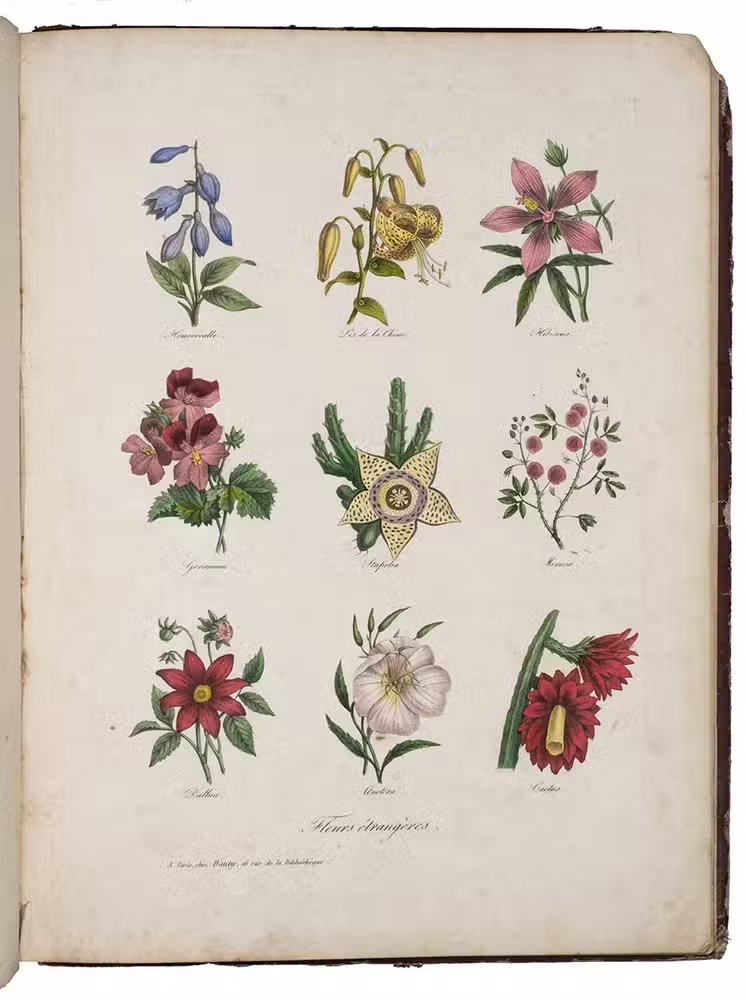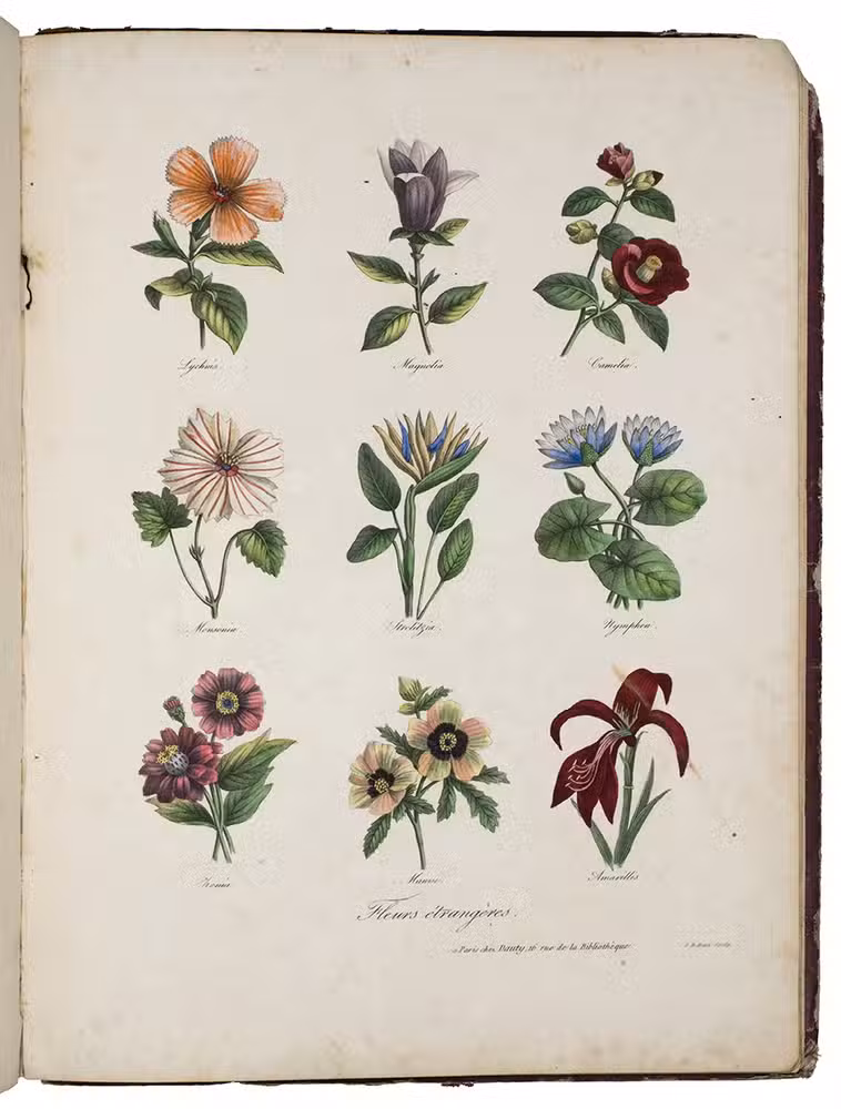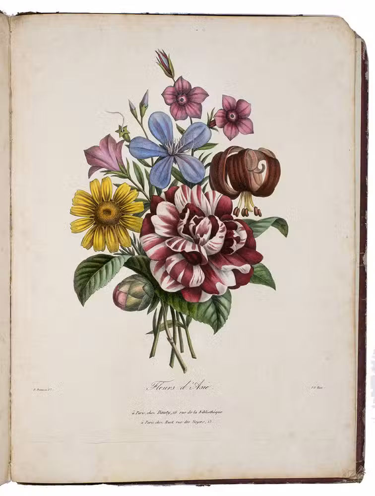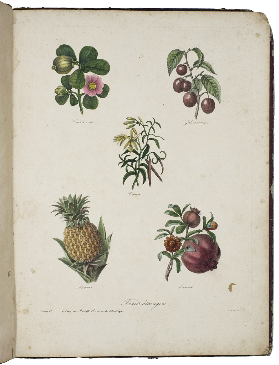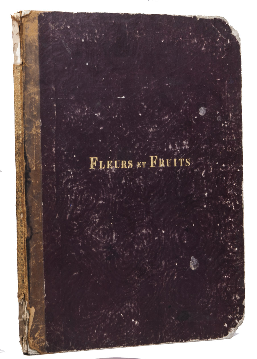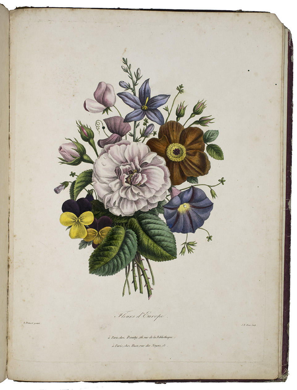 Paris, Dauty, [ca. 1837/1838]. Folio (ca. 35 x 26.5 cm). With an engraved title-page and 11 (of 23) engraved botanical prints: 4 showing 5 kinds of fruits each, 3 showing 9 types of flowers each and 4 showing flower bouquets. All prints are stipple engravings and coloured by a contemporary hand, some parts glazed with egg white. Contemporary half sheepskin. [12] ll.