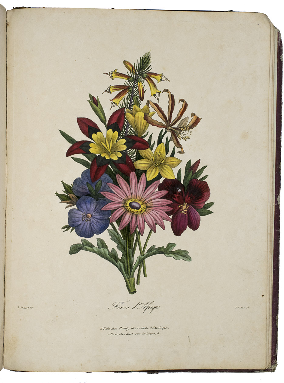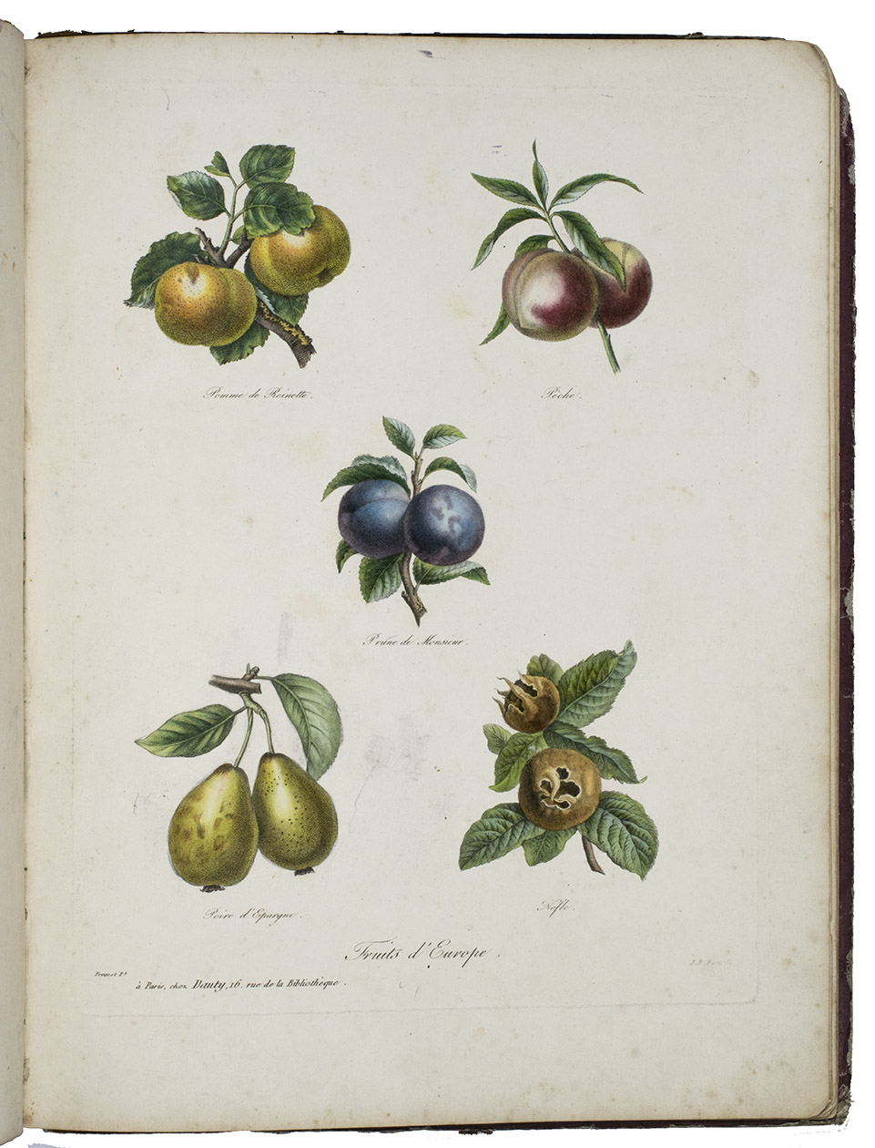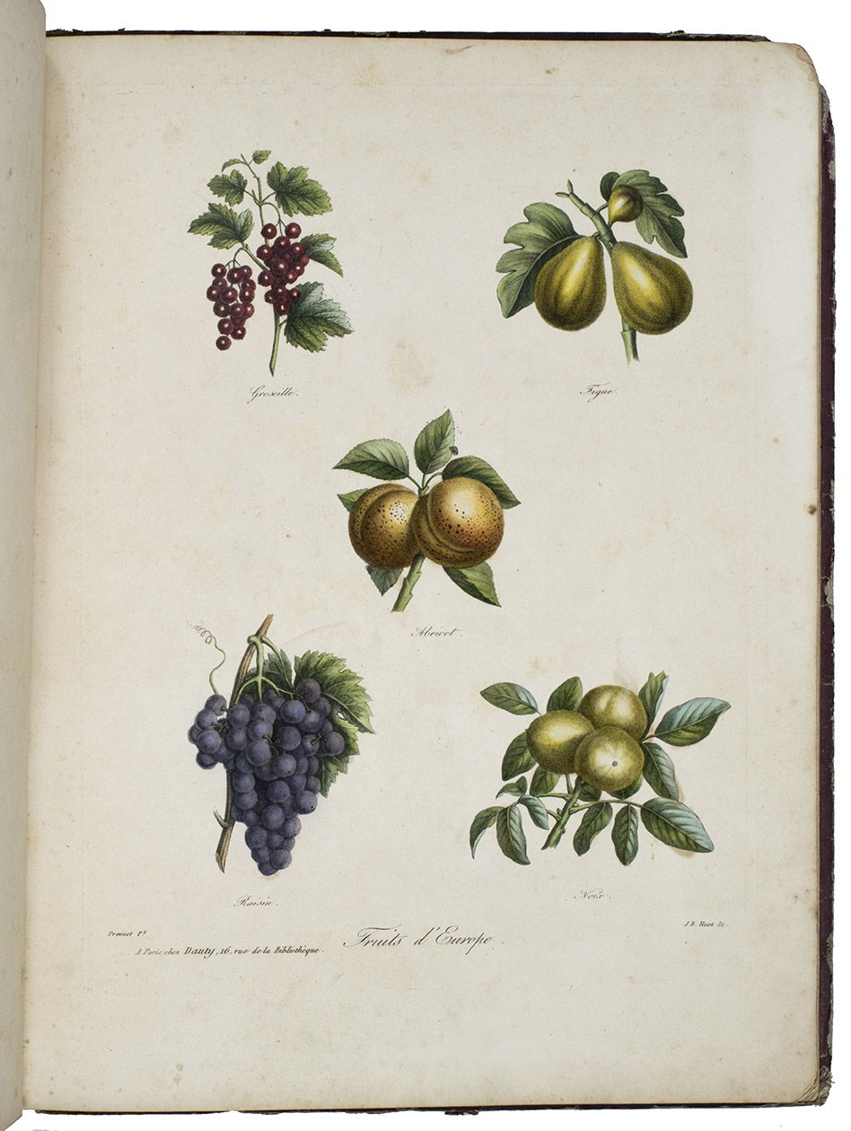 Extremely rare botanical print series showing both European and exotic fruits and flowers, engraved by Jean-Baptiste Huet the younger (1772-1852) after designs of Benoît-Louis Prévost (1735?-1804?) or Jean-Louis Prévost (1760-1810). It also includes four plates showing bouquets from Europe, America, Asia and Africa. Only one complete copy is known, at the Bibliothèque nationale de France, we have traced no copy in sale or auction records and it is not mentioned in the usual botanical bibliographical works. The BnF copy is described in the Inventaire du fonds français après 1800 where the series consists of 23 prints issued all together under this title. The BnF and the IFF date the work ca. 1837-1839, but it is more likely that it is ca. 1837-1838, as Dauty died in 1838 and he printed at Rue de Bibliothèque no. 16 only in 1827 and 1835-1838. The BnF ascribes the designs for the prints to Benoît-Louis Prévost, but Jean-Louis Prévost remains a possibility, for he produced another famous print series of flowers and fruits in the same style of stipple engravings, Collection des fleurs et fruits (1805).