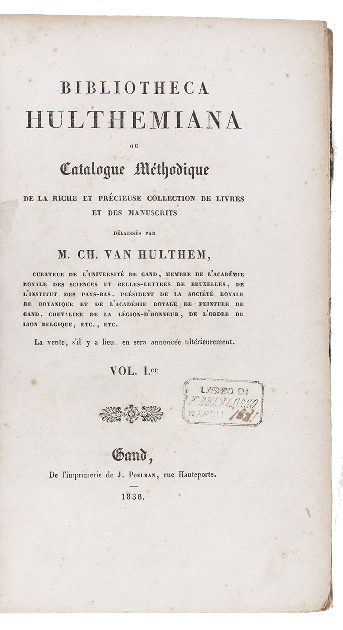 Ghent, J. Poelman, 1836-1837. 6 volumes. 8vo. With lithographed portrait of Charles van Hulthem as frontispiece. Contemporary half goatskin.