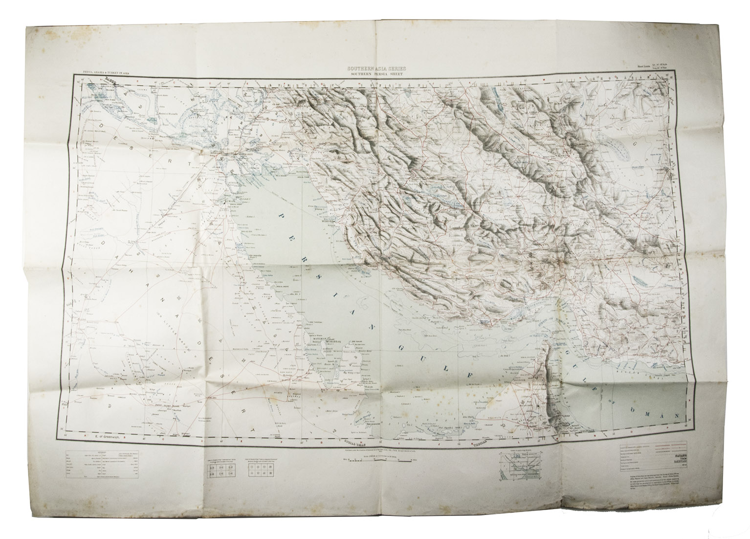 As the Southern Persia sheet, the present map is part of a very large 9-sheet combined map covering the area from the Red Sea to India, called the Survey of India Southern Asia Series (1912-1945). The present map and a separately published index could be obtained only on application through an officer at the Map Record and Issue Office in Calcutta.