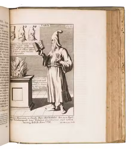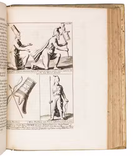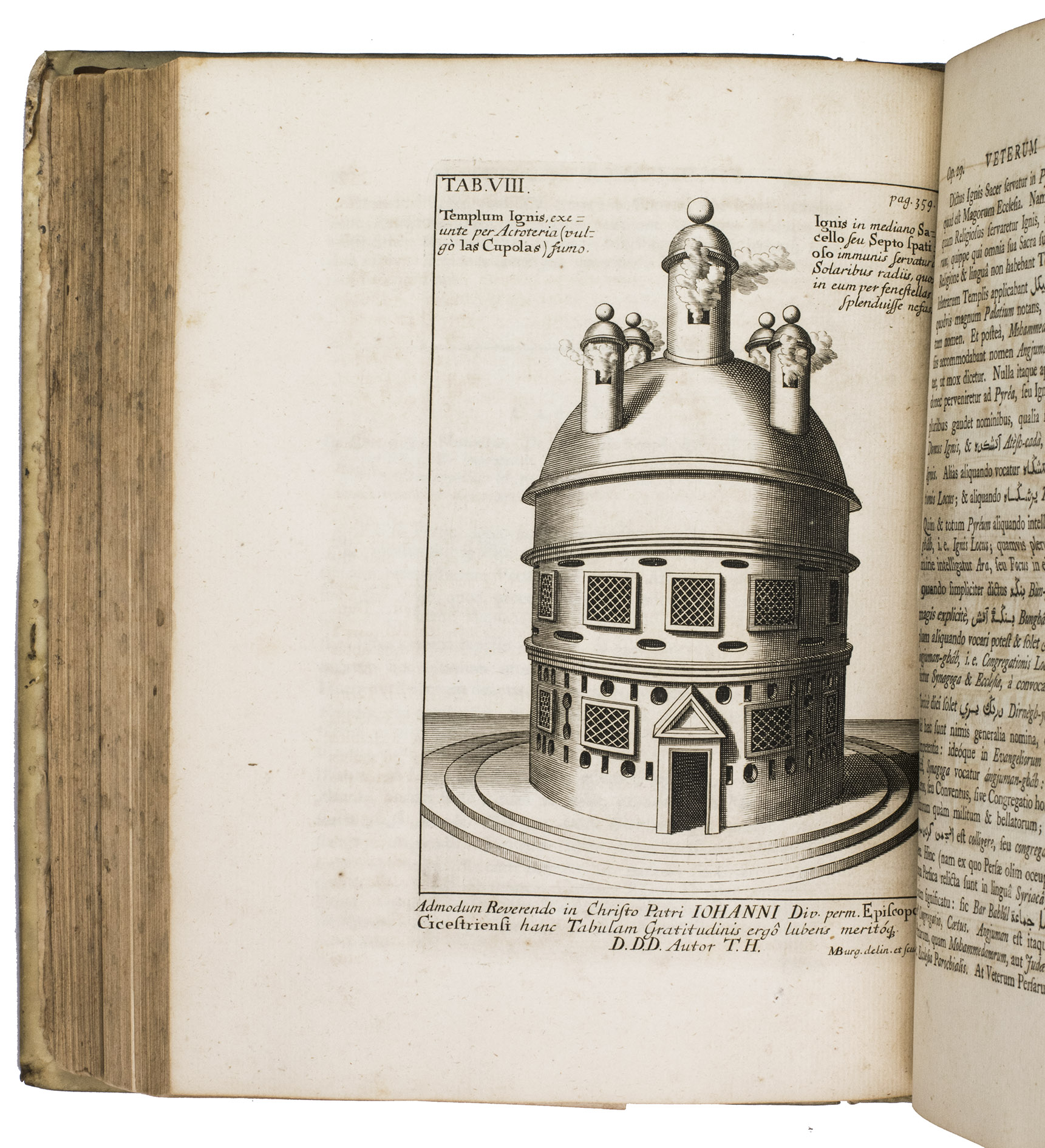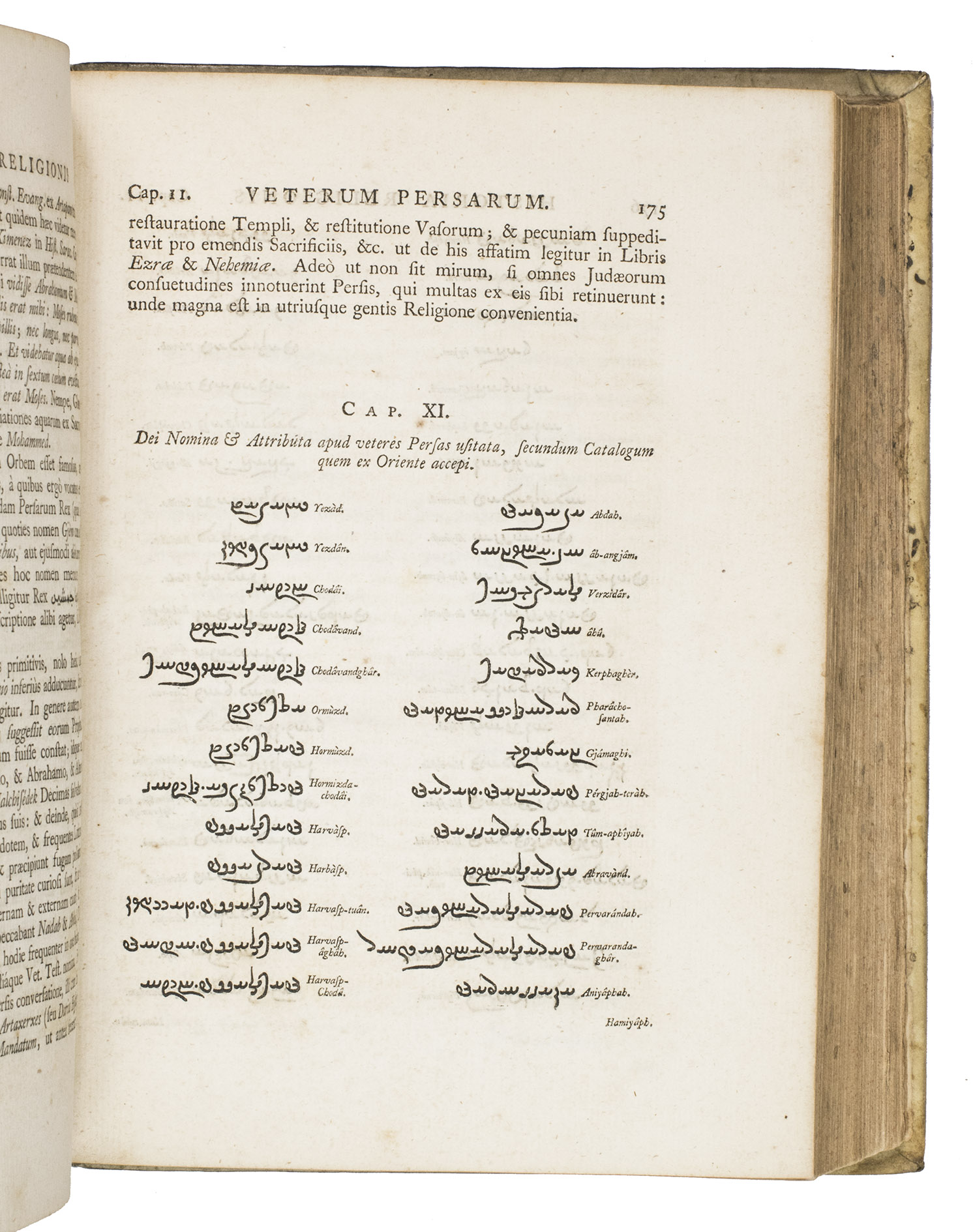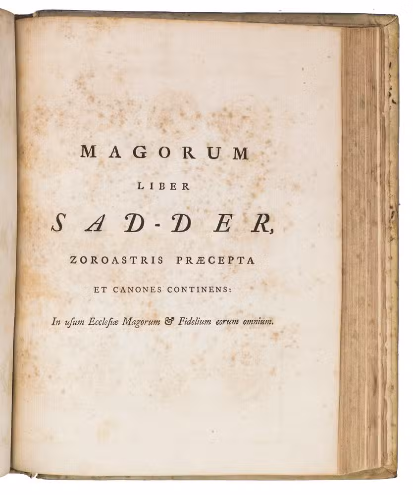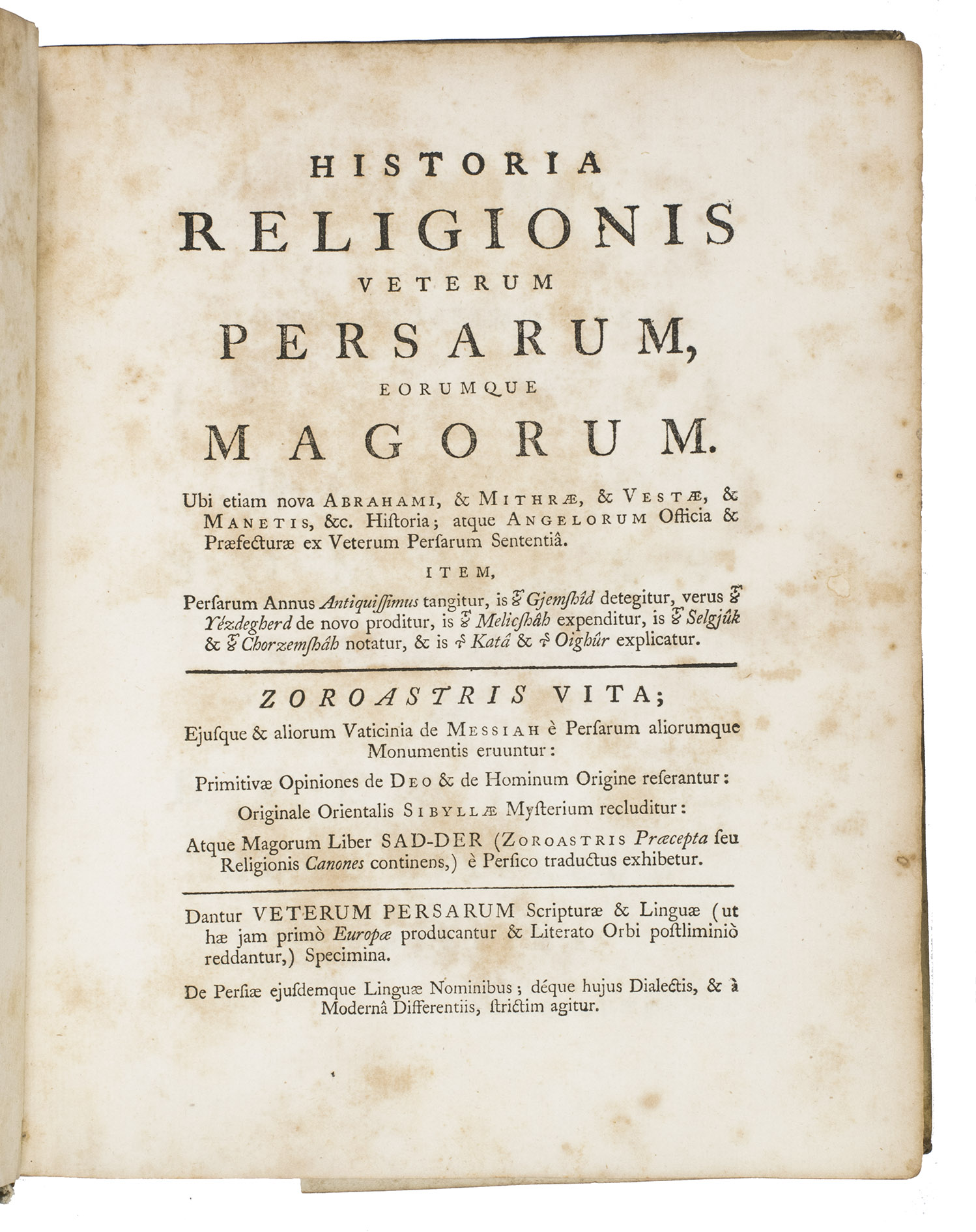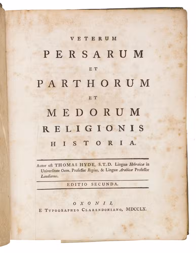 Second edition of Thomas Hyde's important study into the pre-Islamic religions in Persia. It includes an account of the life of Zoroaster (Zarathustra) and a comparative study of Persian and other oriental languages. Hyde based himself on Latin, Greek and Arabic sources and the few Zoroastrian sources he could find. His many sources are quoted in the original languages, which required the use of Oxford's Greek, Hebrew, Syriac and Samaritan typefaces, as well as the creation of new type for the Avestan language. The many plates illustrate various aspects of the pre-Islamic religions, but also various inscriptions (including Chinese), plants and even Oxford's stuffed Dodo. Included in the appendix is the first Western publication of a quatrain from Omar Kahayyam's famous Rubaiyat.