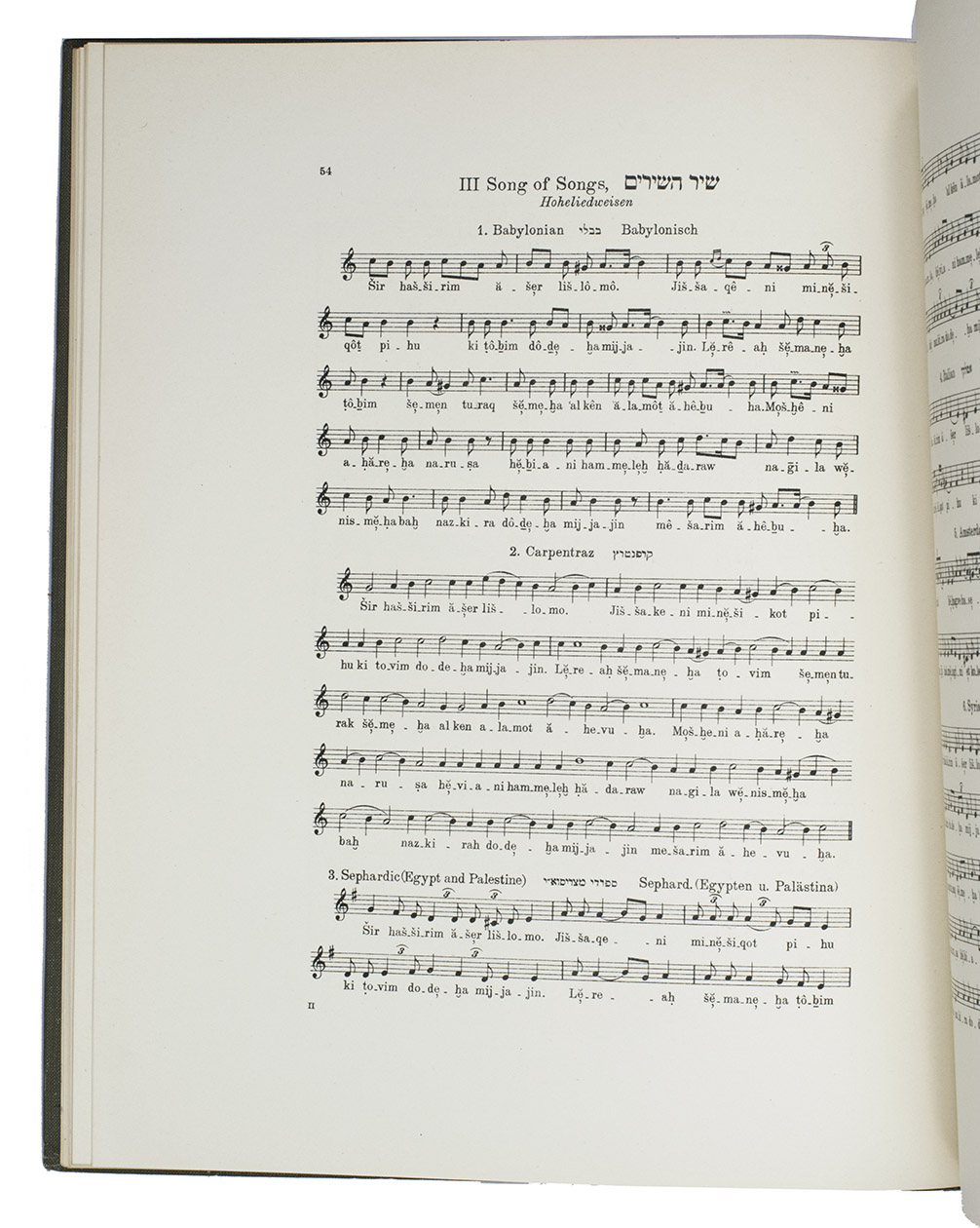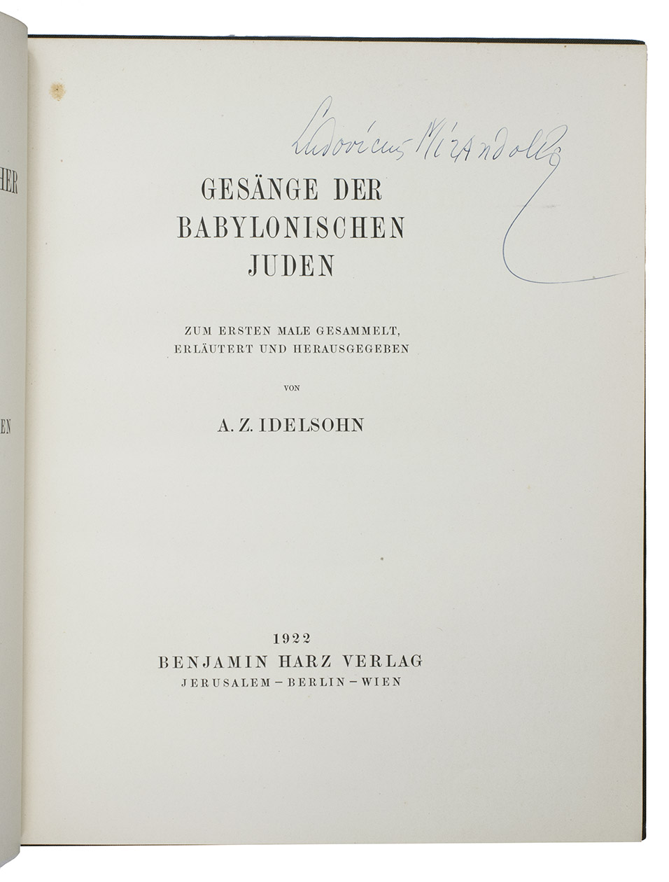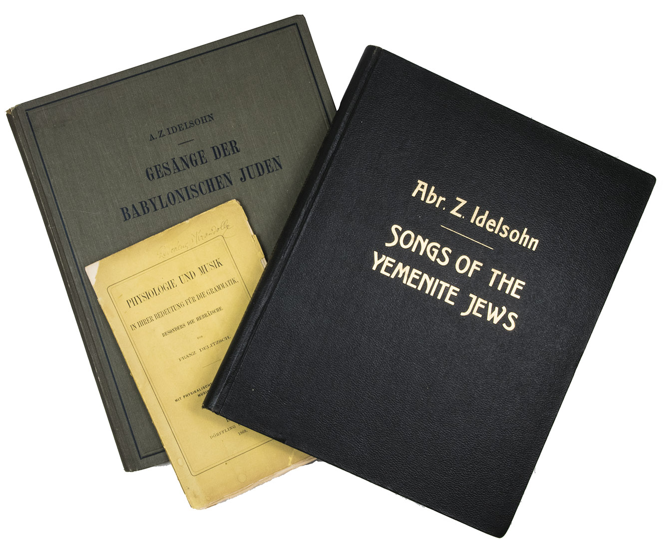 Abraham Idelsohn (1882-1938) is widely considered the pioneer of modern Jewish musicology. Born in todays Latvia, he travelled extensively and recorded the musical traditions of the diasporic Jewish communities. Over the course of 20 years, Idelsohn surveyed the musical traditions of various Jewish communities in Palestine and throughout the Diaspora, including Babylonian, Persian, Bukharian, Oriental Sephardi, Moroccan, German, Eastern European, and Hassidic communities, and published the final volume of his collection in 1932. The two volumes offered here form part of his monumental and very rare work, collecting the songs of the Yemenite and Babylonian Jews. Idelsohns survey and catalogue of the songs encompass Synagogal and Non-Synagogal songs, comprising of songs for the Sabbath, feasts and high feast, working days as well as lamentations, penitential songs and songs for other occasions and folk songs. In his monumental work, he presented an extensive introduction to the musical culture of the Jewish tribes and extensive commentary on the variations within the chant. Idelsohns works were printed by Breitkopf & Härtel in Leipzig, the worlds oldest music publishing house and renowned for their high quality musical scores.
