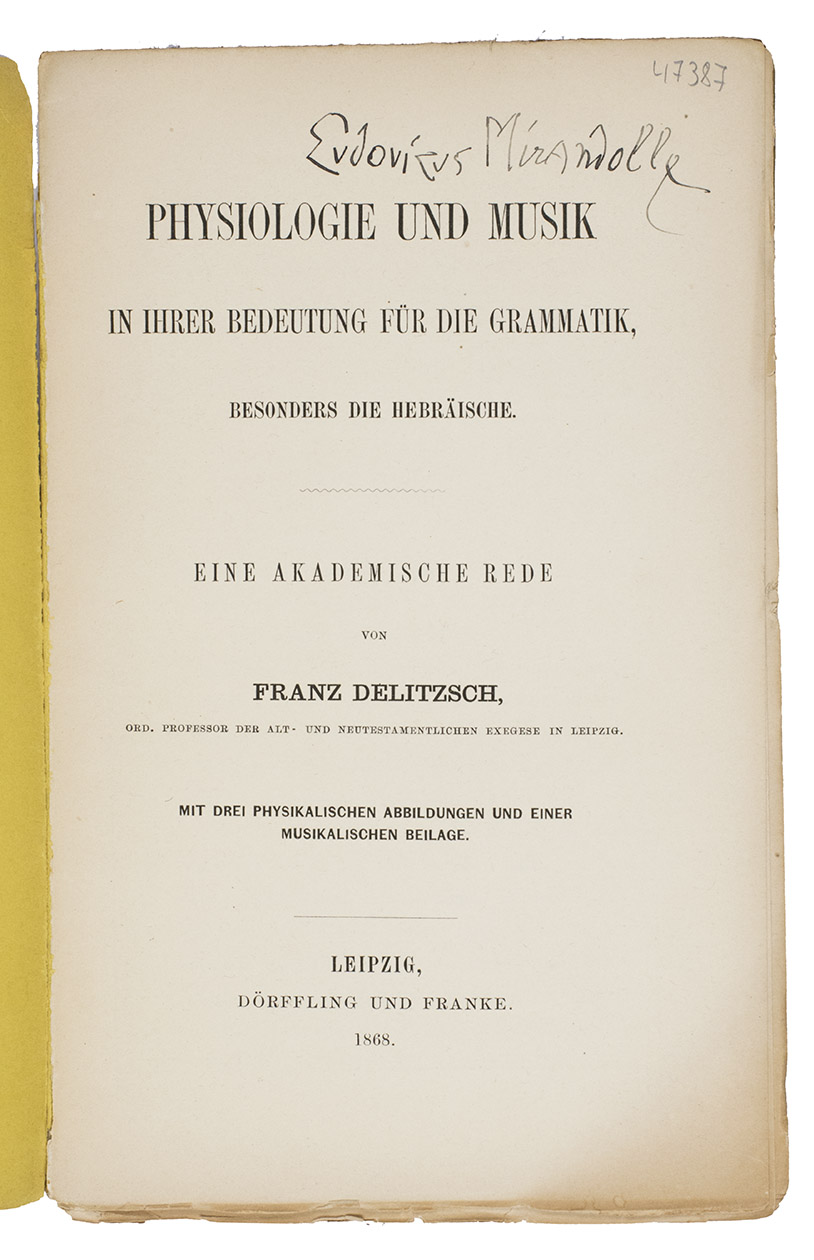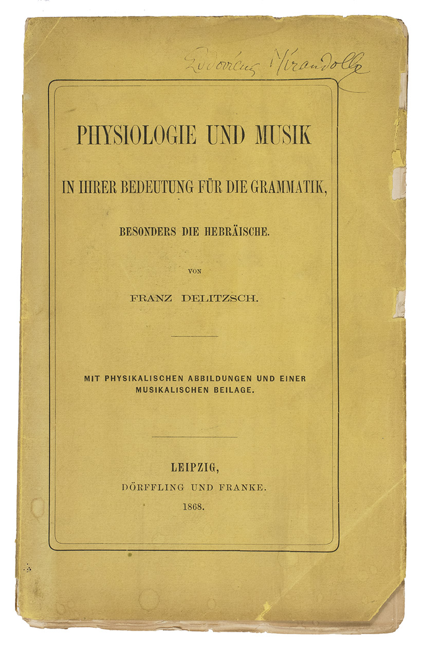 With: (2) DELITZSCH, Franz. Physiologie und Musik in ihrer Bedeutung für die Grammatik, besonders die Hebräische. Mit physikalischen Abbildungen und einer musikalischen Beilage.