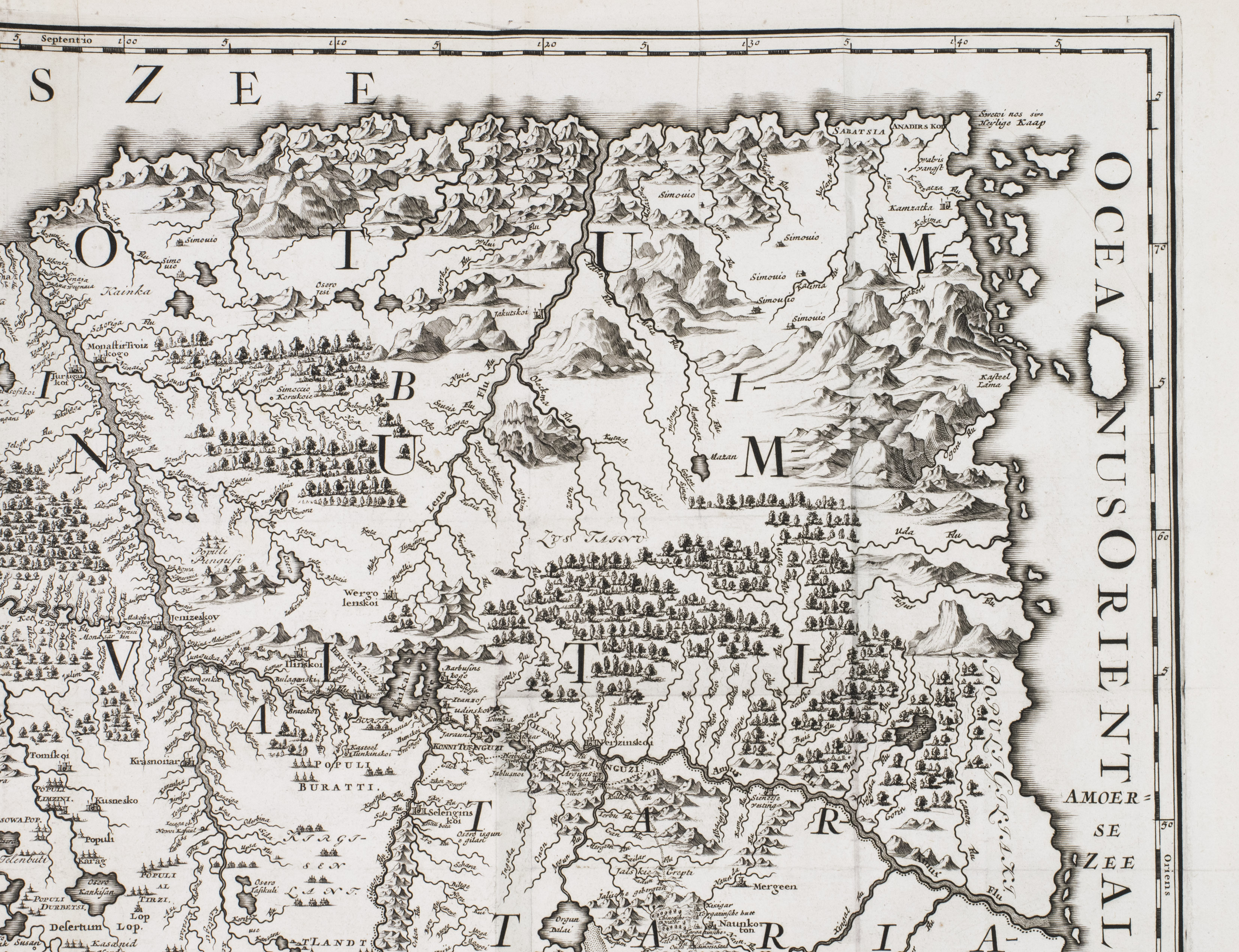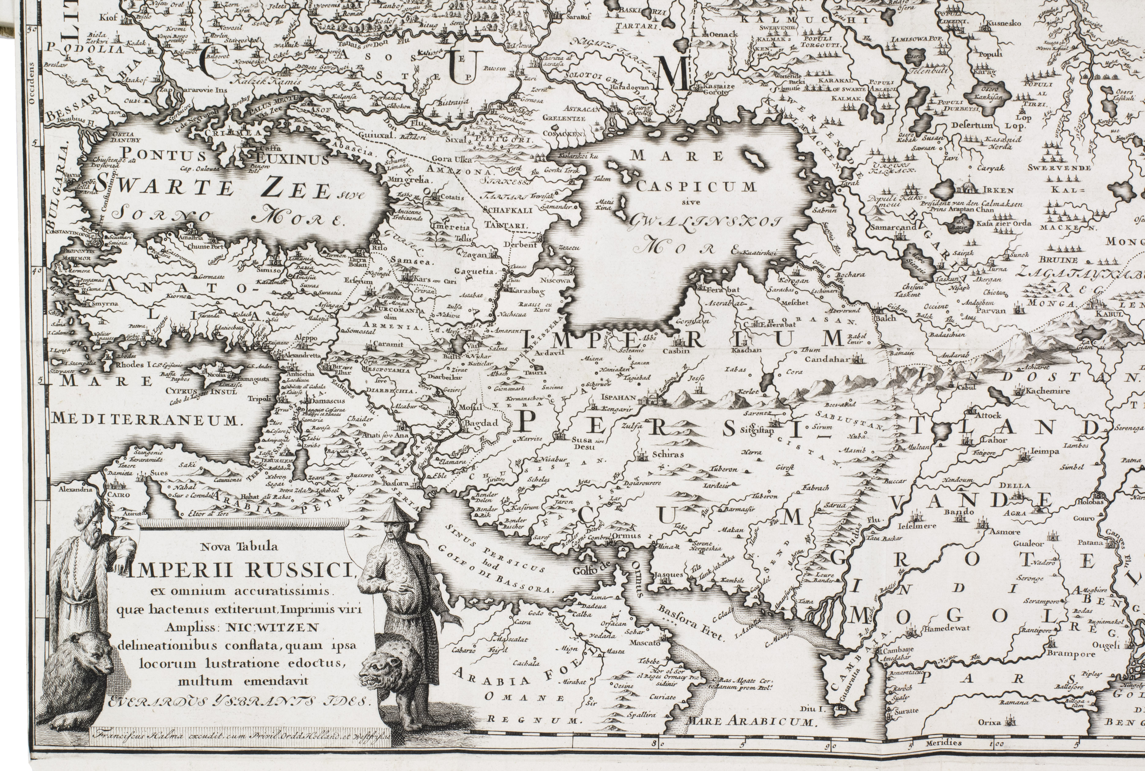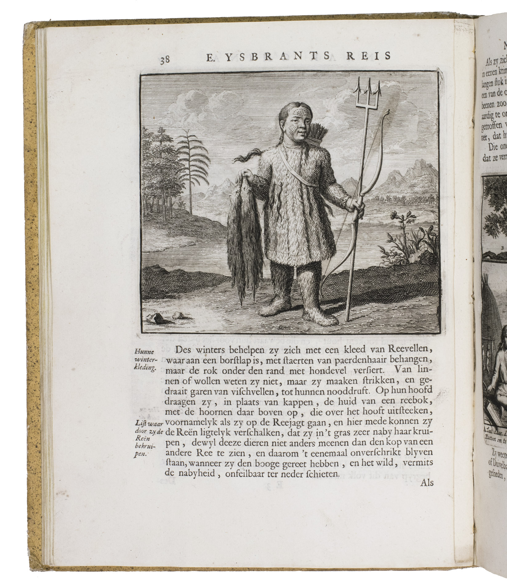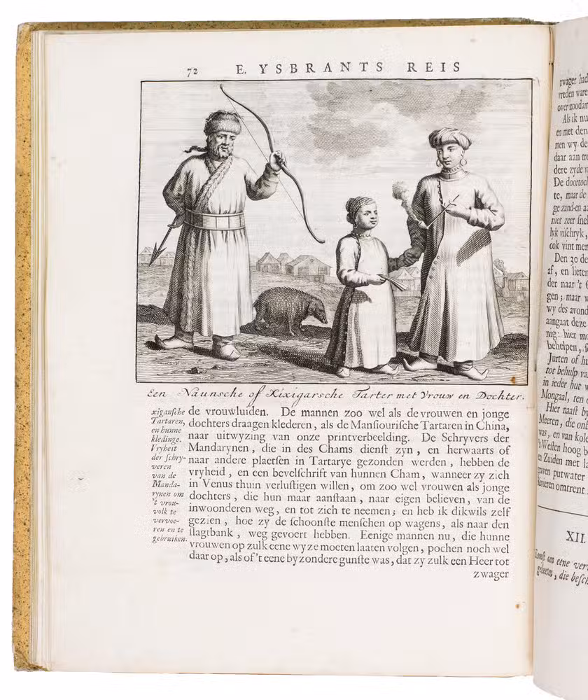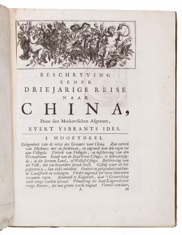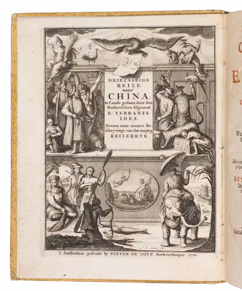 The map Ides used for his journey had been created by Dutch cartographer, wroter, diplomat, and Amsterdam mayor Nicolaas Witsen (1641-1717) in 1687. Ides supplemented and improved it during his travels. After his return, Ides sent Witsen the new map and the transcription of his travel journal. Witsen translated it into Dutch and published it in 1704, with the corrected map. The work became popular and was soon translated into French, English and German. The present copy is the second Dutch edition, published a few years after the first.
