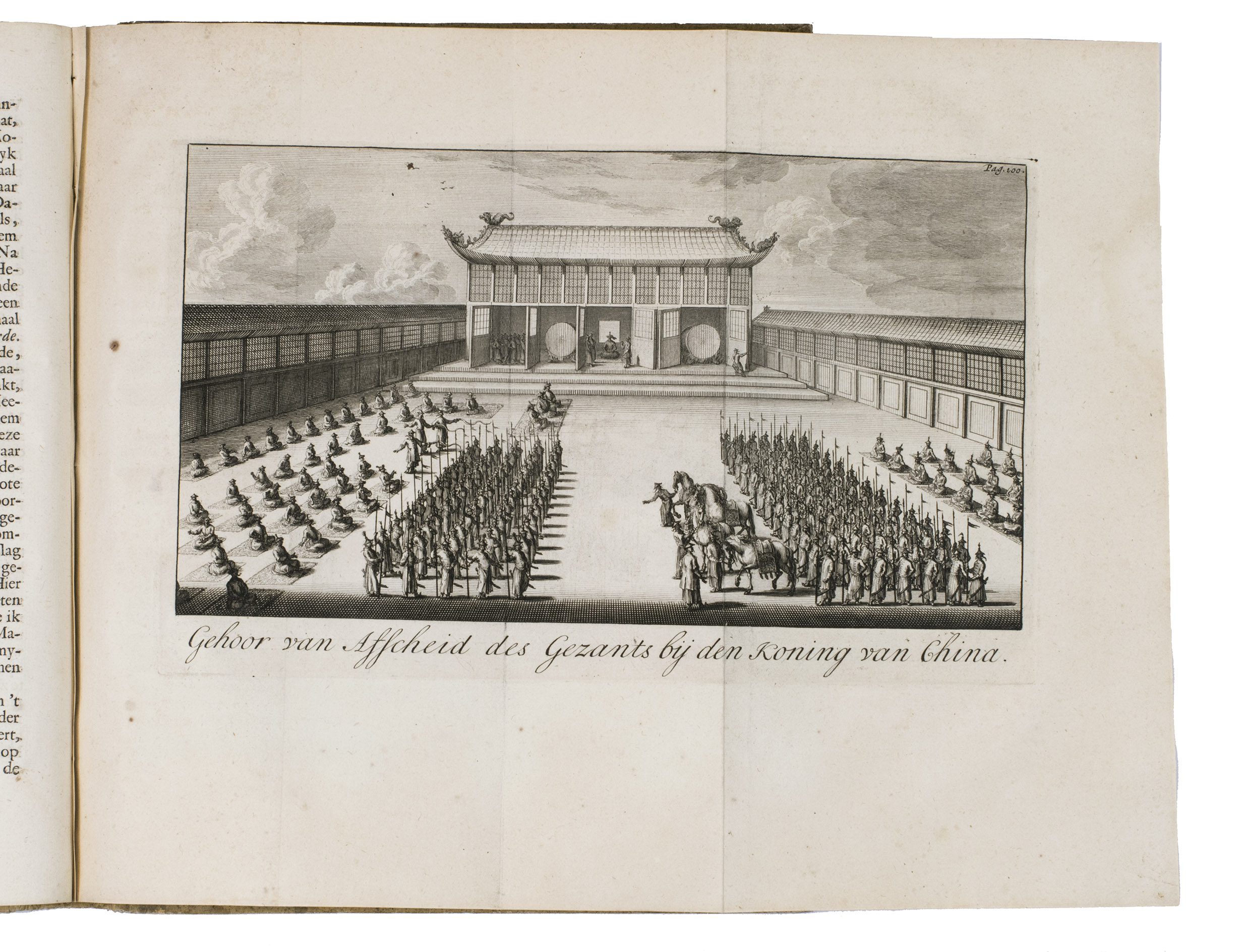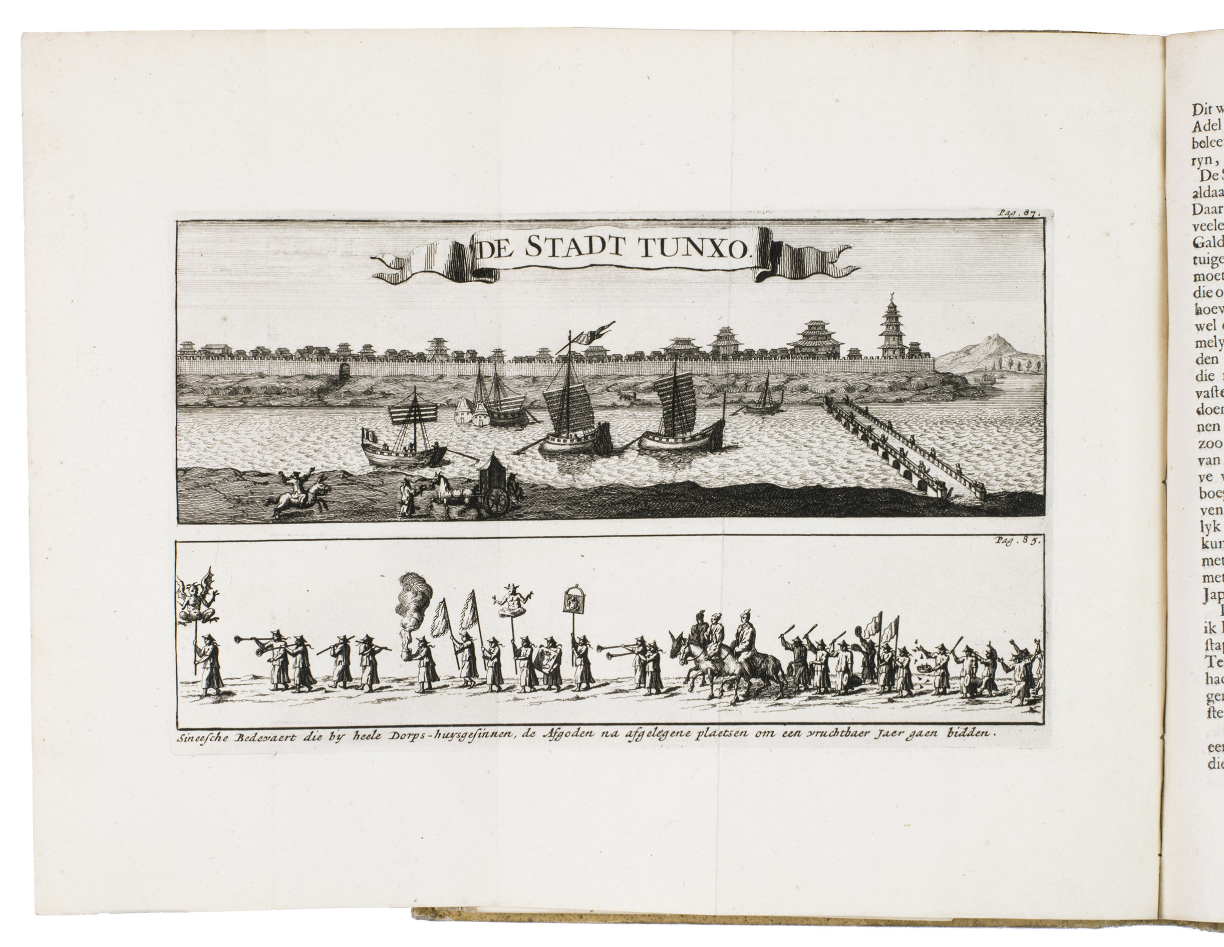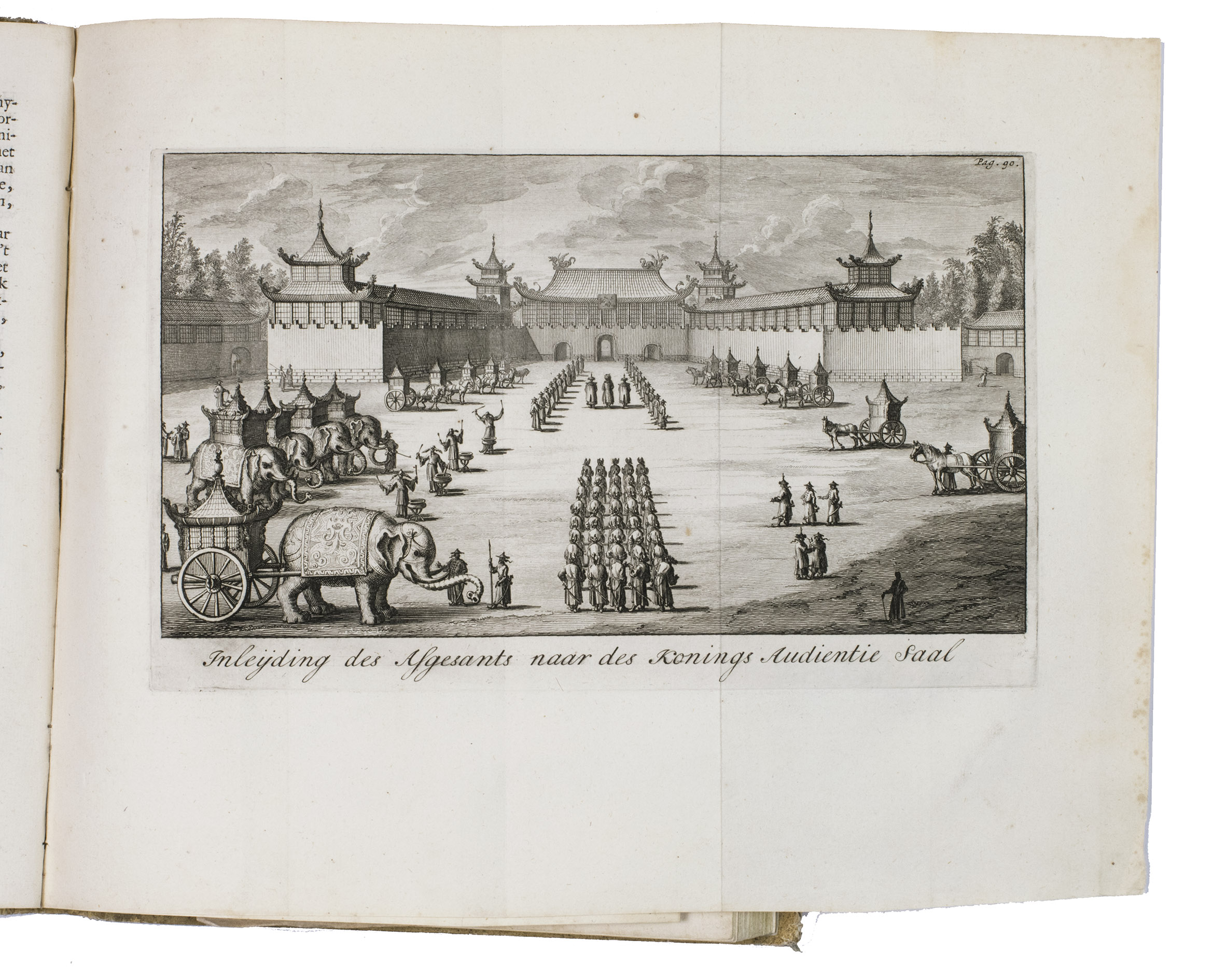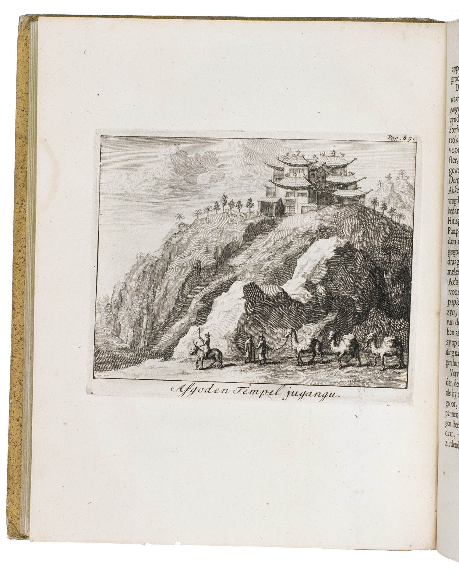 All engravings are very crisp and clear. The edges and corners of the boards are scuffed and the front and back are somewhat rubbed, showing the cardboard underneath. The end leaves, title-page, and blank recto of the frontispiece are foxed, without affecting the engraving, with a water stain in the top corner of the 4 leaves in signature ††, and on the outer half of pp. 231-end of the work. Otherwise in good condition. Catalogue de la section des Russica, I176; Cordier, Sinica, p. 2469; Howgego, vol. 1, 14; STCN 169912930 (11 copies); Tiele 519; WorldCat 902472370, 257635409, 561453661, 894528946, 65093708 (19 copies, including 7 also in STCN); cf. Adelung II, p. 385-388.