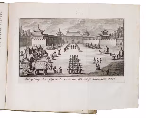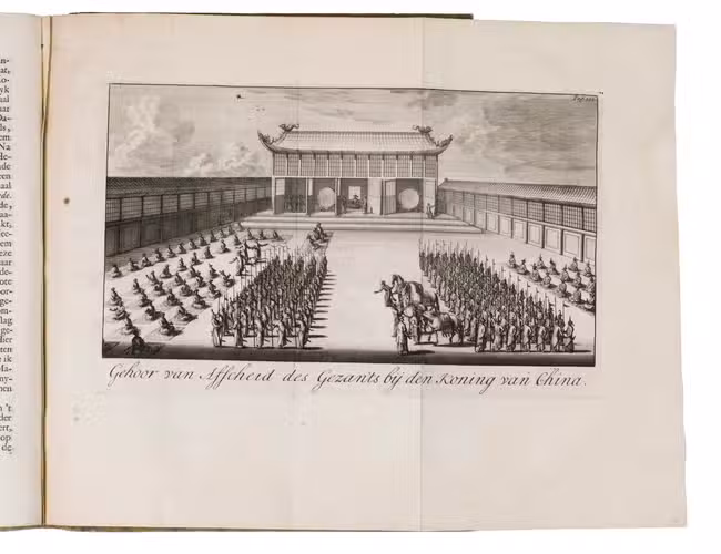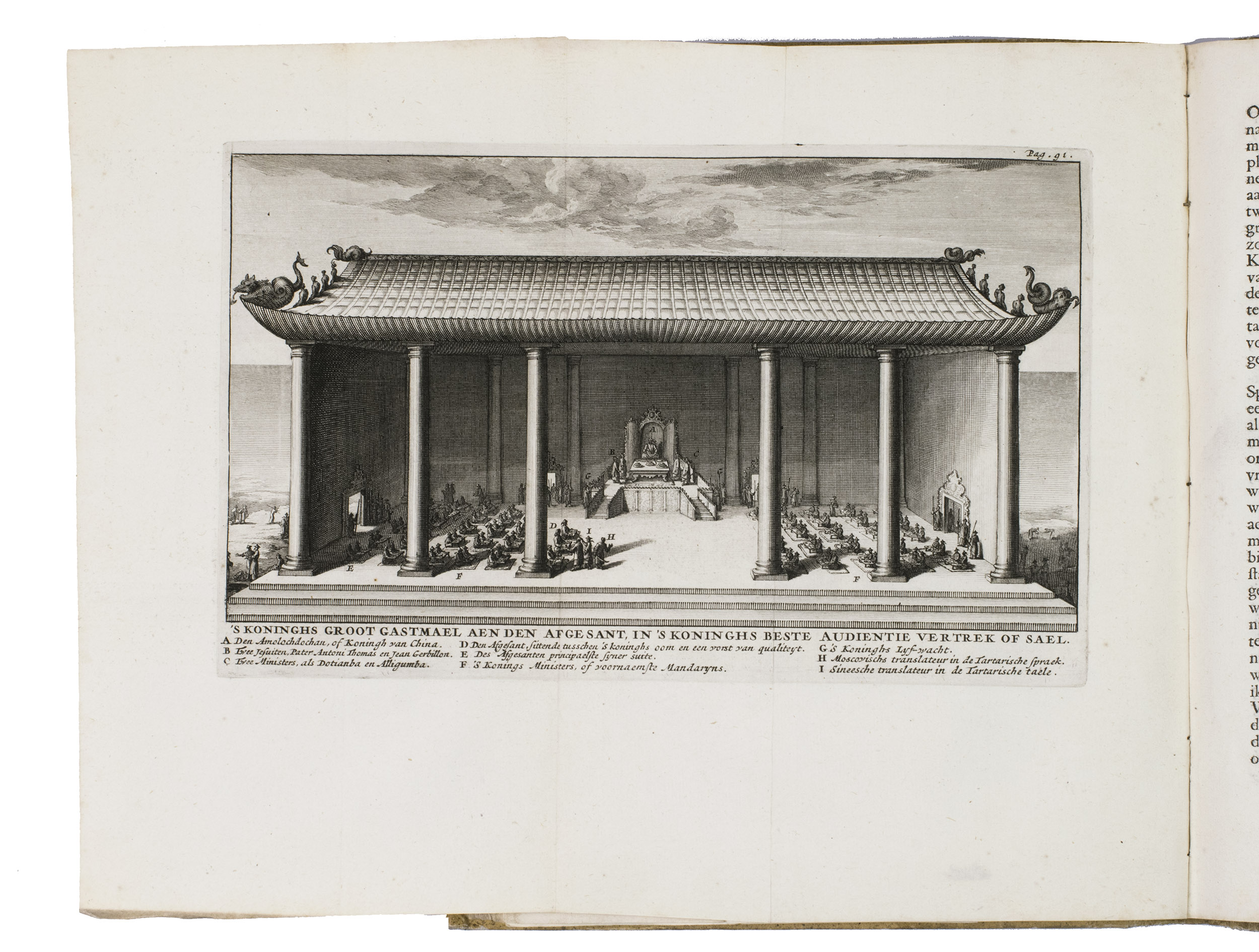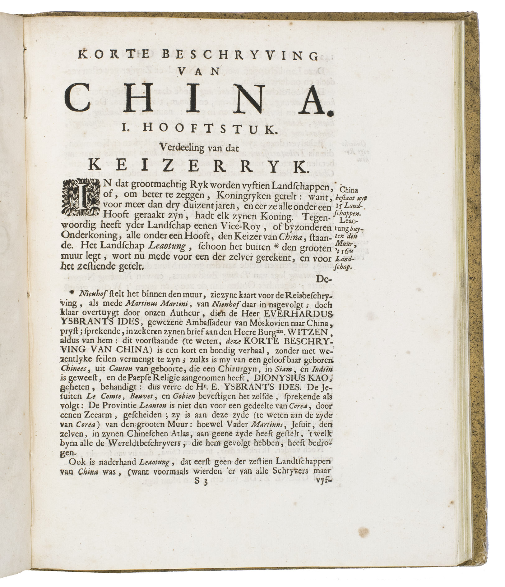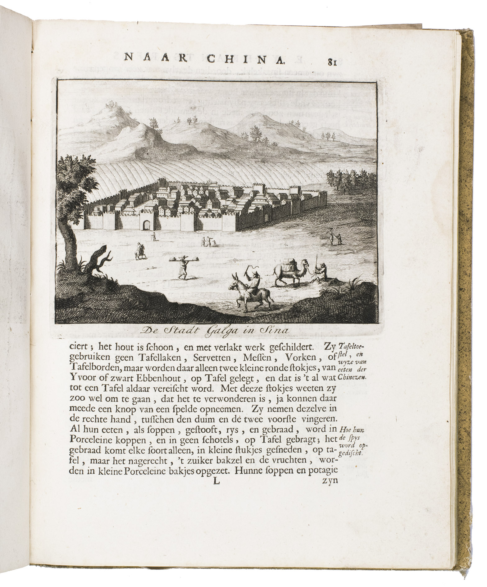 All engravings are very crisp and clear. The edges and corners of the boards are scuffed and the front and back are somewhat rubbed, showing the cardboard underneath. The end leaves, title-page, and blank recto of the frontispiece are foxed, without affecting the engraving, with a water stain in the top corner of the 4 leaves in signature ††, and on the outer half of pp. 231-end of the work. Otherwise in good condition. Catalogue de la section des Russica, I176; Cordier, Sinica, p. 2469; Howgego, vol. 1, 14; STCN 169912930 (11 copies); Tiele 519; WorldCat 902472370, 257635409, 561453661, 894528946, 65093708 (19 copies, including 7 also in STCN); cf. Adelung II, p. 385-388.
