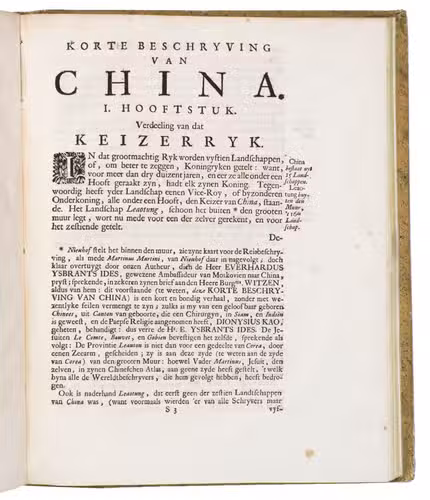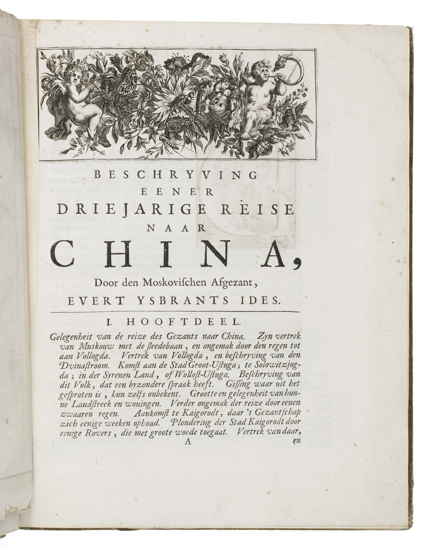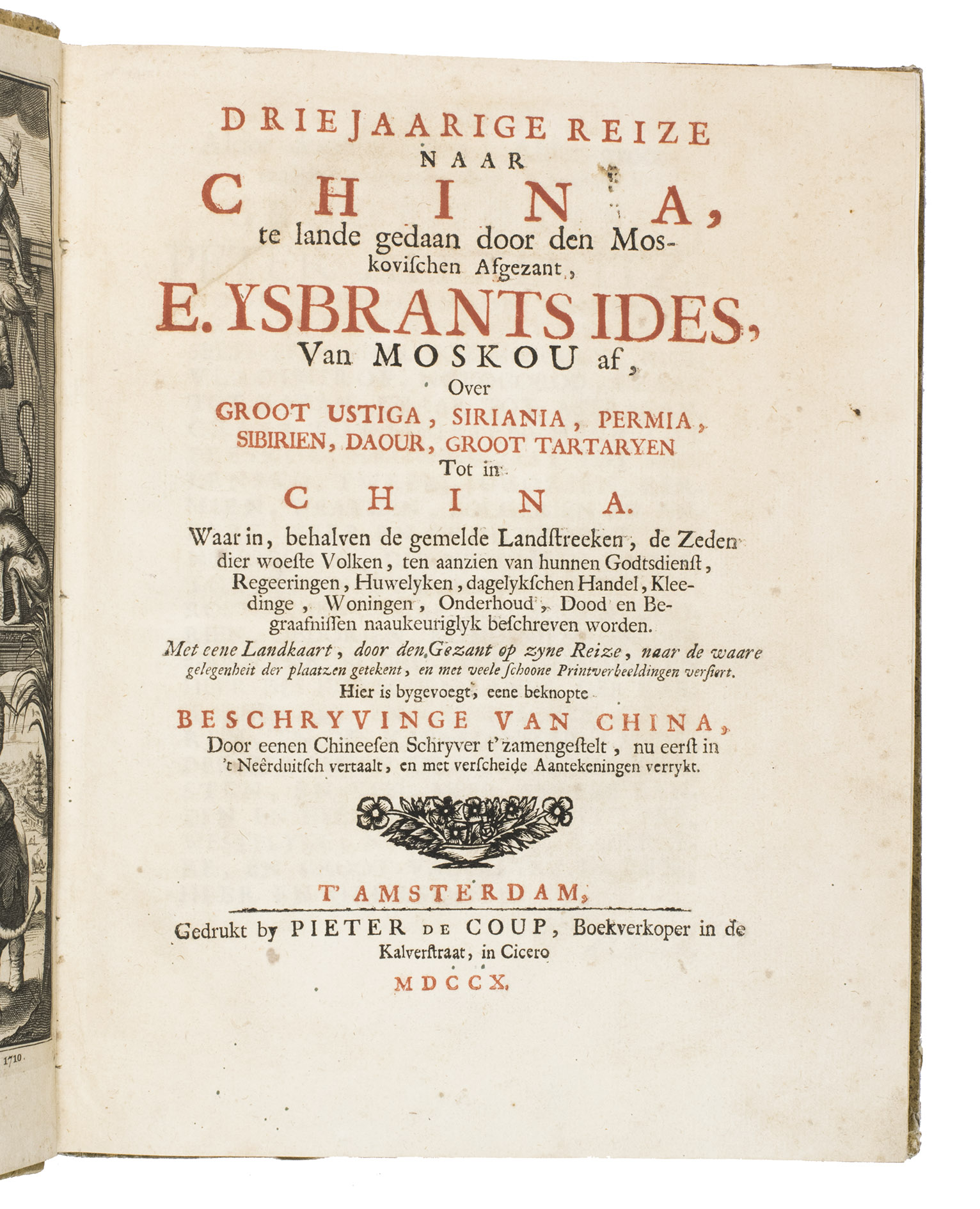Rare and richly illustrated work on the three-year journey (1692-1695) of a Russian envoy from Moscow to Beijing, in order to negotiate trade relations between Russia and China. The expedition was undertaken by a small group of people, led by the Danish merchant of Dutch descent and diplomat Evert Ysbrand Ides (1657-1708), in the service of Tsar Peter the Great (1672-1725). It greatly added to the geographical knowledge on Northern Manchuria and China. The present account provides one of the first Western descriptions of the Gobi Desert, the Dalai Lama & Buddhism, Lake Baikal, the Great Wall, Mongolia, the city of Beijing, Guangzhou, Siberia, and the customs of the Siberian people.
