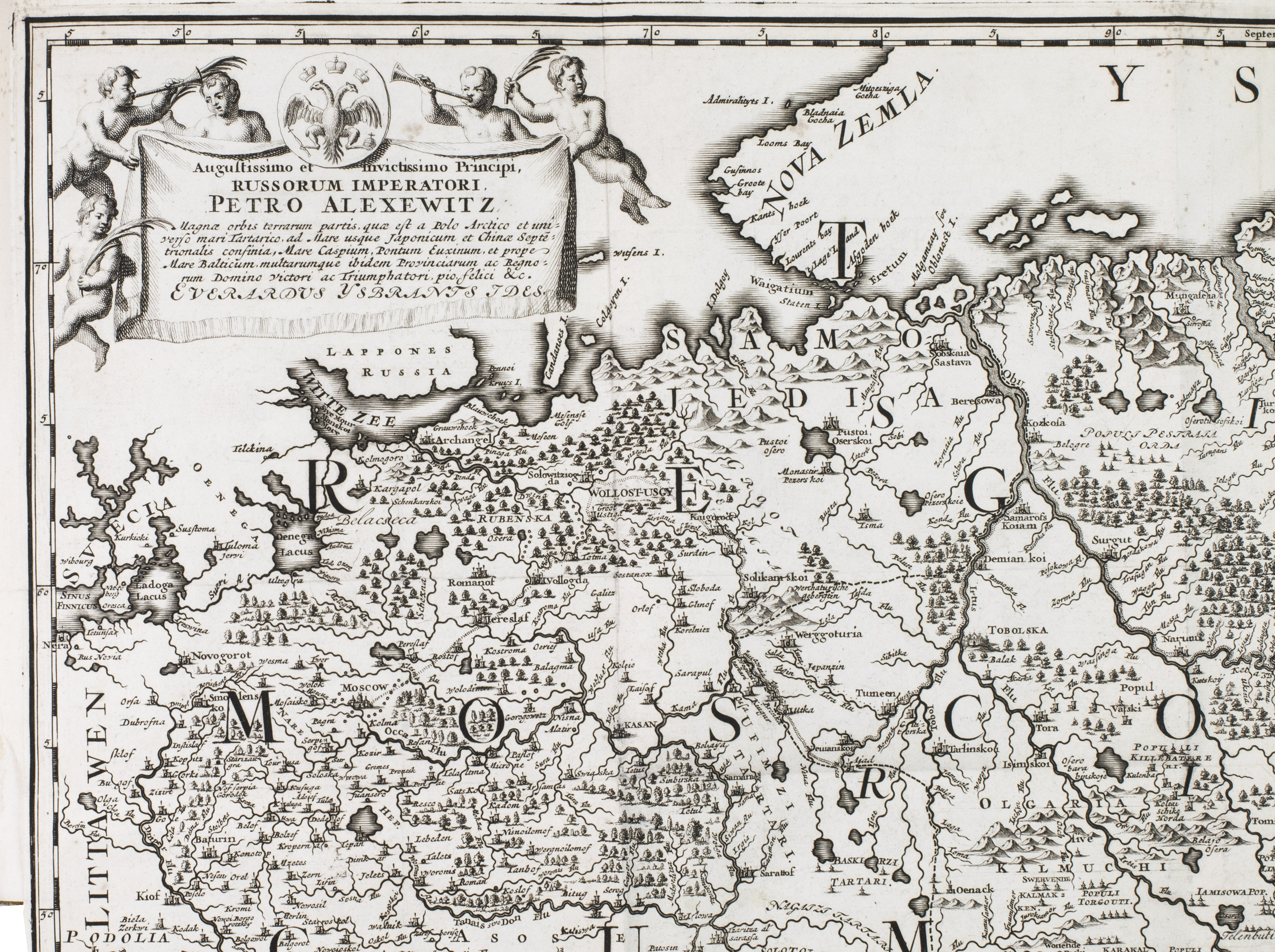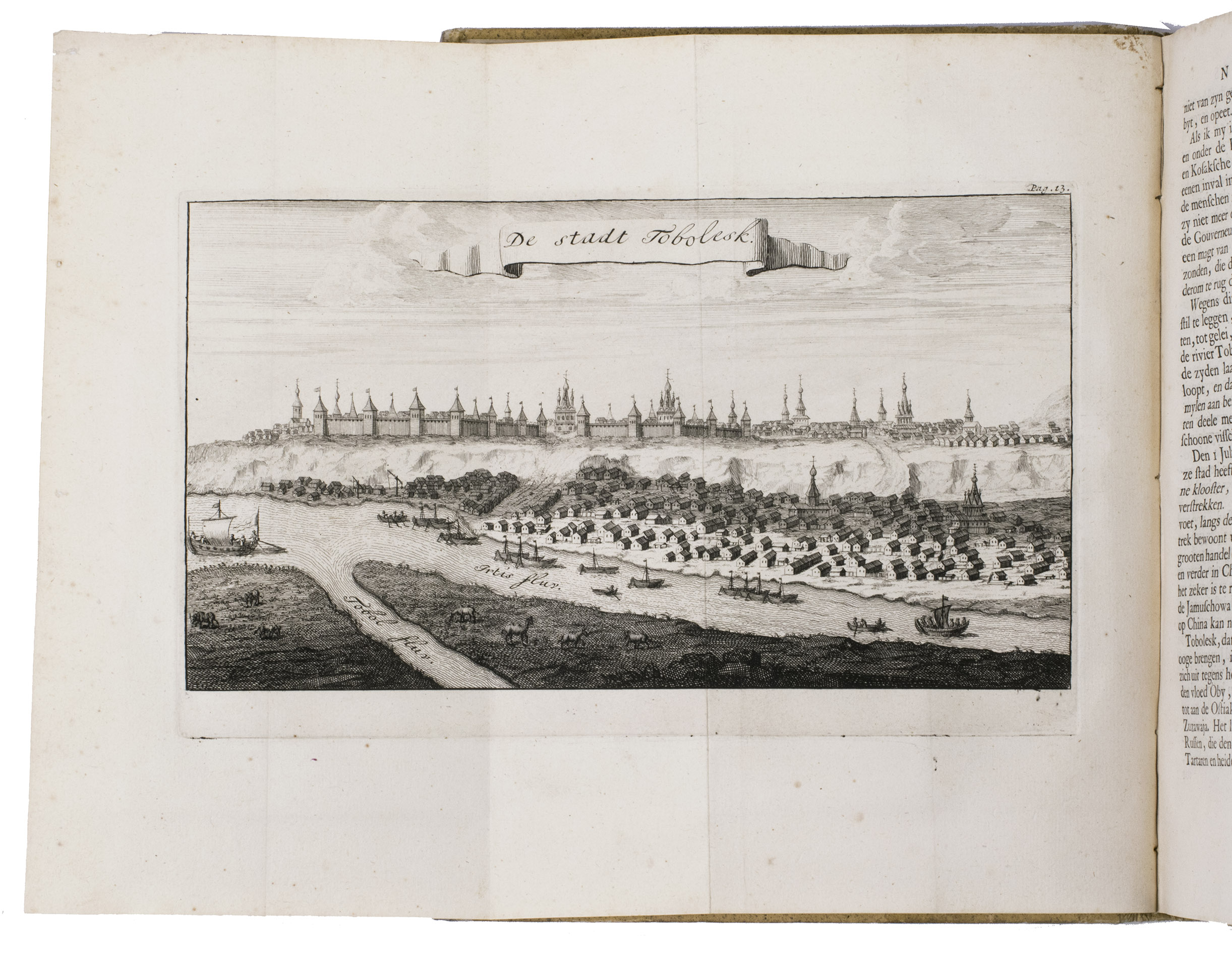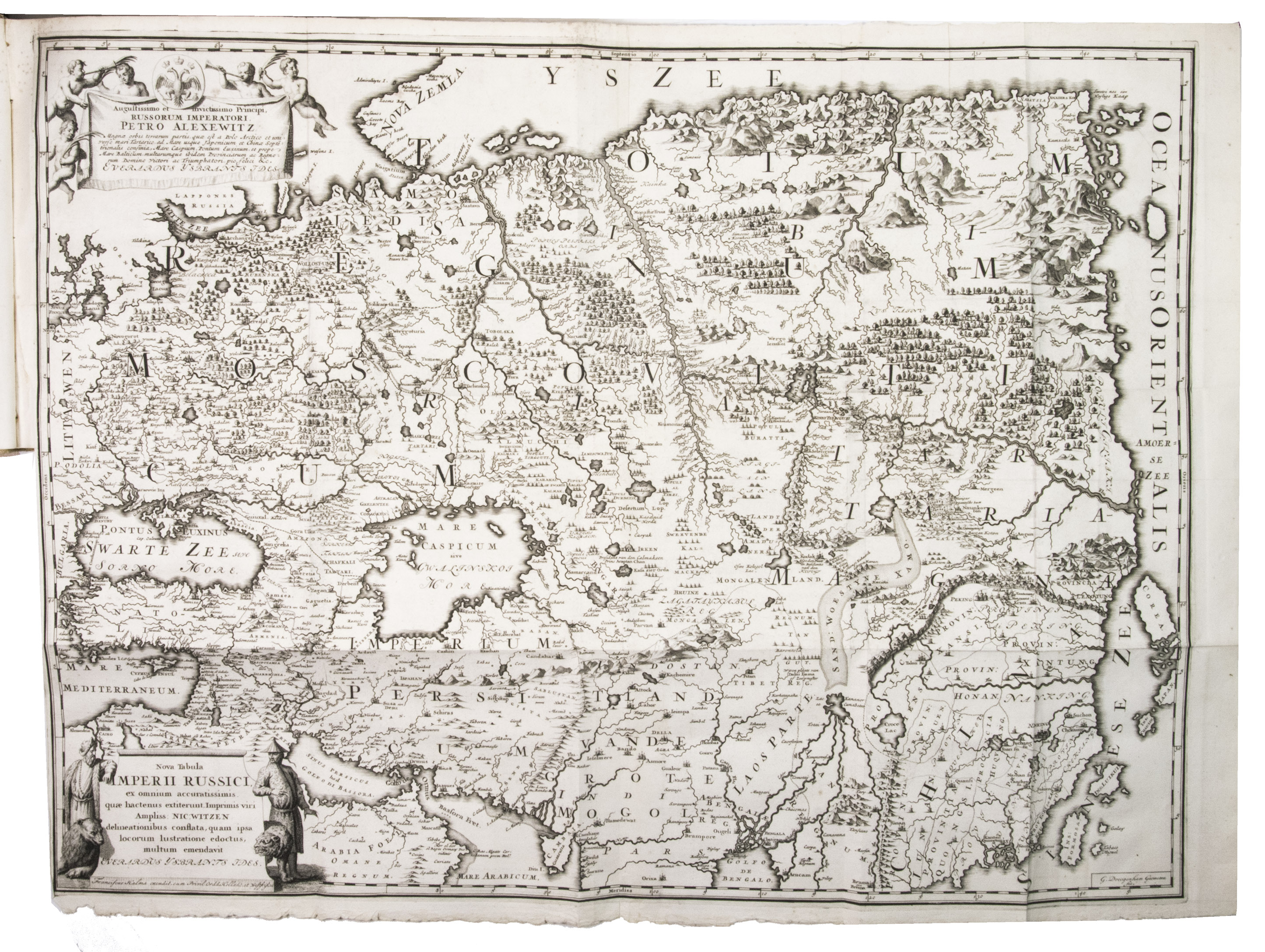 Amsterdam, Pieter de Coup, 1710. 4to. With an engraved title-page bound as a frontispiece before the typographical title-page, which is printed in red and black, a large folding map of Russia and parts of Asia, 8 folding engraved plates of cities and other views, 1 full-page engraving, and 21 half-page engravings in the text. Further with woodcut and engraved decorated initials, a large engraved head-piece at the start of the main text, 2 woodcut floral tail-pieces, and a small woodcut floral vignette on the typographical title-page. 19th-century gold-tooled light brown splattered paper with a red title-label on the spine. [30], 243, [4], [1 blank] pp.