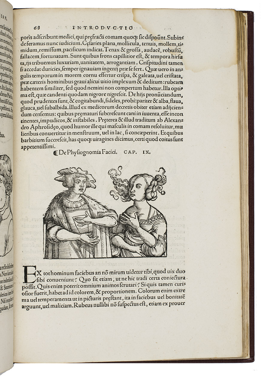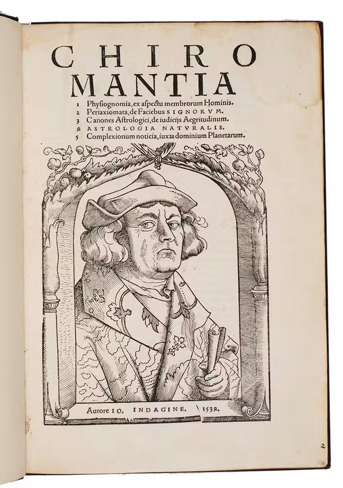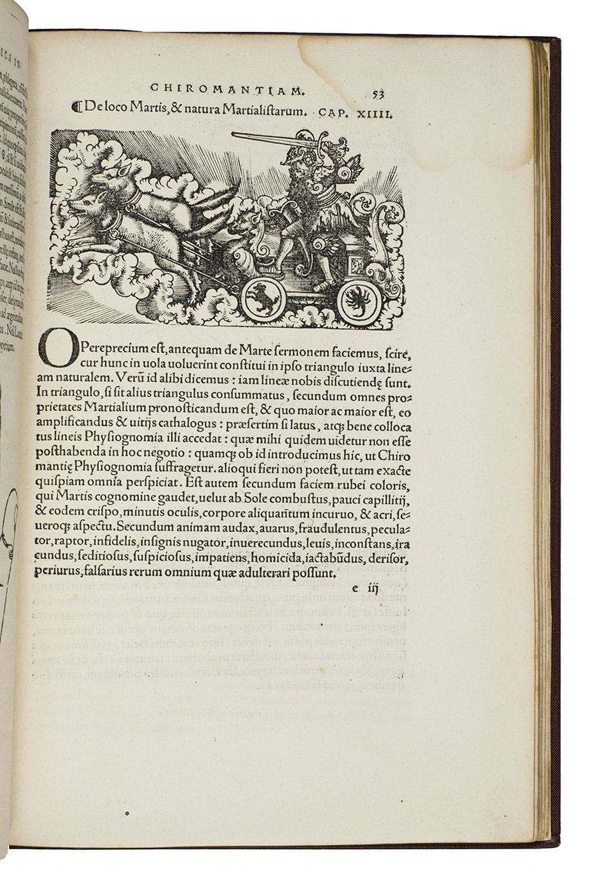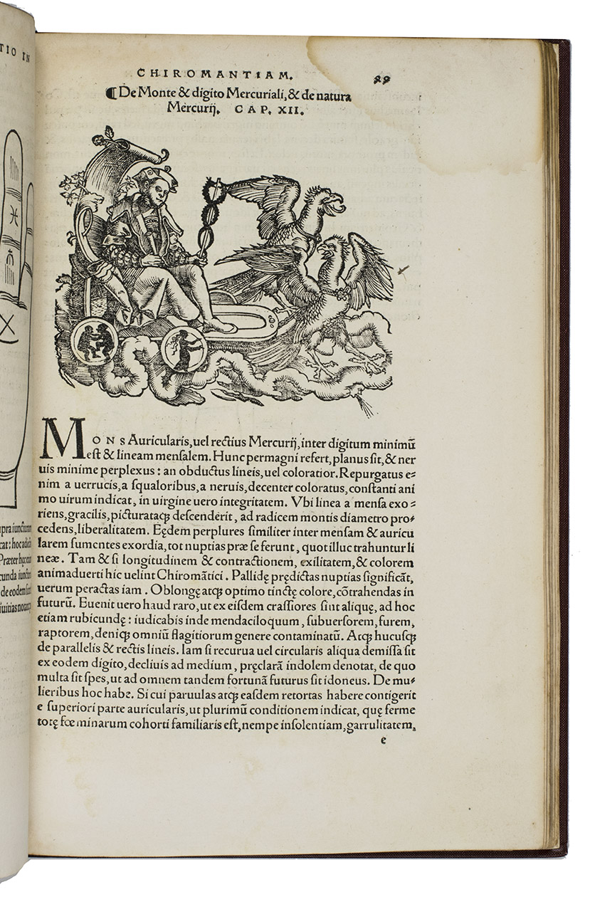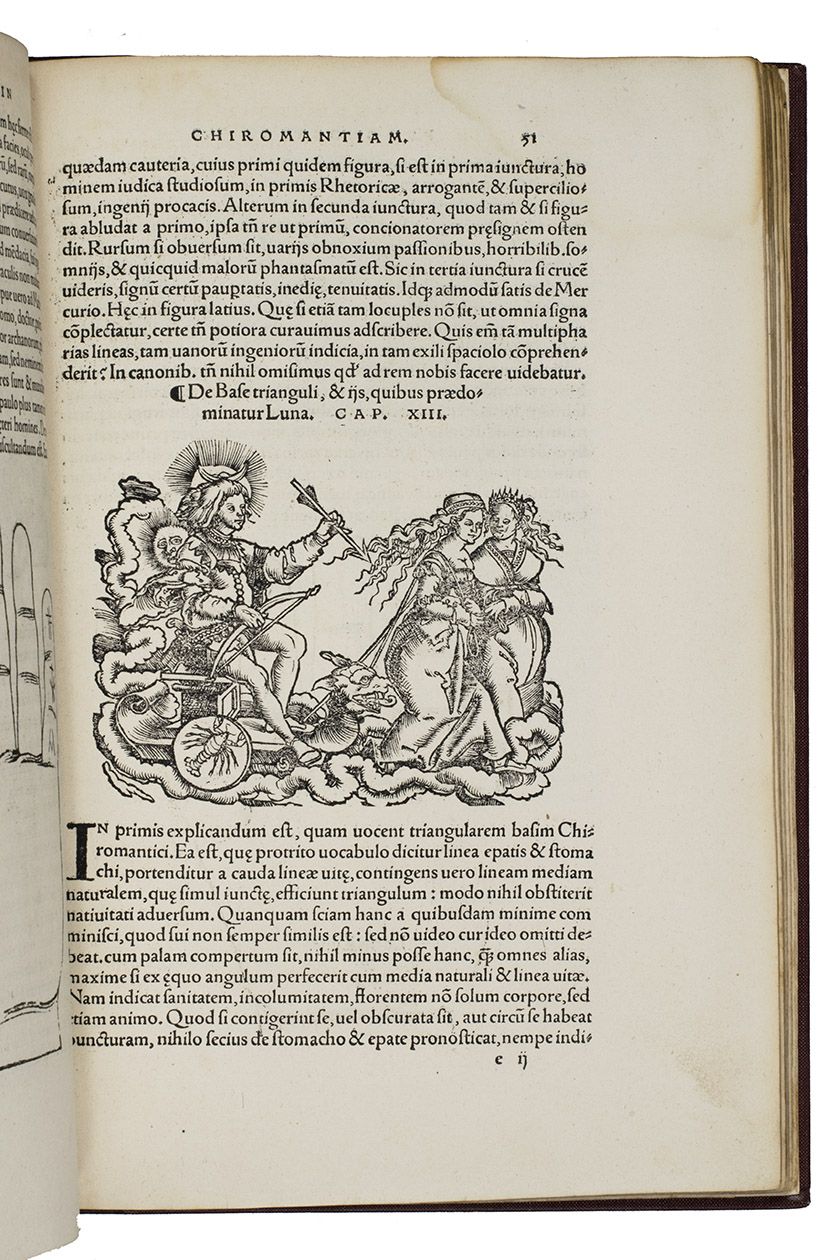 Rare third edition in the original Latin, printed with the woodblocks of the first (1522) edition by the same publisher, of a classic account of palm reading, physiognomy (determining personality from facial features and the shape of the head) and several aspects of astrology, including horoscopes and the effect of the sun, moon and planets on health and on the temperaments associated with the four humours. The text is divided into six "libri", but the first is unnumbered on the title page so that it numbers the others 1-5. The woodcuts (including the author's portrait and coat-of-arms) were executed for the first edition and some have been attributed to Hans Baldung Grien and Hans Wechtlin. They include six fantastic chariots carrying male and female figures representing the moon and the five planets pulled by a variety of birds, a basilisk or cockatrice, wolves and a pair of women, with zodiac signs on the wheels. While Ratdolt had published woodcuts of the sun, moon and planets riding chariots in 1491, the present woodcuts are much more sophisticated and probably inspired the ca. 1568 engraved series by Maarten van Heemskerck (New Hollstein 546-552).