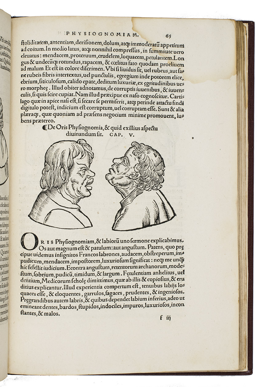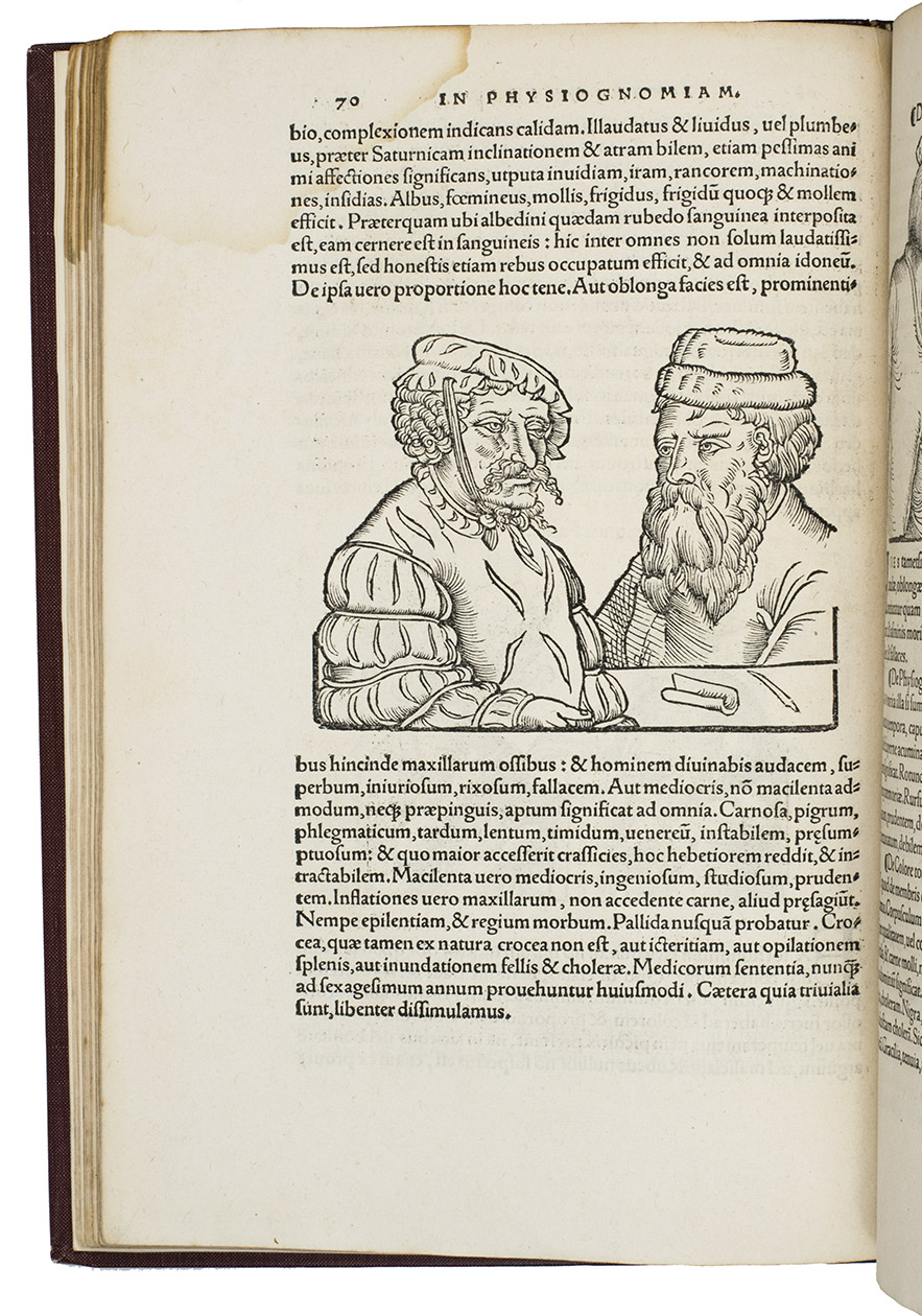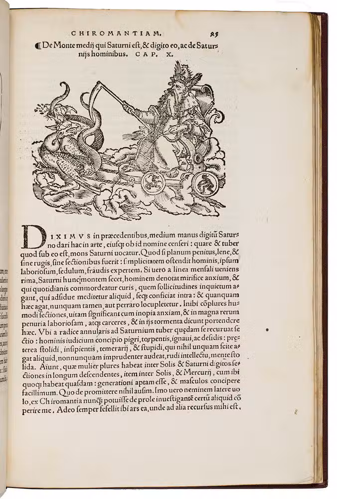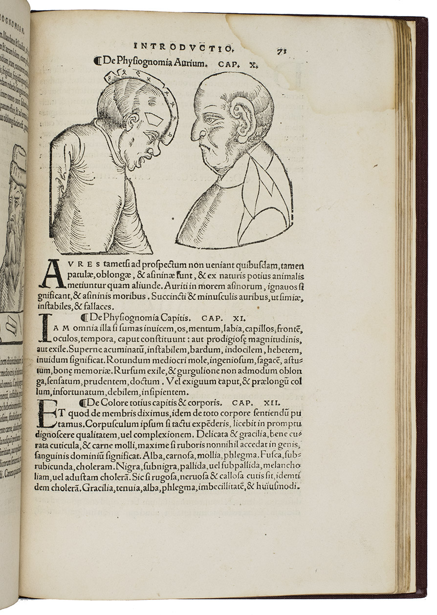 Rare third edition in the original Latin, printed with the woodblocks of the first (1522) edition by the same publisher, of a classic account of palm reading, physiognomy (determining personality from facial features and the shape of the head) and several aspects of astrology, including horoscopes and the effect of the sun, moon and planets on health and on the temperaments associated with the four humours. The text is divided into six "libri", but the first is unnumbered on the title page so that it numbers the others 1-5. The woodcuts (including the author's portrait and coat-of-arms) were executed for the first edition and some have been attributed to Hans Baldung Grien and Hans Wechtlin. They include six fantastic chariots carrying male and female figures representing the moon and the five planets pulled by a variety of birds, a basilisk or cockatrice, wolves and a pair of women, with zodiac signs on the wheels. While Ratdolt had published woodcuts of the sun, moon and planets riding chariots in 1491, the present woodcuts are much more sophisticated and probably inspired the ca. 1568 engraved series by Maarten van Heemskerck (New Hollstein 546-552).
