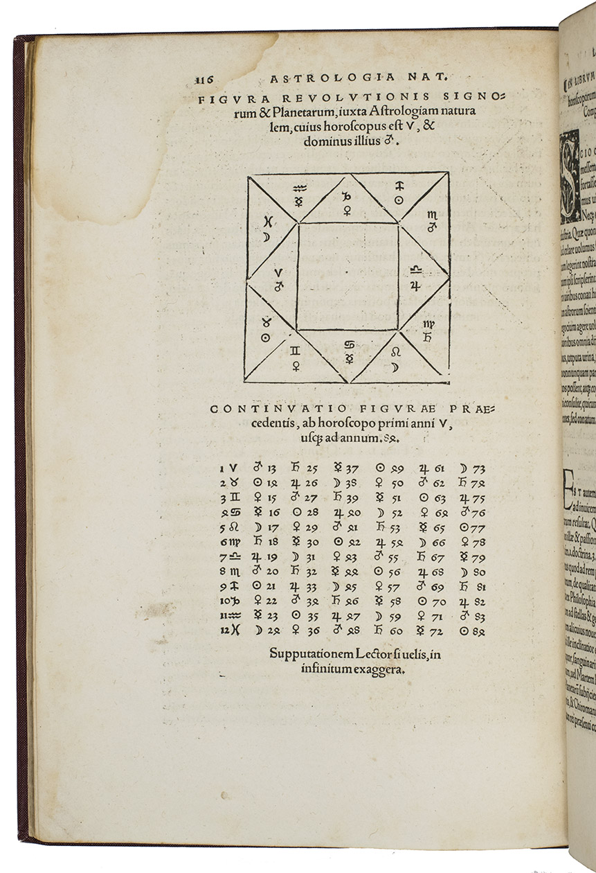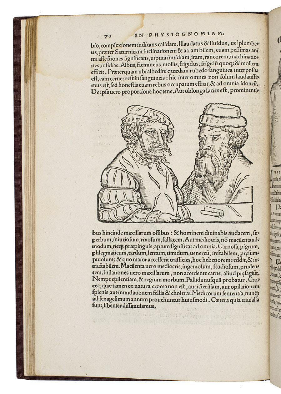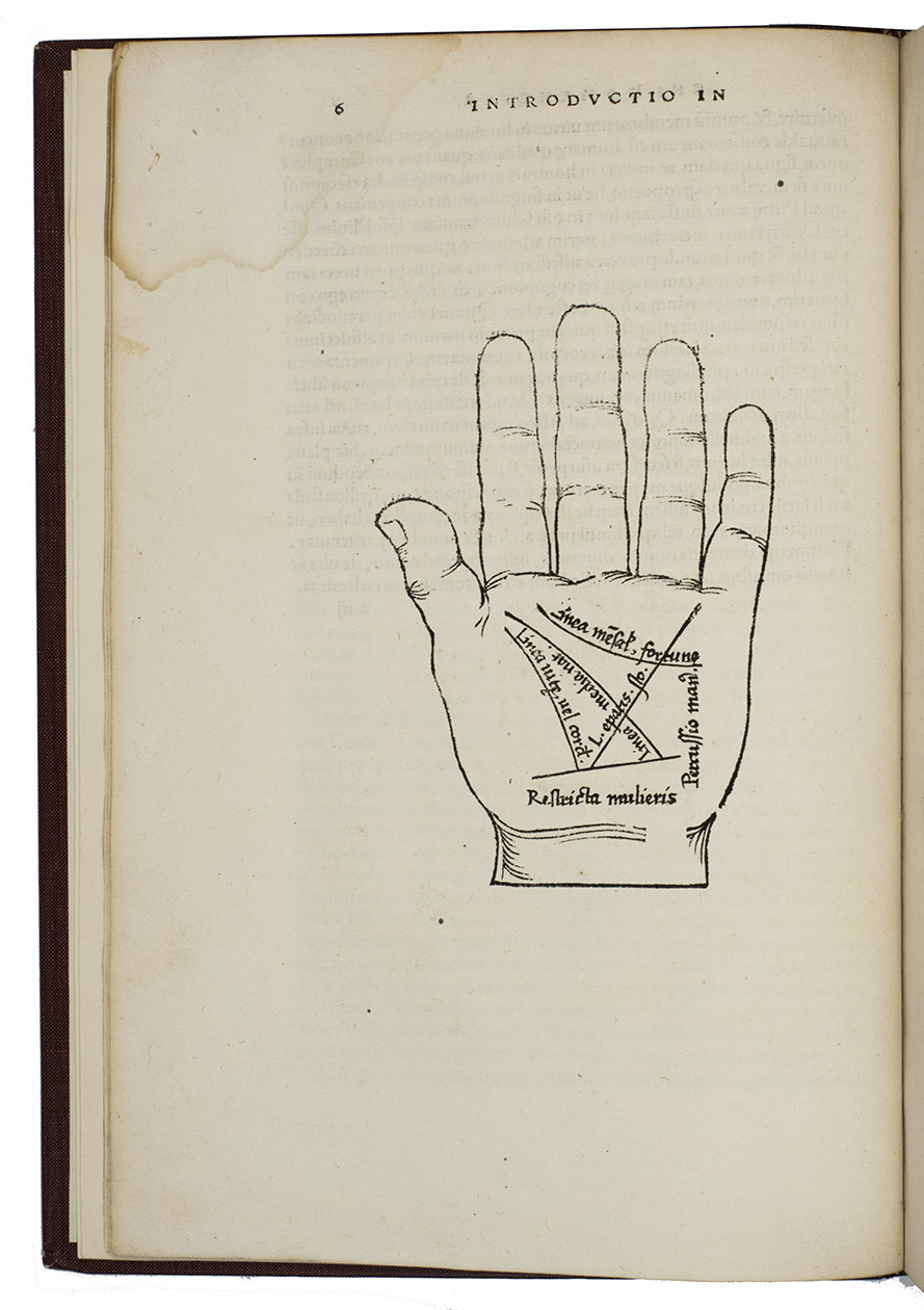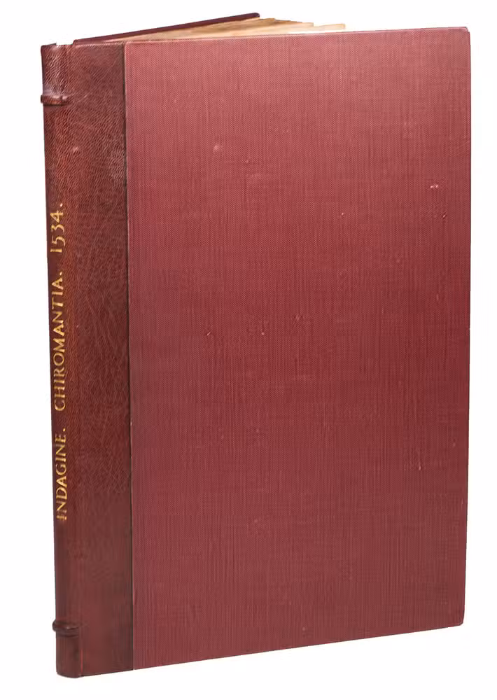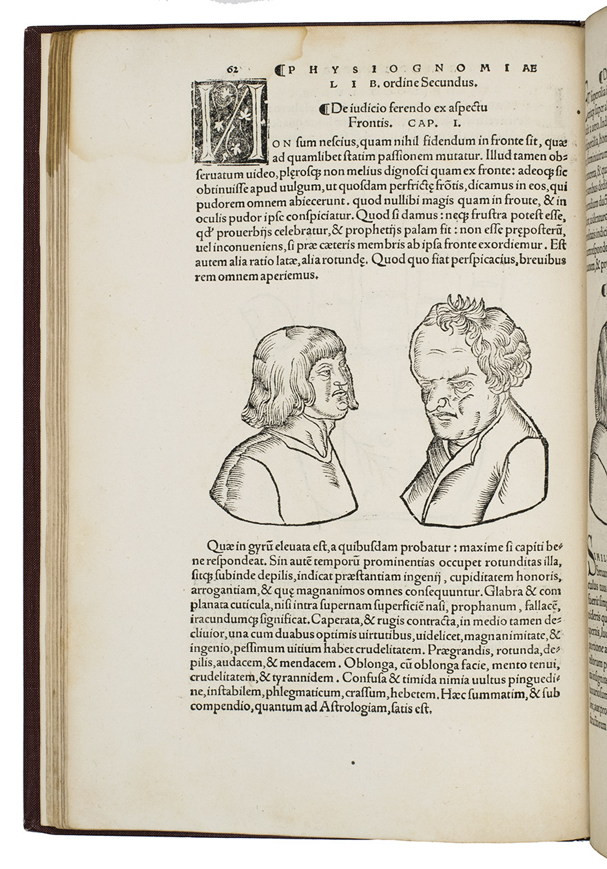 Rare third edition in the original Latin, printed with the woodblocks of the first (1522) edition by the same publisher, of a classic account of palm reading, physiognomy (determining personality from facial features and the shape of the head) and several aspects of astrology, including horoscopes and the effect of the sun, moon and planets on health and on the temperaments associated with the four humours. The text is divided into six "libri", but the first is unnumbered on the title page so that it numbers the others 1-5. The woodcuts (including the author's portrait and coat-of-arms) were executed for the first edition and some have been attributed to Hans Baldung Grien and Hans Wechtlin. They include six fantastic chariots carrying male and female figures representing the moon and the five planets pulled by a variety of birds, a basilisk or cockatrice, wolves and a pair of women, with zodiac signs on the wheels. While Ratdolt had published woodcuts of the sun, moon and planets riding chariots in 1491, the present woodcuts are much more sophisticated and probably inspired the ca. 1568 engraved series by Maarten van Heemskerck (New Hollstein 546-552).
