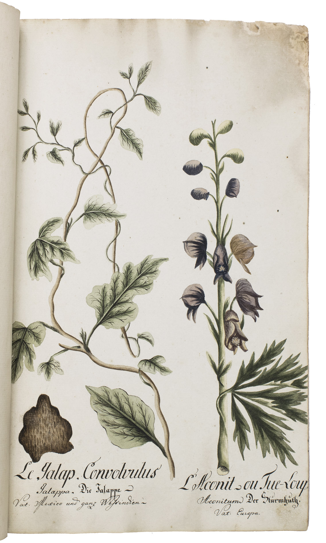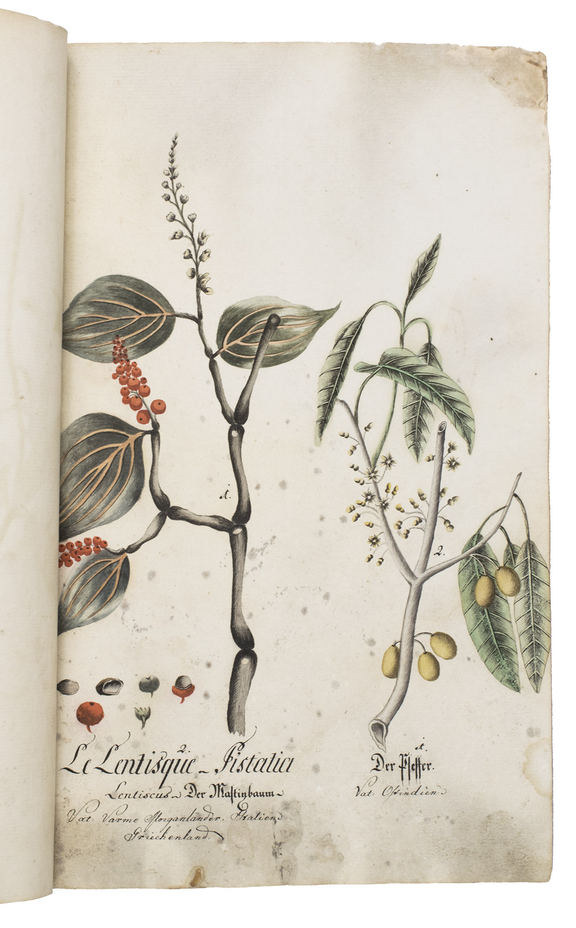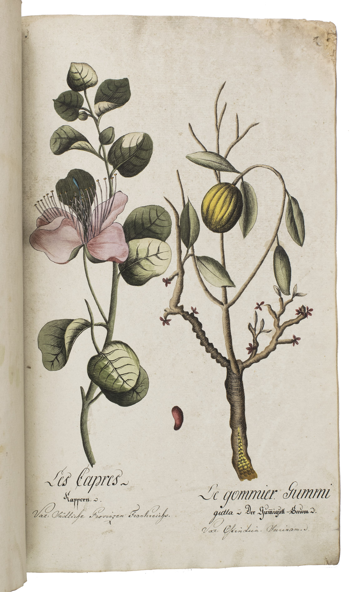 Collection of high quality drawings of plants and trees by the physician Adam Johann Ingruber, who graduated from the faculty of Medicine of the University of Pest in 1803. The 18 leaves of drawings mostly show two species of plants or trees (each with captions in French, Latin and German at the foot), the last two show silkworms, bees, a rattlesnake and a scorpion. Most species are from Asia, South America, Africa and the southern part of Europe.