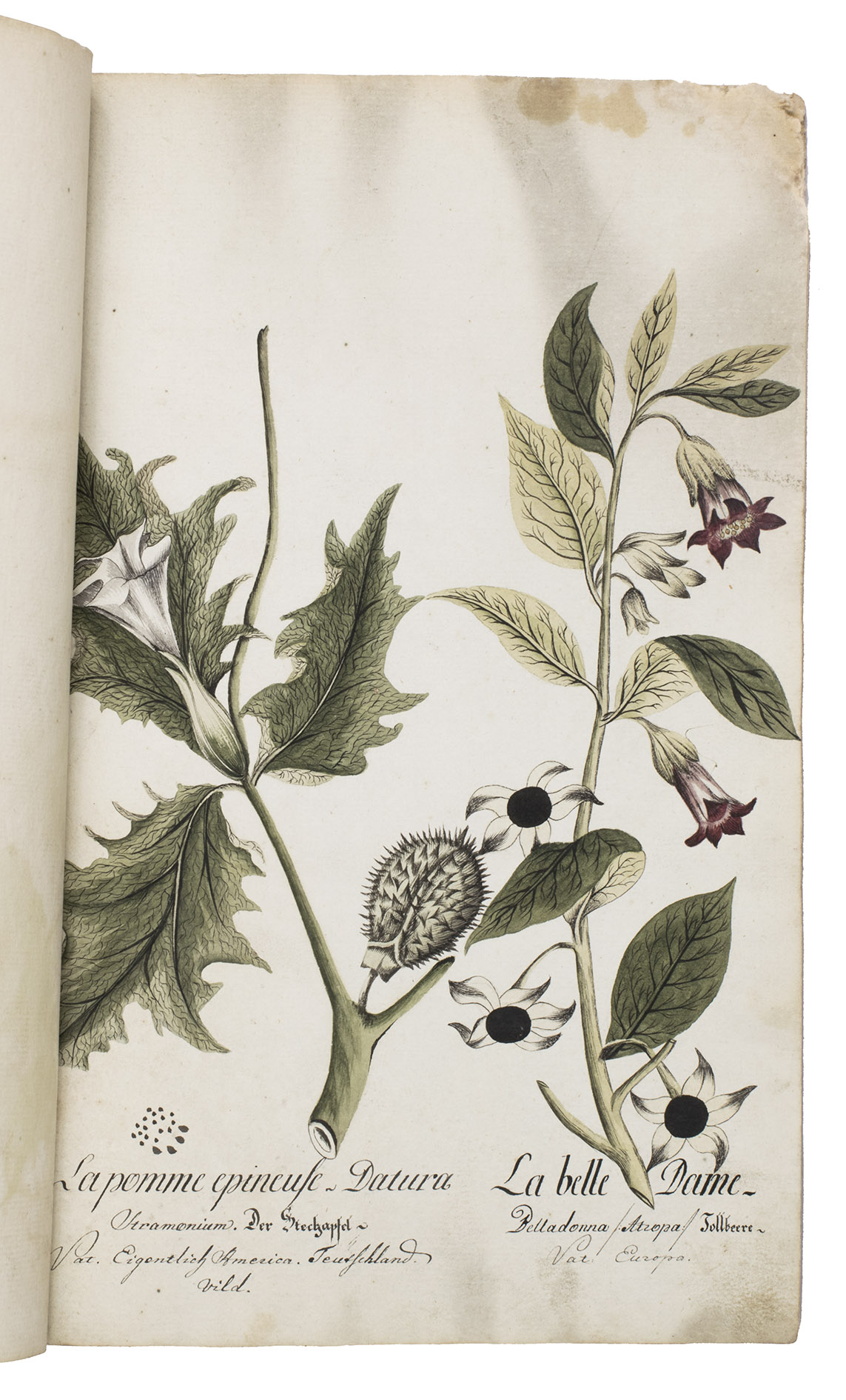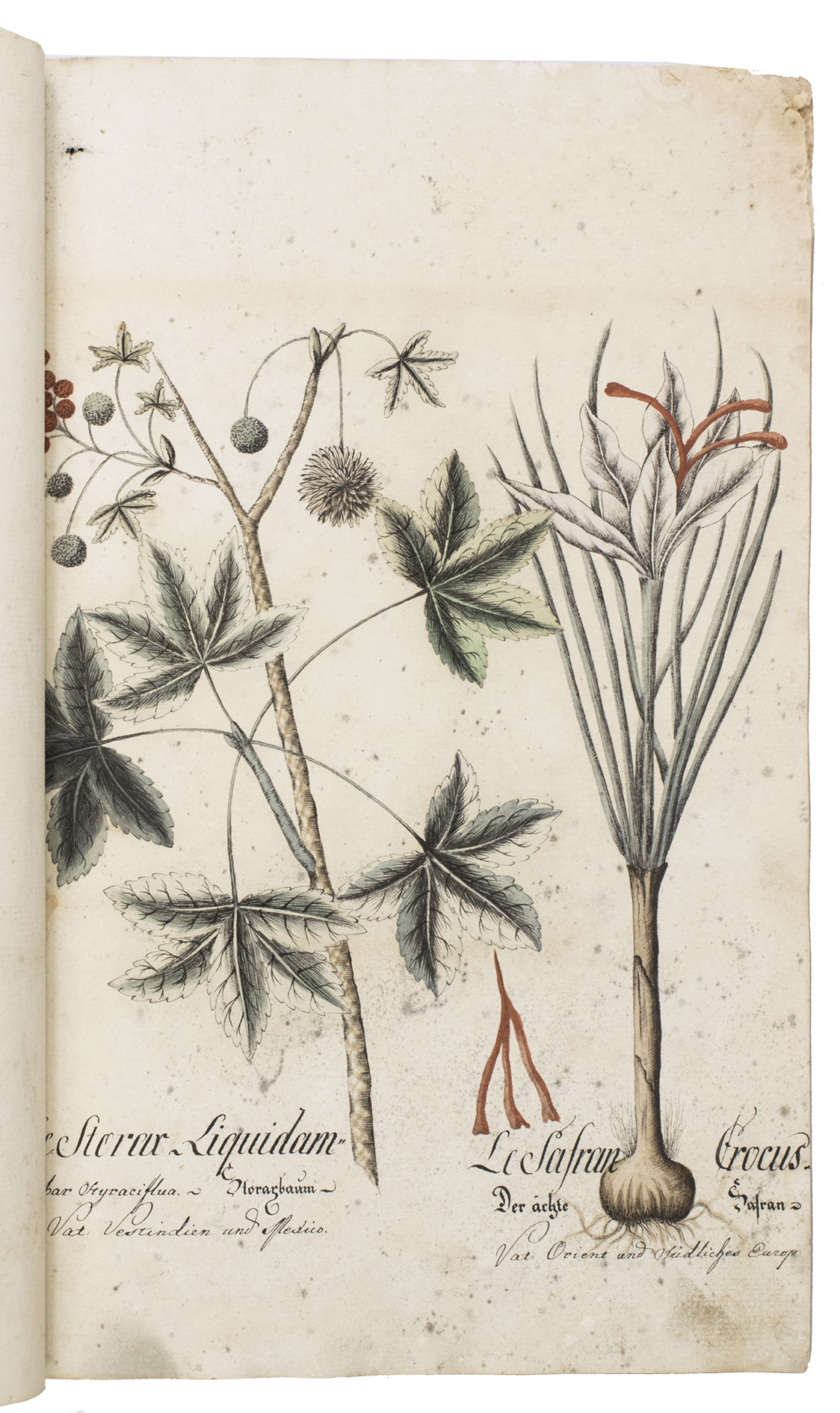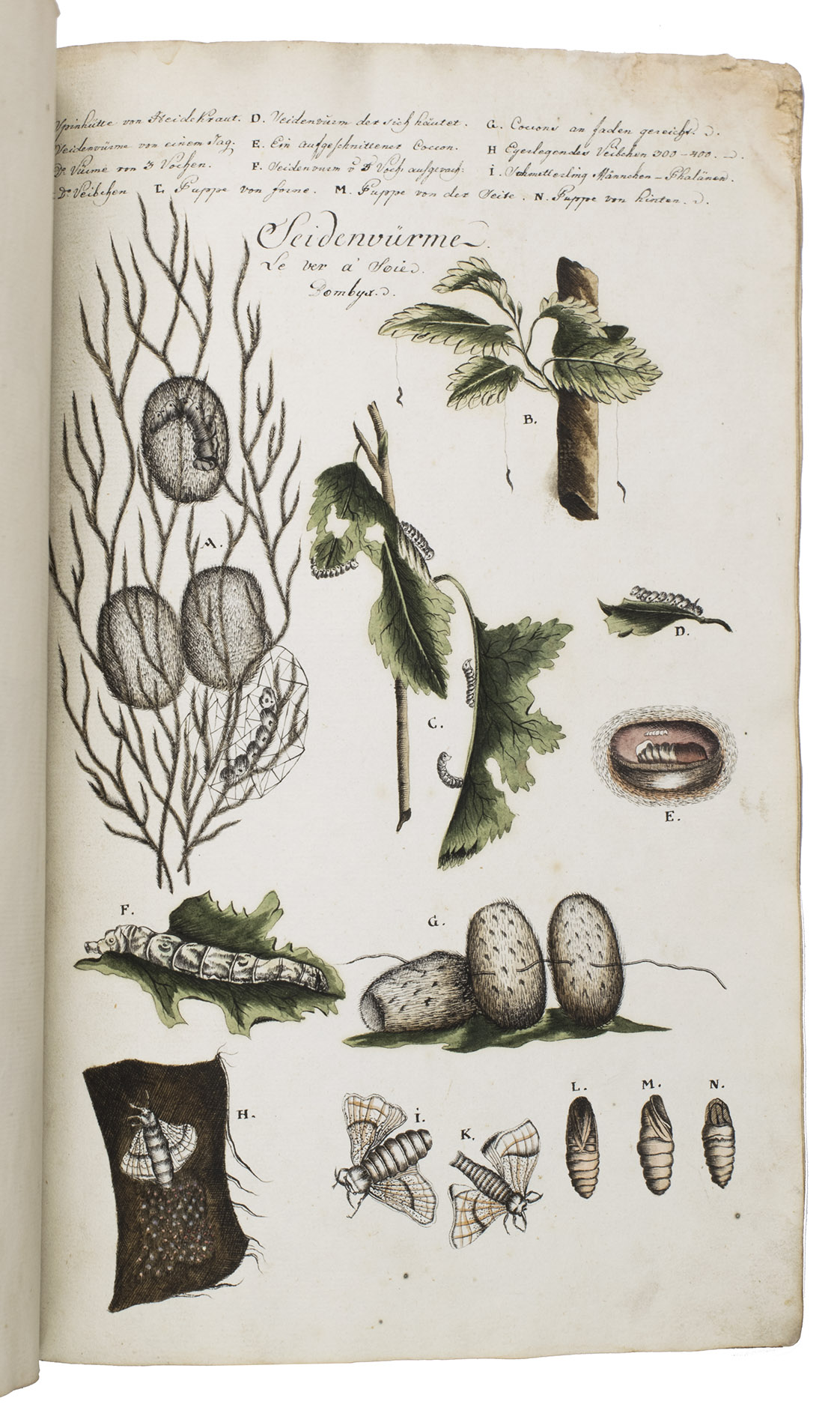 Collection of high quality drawings of plants and trees by the physician Adam Johann Ingruber, who graduated from the faculty of Medicine of the University of Pest in 1803. The 18 leaves of drawings mostly show two species of plants or trees (each with captions in French, Latin and German at the foot), the last two show silkworms, bees, a rattlesnake and a scorpion. Most species are from Asia, South America, Africa and the southern part of Europe.