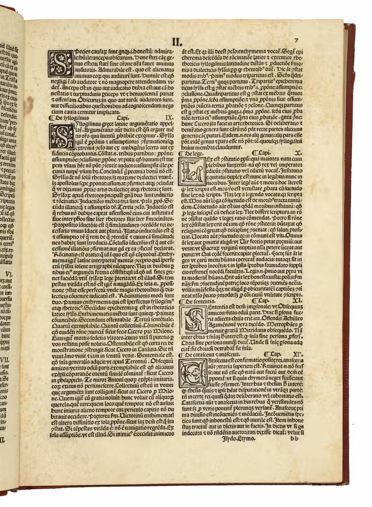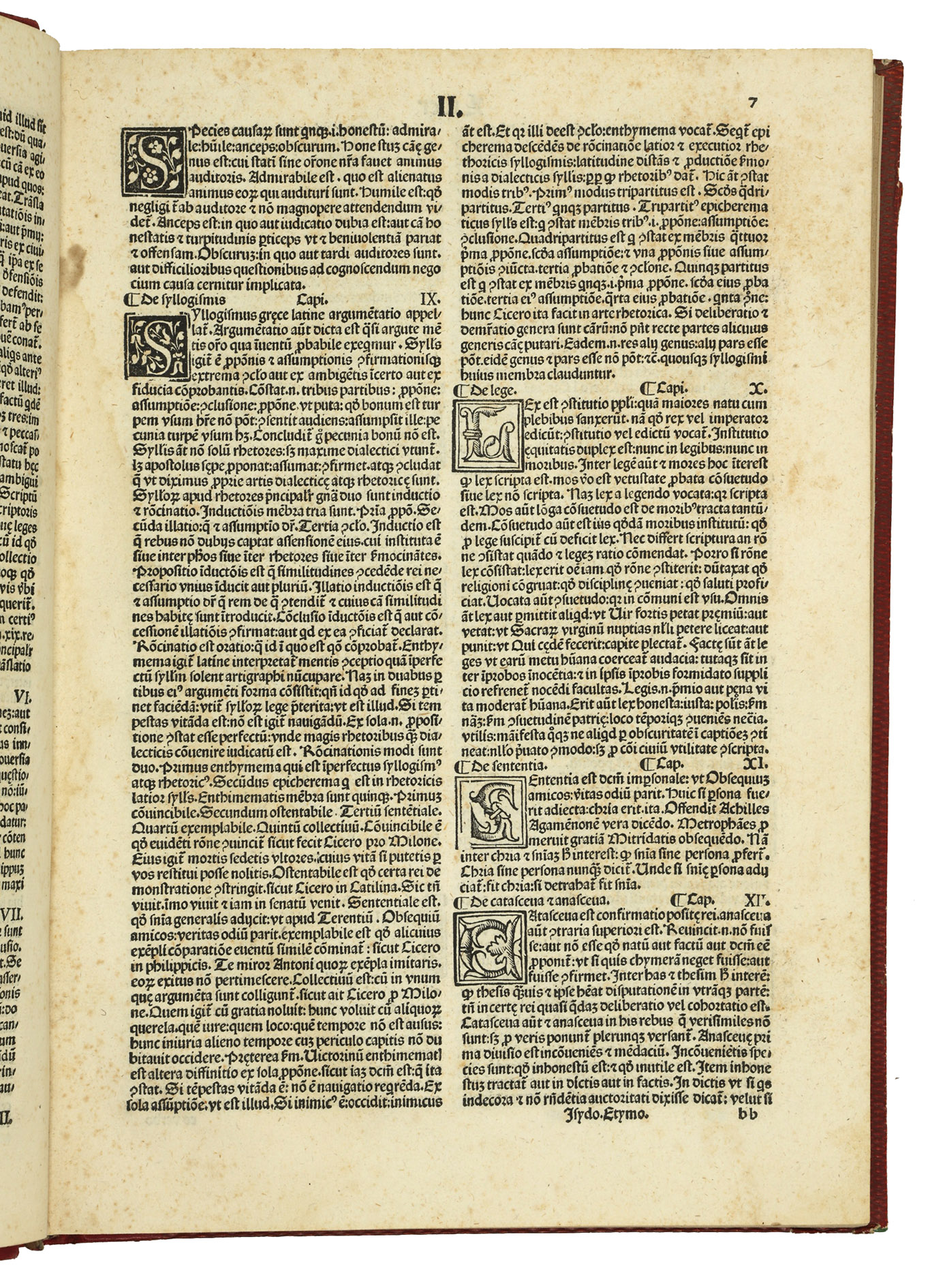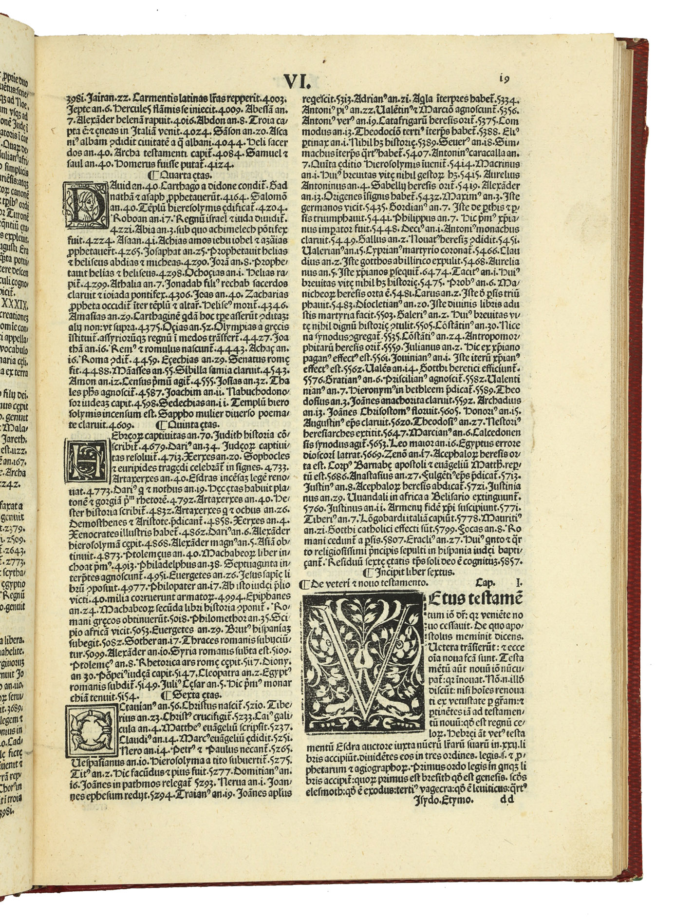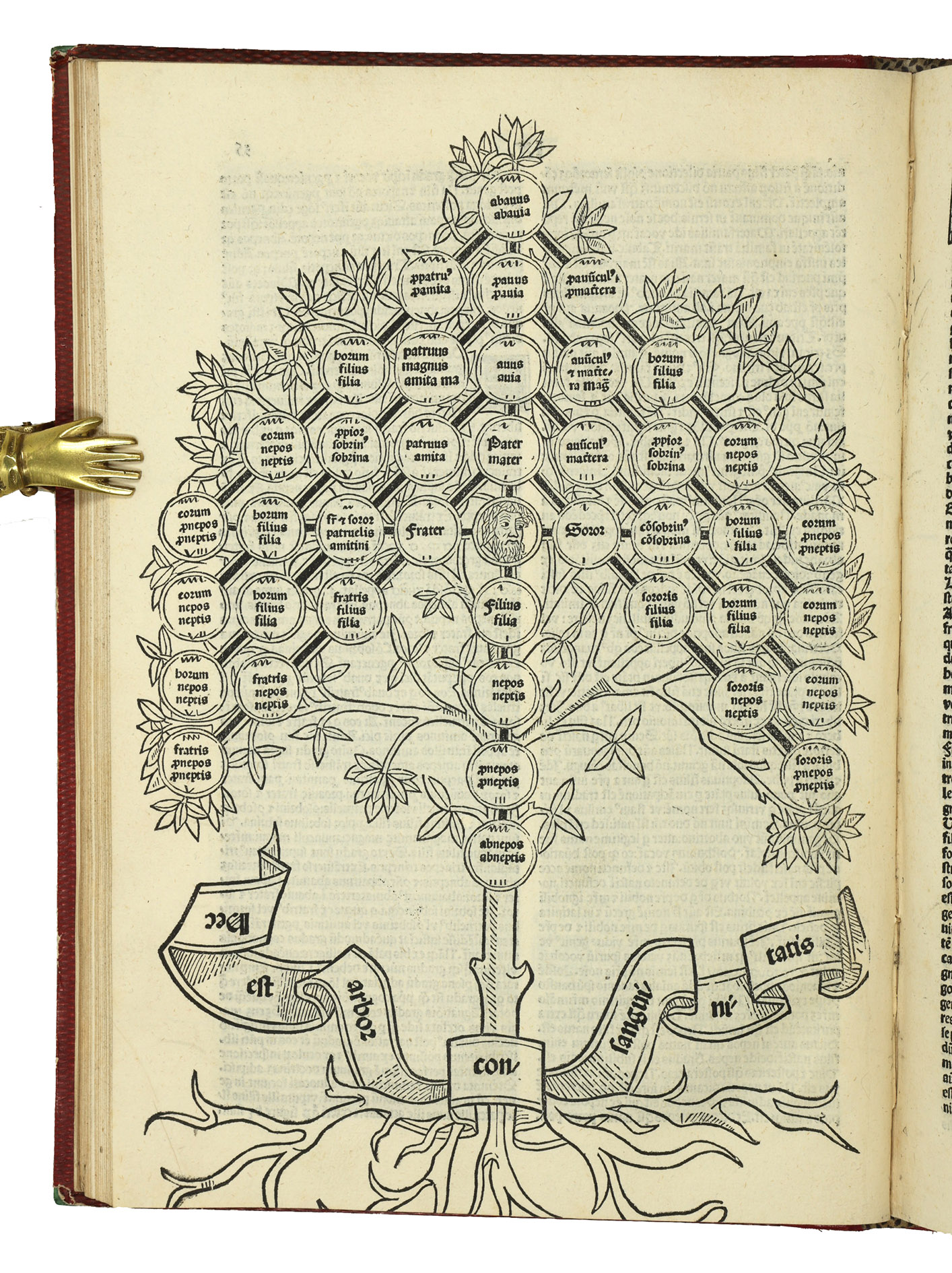 [Venice, Bonetus Locatellus for O. Scotus, ca. 1500]. Folio (29.5 x 21 cm). The text is set in gothic type. With 1 full-page woodcut in the text (a family tree), several smaller woodcuts in the text, including a world map, and numerous woodcut decorated initials. Late 19th century red half calf, with the title lettered in gold on the spine. "75" [= 77], [1], 21 ll.