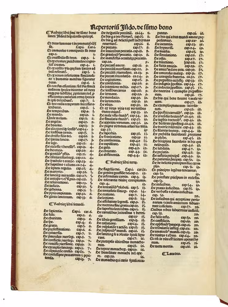 "An investigation of the principal terms employed in all branches of knoledge. Chapters 15 to 23 of book 3 deal exclusively with music, which is defined there as 'the skill [peritia]of modulation consisting of tone and song' [...] The statement most widely quoted by later writers on music is perhaps: 'Music moves the feelings and changes the emotions' (iii, 17) [...] Isidore's writing on numerous subjects influenced a broad range of writers and thinkers throughout the Middle Ages" (New Grove IX, 340).