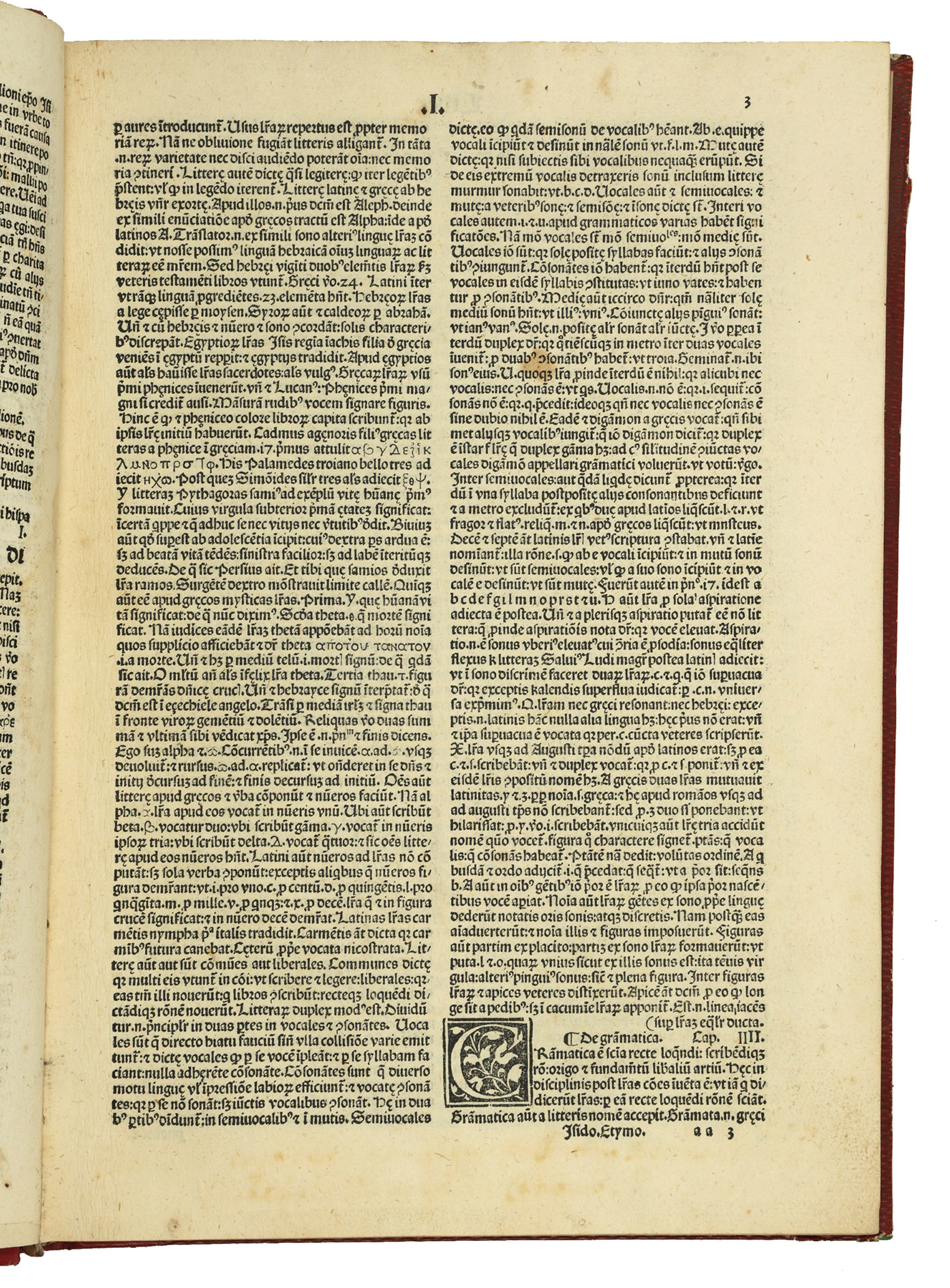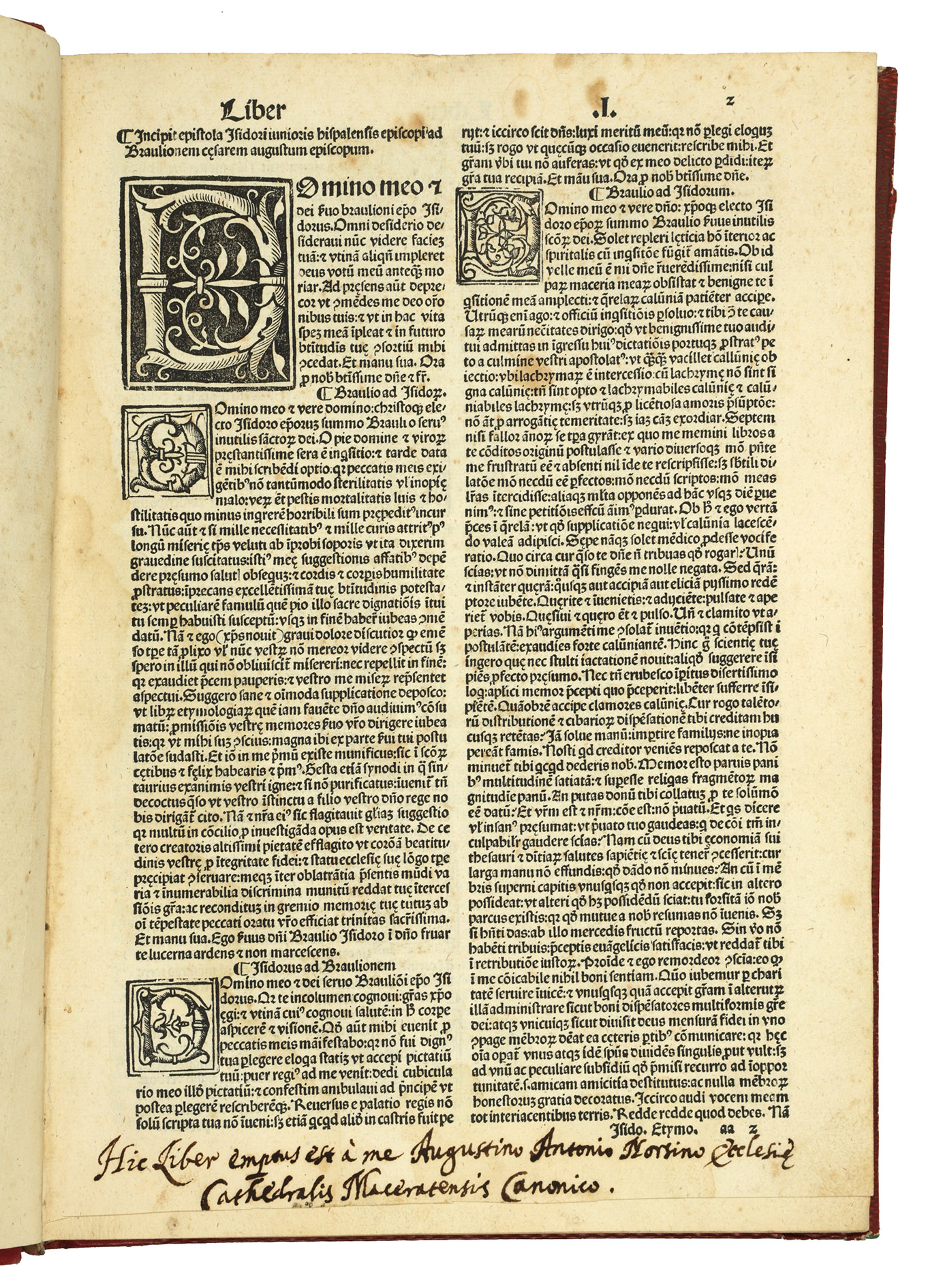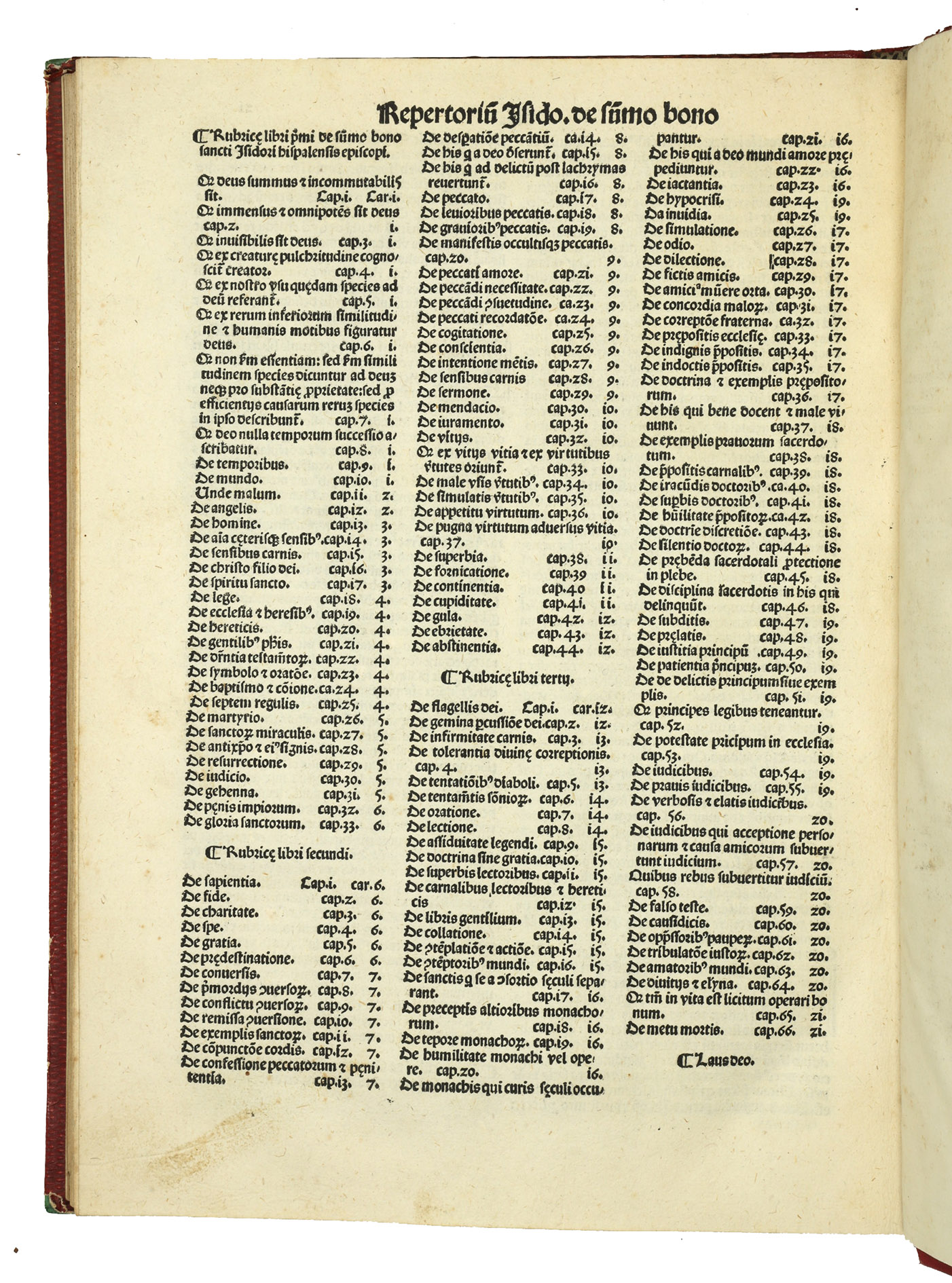 Second Locatellus edition for Scotus, first published by Zainer in Augsburg in 1472. This famous encyclopedic work presents the sum of then-contemporary knowledge on all branches of science: mathematics, arithmetics, geometry, astronomy, medicine, geography, music, etc. The woodcuts include a full-page tree of consanguinity (fol. 35v) and a variant of the famous T-O map (fol. 51r; cf. Shirley no. 1 and plate 2): a horizontal bar made up of the rivers Don ("Tanais fluvius"), Nile ("Nilus fluvius"), and Sea of Azov ("Meotides paludes"), separates Asia from Europe and Africa. The Mediterranean ("Mare magnum"), which separates Europe and Africa, appears asa vertical radial bar, forming a "T" together with the horizontal bodies of water.