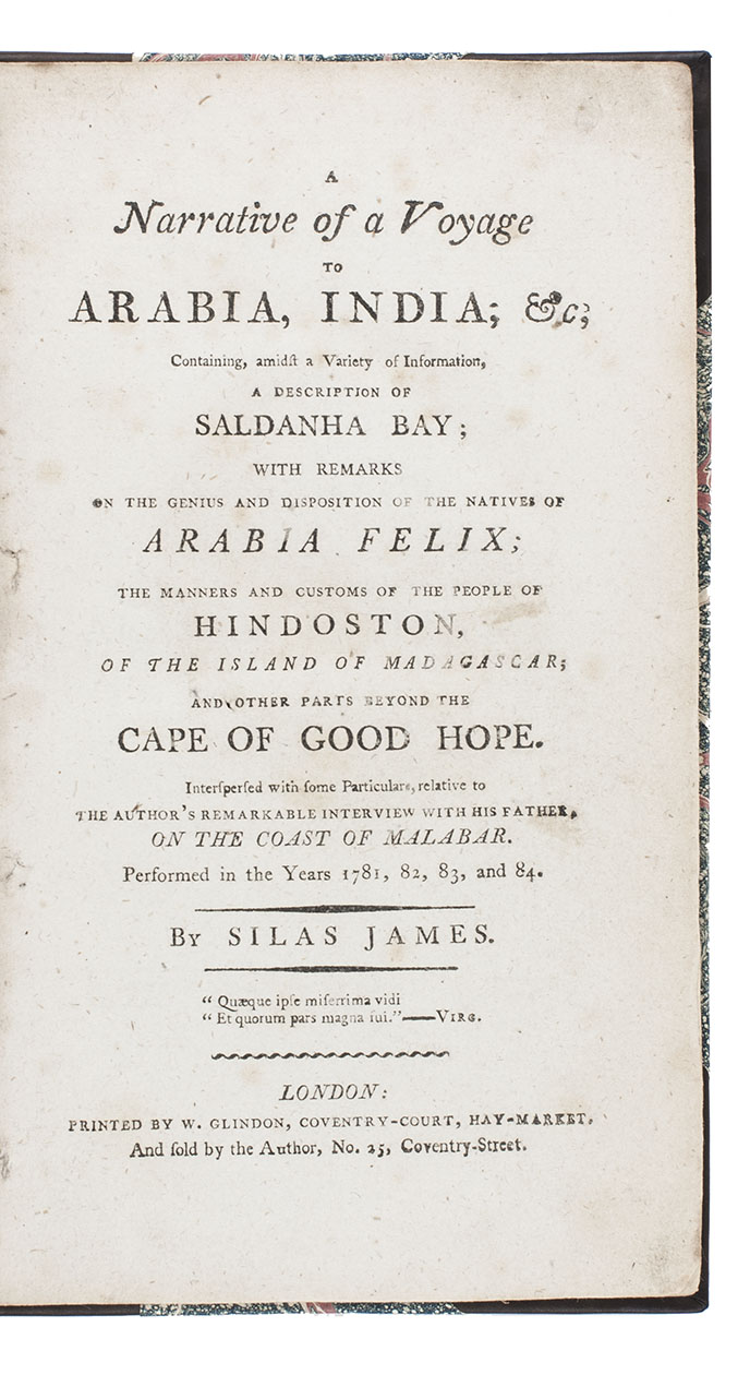 First edition, second issue (with a cancel title-page and an added list of about 160 subscribers) of a young man's detailed account of his adventures as a teenage member of the crew of a British transport ship in the years 1780 to 1784. He gives accounts of people, customs, food, animals and events in the places he visits, first the Cape, then up the African coast to the Arabian peninsula and on to Bombay (Mumbai) where he found his father, deserted his ship and lived royally for more than a year before he was captured and returned to his ship. On the return voyage he gives an account of Madagascar. He also gives a lively view of the rough and tumble day to day life on board the ship and of the cruelties of some captains.