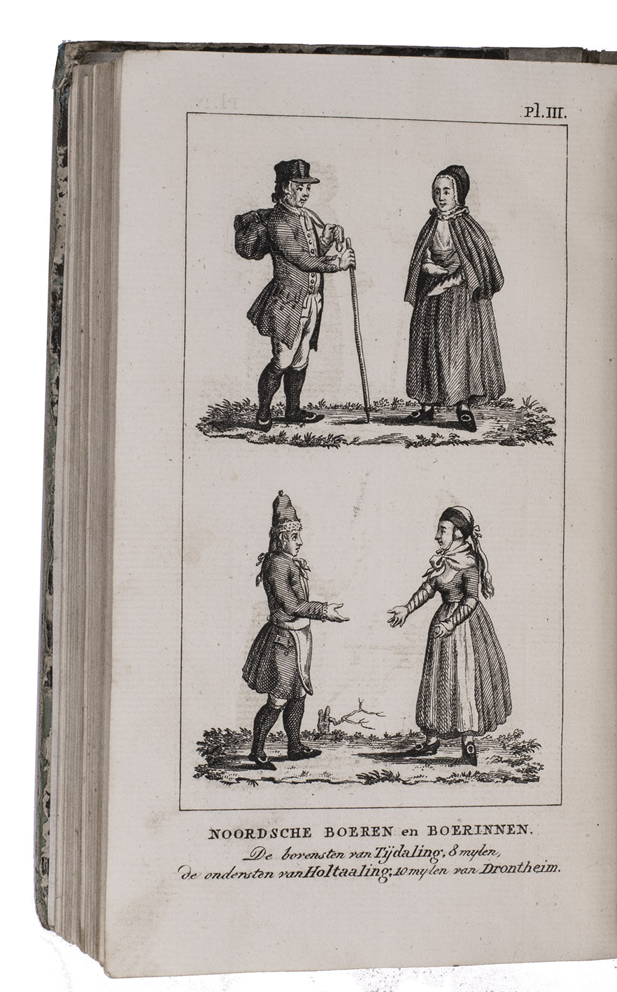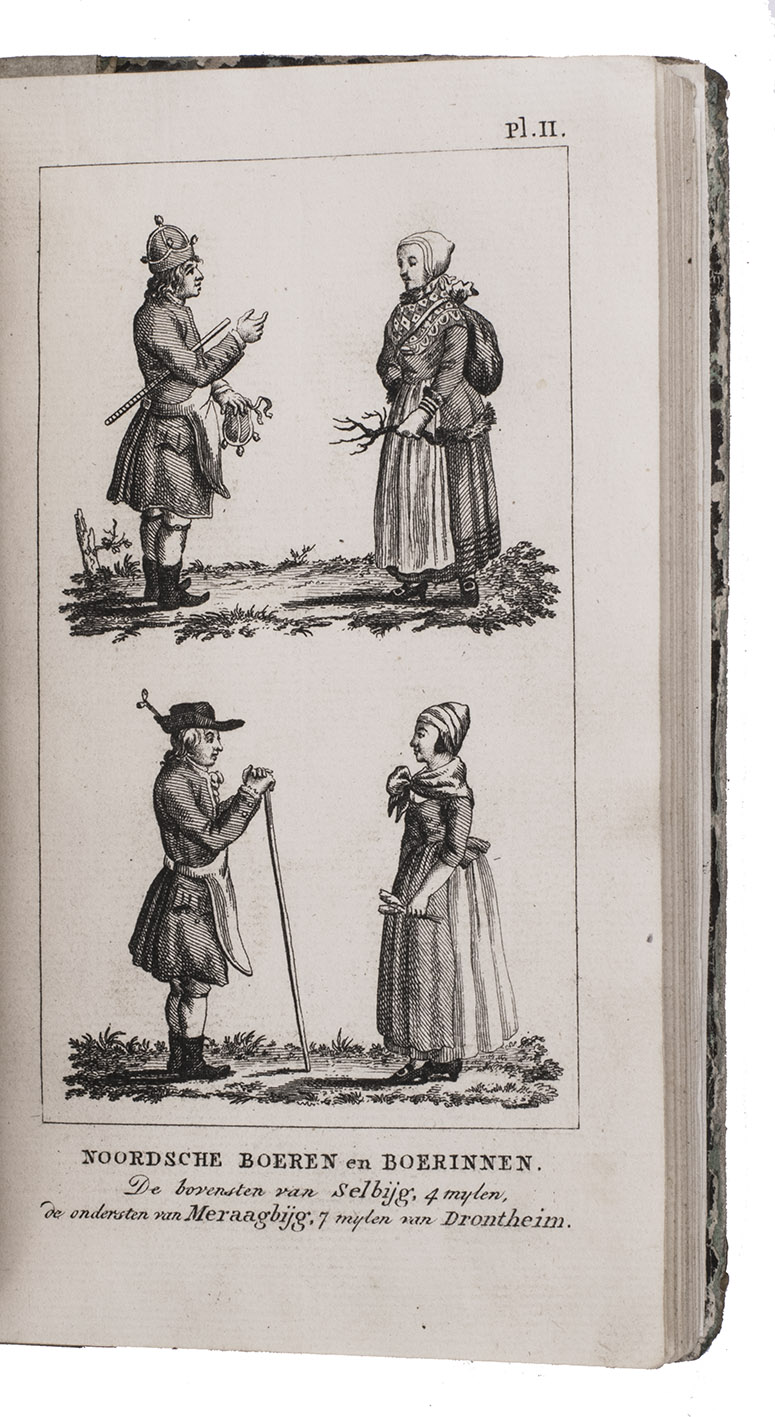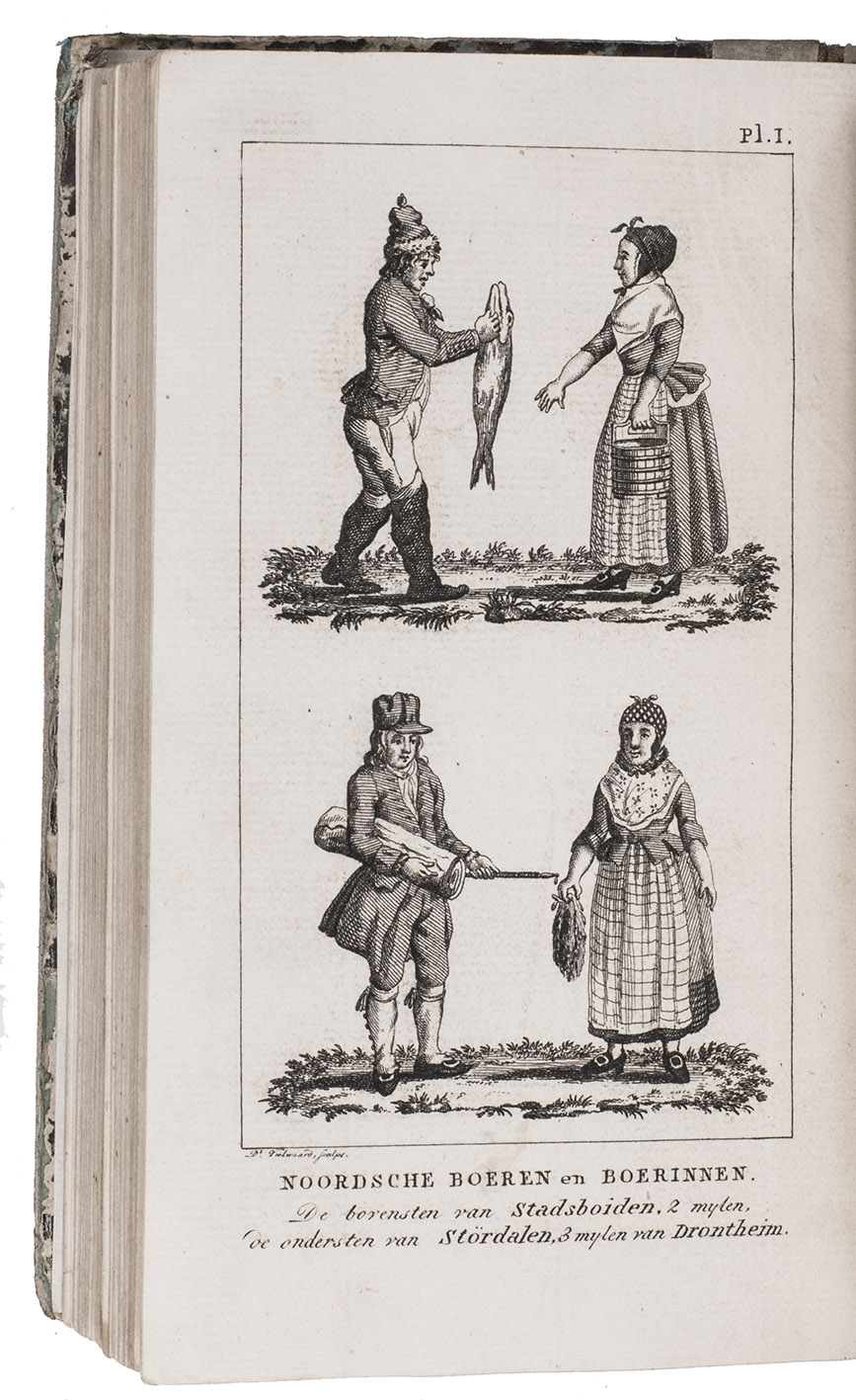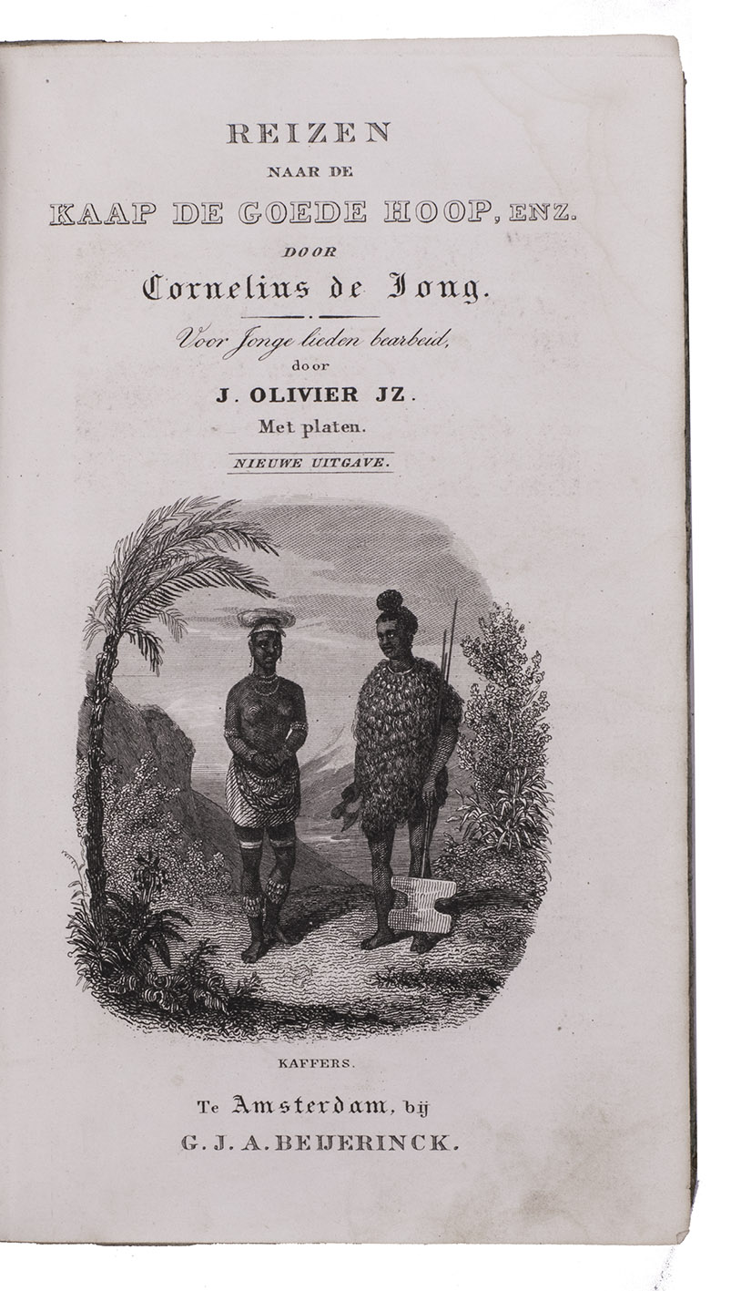 First edition of a work on the voyages of Cornelius de Jong to the Cape of Good Hope, Ireland and Norway, here edited for the youth by J. Olivier. Cornelius de Jong van Rodenburgh (1762-1838) was Captain of the Dutch war frigate Scipio, and sailed to the Cape of Good Hope, Ireland and Norway in the years from 1791 to 1797. The text is divided into 18 chapters, chronologically describing the voyage. Chapters 2 to 8 describe the Cape and its history, its inhabitants, the many (wild) animals living in southern Africa, the geography of the area, and more. Instead of continuing to the East-Indies, De Jong had to sail back to Europe, with secret orders to go to Cork. Chapters 9 and 10 describe Cork, its public buildings, inhabitants, trade, etc. Chapters 13-18 cover Norway, its inhabitants, fauna, climate, mines, etc. Four plates depict the costumes of farmers (men and women) from different parts of Norway. Also included is a folding plate depicting a snowy hill with skiing soldiers, with an early description of the sport and its role within the Norwegian army.