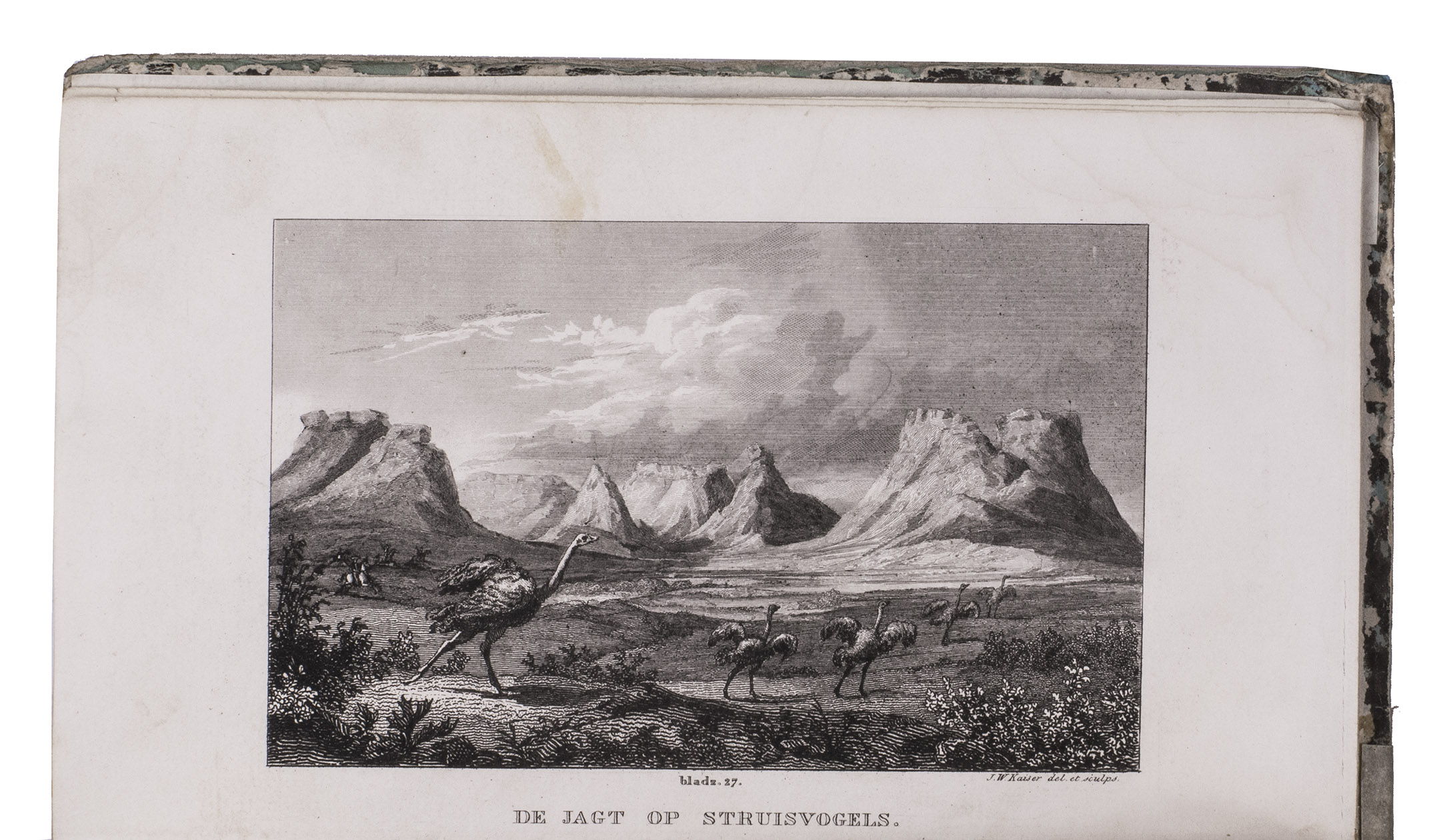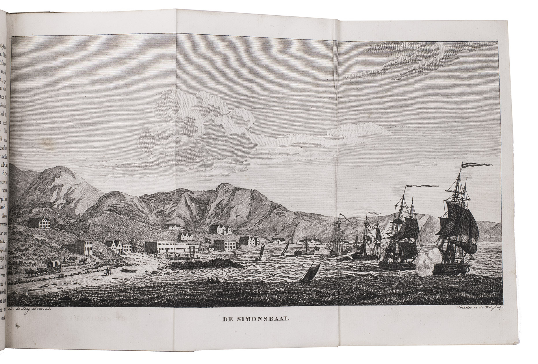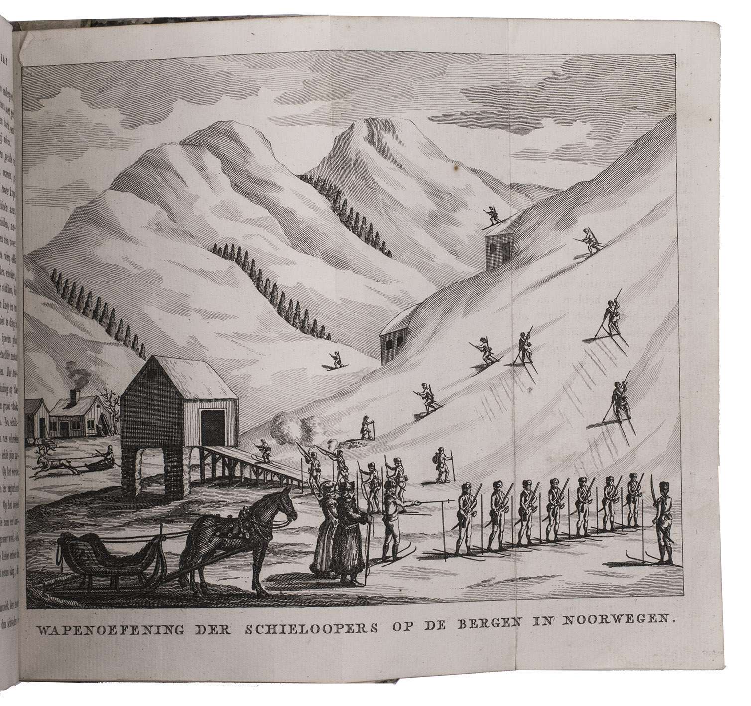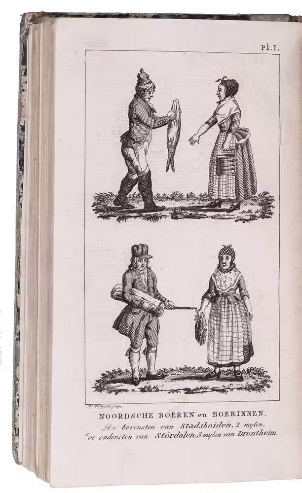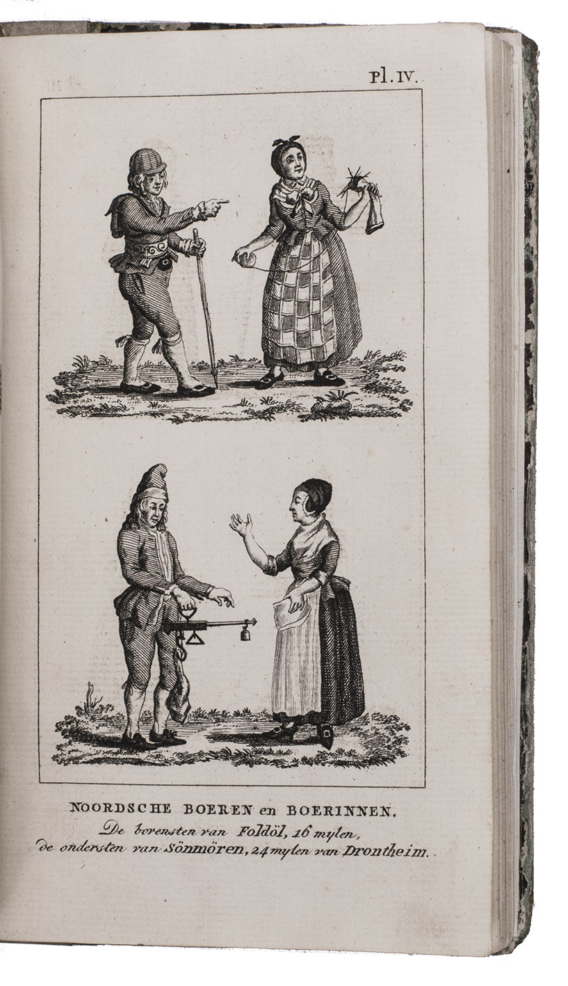 First edition of a work on the voyages of Cornelius de Jong to the Cape of Good Hope, Ireland and Norway, here edited for the youth by J. Olivier. Cornelius de Jong van Rodenburgh (1762-1838) was Captain of the Dutch war frigate Scipio, and sailed to the Cape of Good Hope, Ireland and Norway in the years from 1791 to 1797. The text is divided into 18 chapters, chronologically describing the voyage. Chapters 2 to 8 describe the Cape and its history, its inhabitants, the many (wild) animals living in southern Africa, the geography of the area, and more. Instead of continuing to the East-Indies, De Jong had to sail back to Europe, with secret orders to go to Cork. Chapters 9 and 10 describe Cork, its public buildings, inhabitants, trade, etc. Chapters 13-18 cover Norway, its inhabitants, fauna, climate, mines, etc. Four plates depict the costumes of farmers (men and women) from different parts of Norway. Also included is a folding plate depicting a snowy hill with skiing soldiers, with an early description of the sport and its role within the Norwegian army.