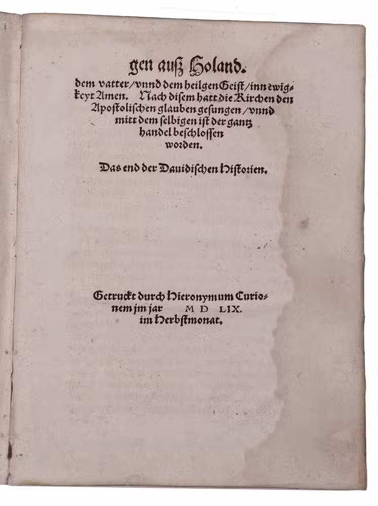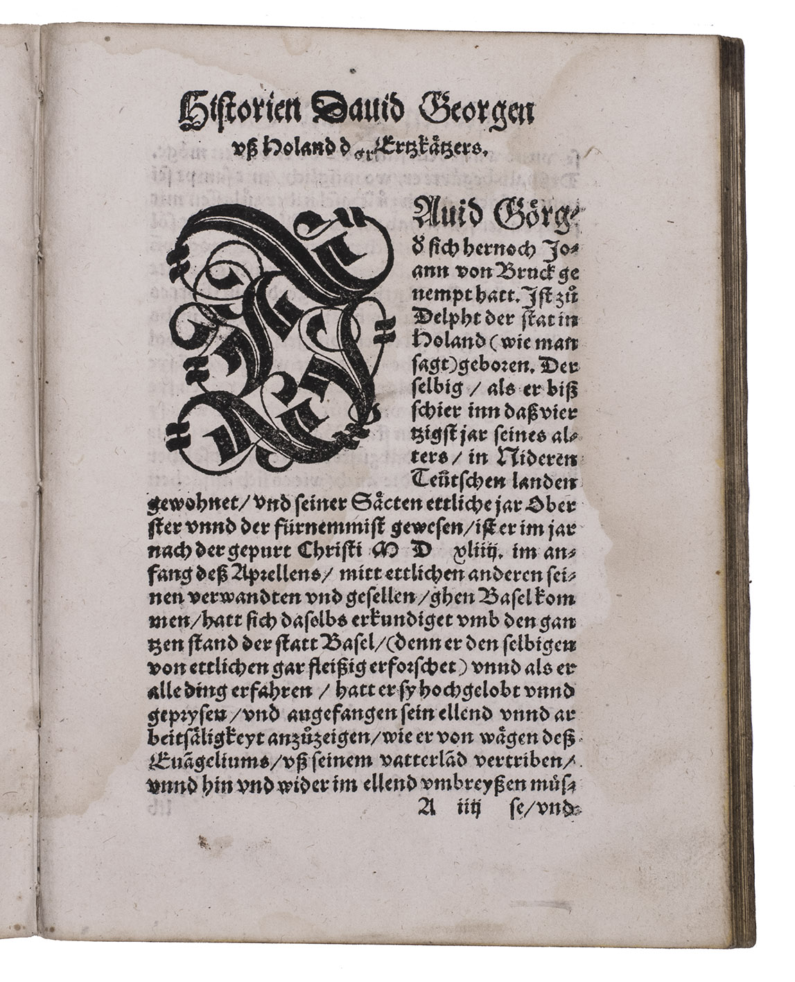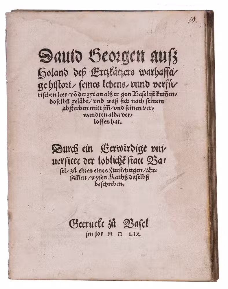 First German edition, of a rare and important early biography of the famous Dutch heretic and Anabaptist David Joris. Banished from Holland for his overt rejection of the abuses of the Roman Catholic Church, Joris fled to Friesland, where he met the Anabaptists. He joined them in 1533 after his baptism and tried to appease the disputing parties within the sect. Ecstatic and susceptible to flattery, he declared himself a prophet with a divine mission and supernatural powers. Soon he got many followers, but he and his group were also severely persecuted. In 1554, he came to live in Basle after five years on the run from the Dutch authorities. There he lived with his family as a rich and respected citizen under the name of Jan van Brugge, pretending to be a Reformed refugee while he still kept in touch with his followers in the Southern Netherlands. The present biography is especially valuable for Joris's life in Basle (1554-1556).