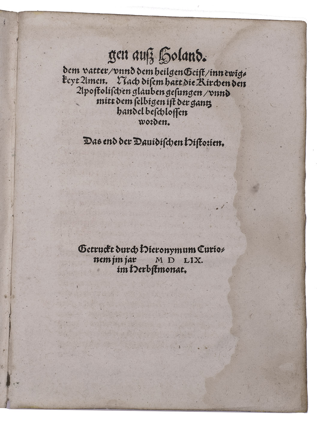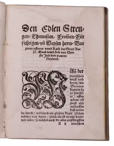Basel, (colophon: printed by Hieronymus Curio, September 1559), 1559. Small 4to. With 2 large woodcut gothic decorated initials (56 mm). Set in schwabacher types with incidental fraktur and the year of publication in Roman numerals. Disbound. [63], [1 blank] pp.
