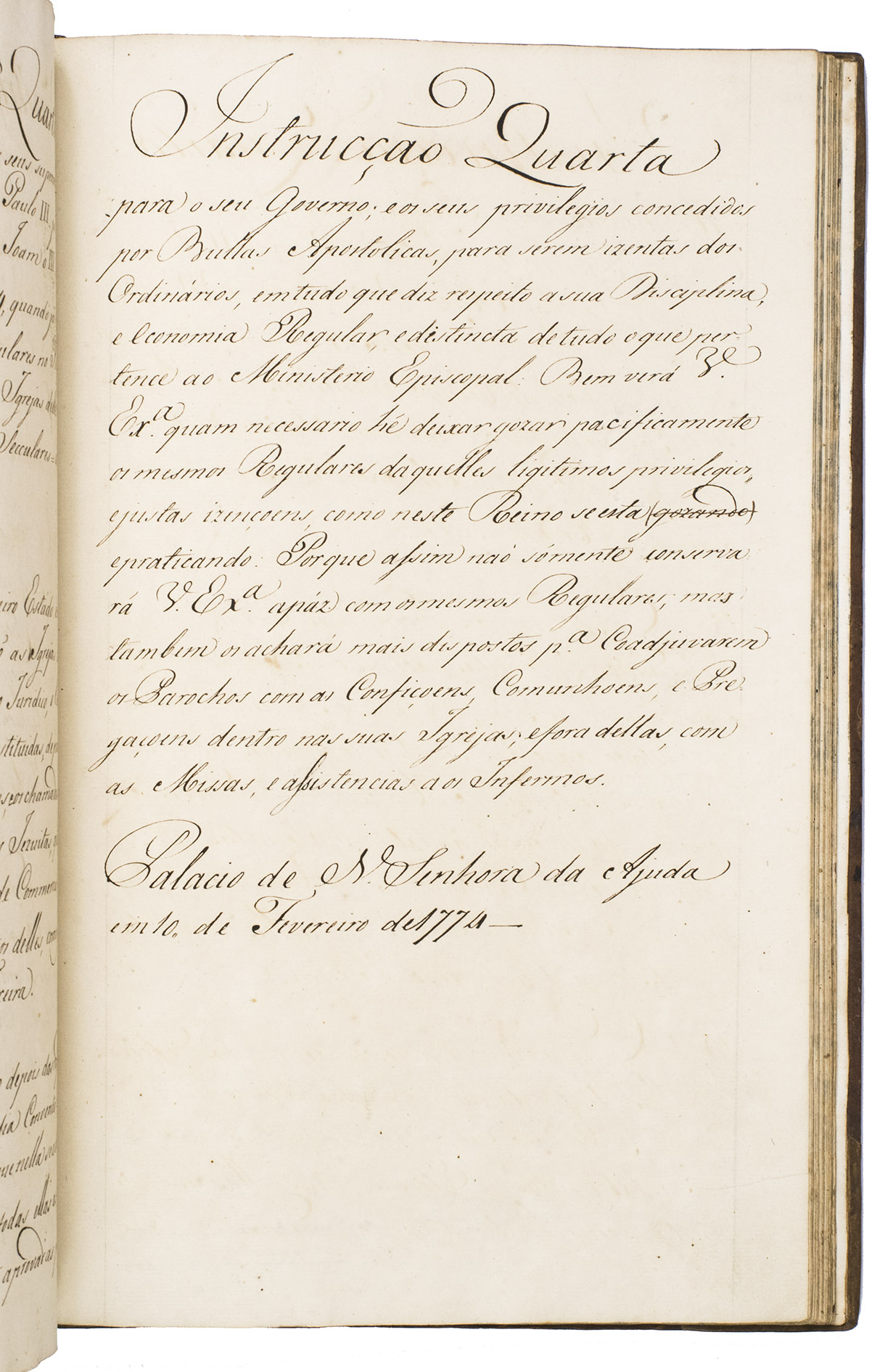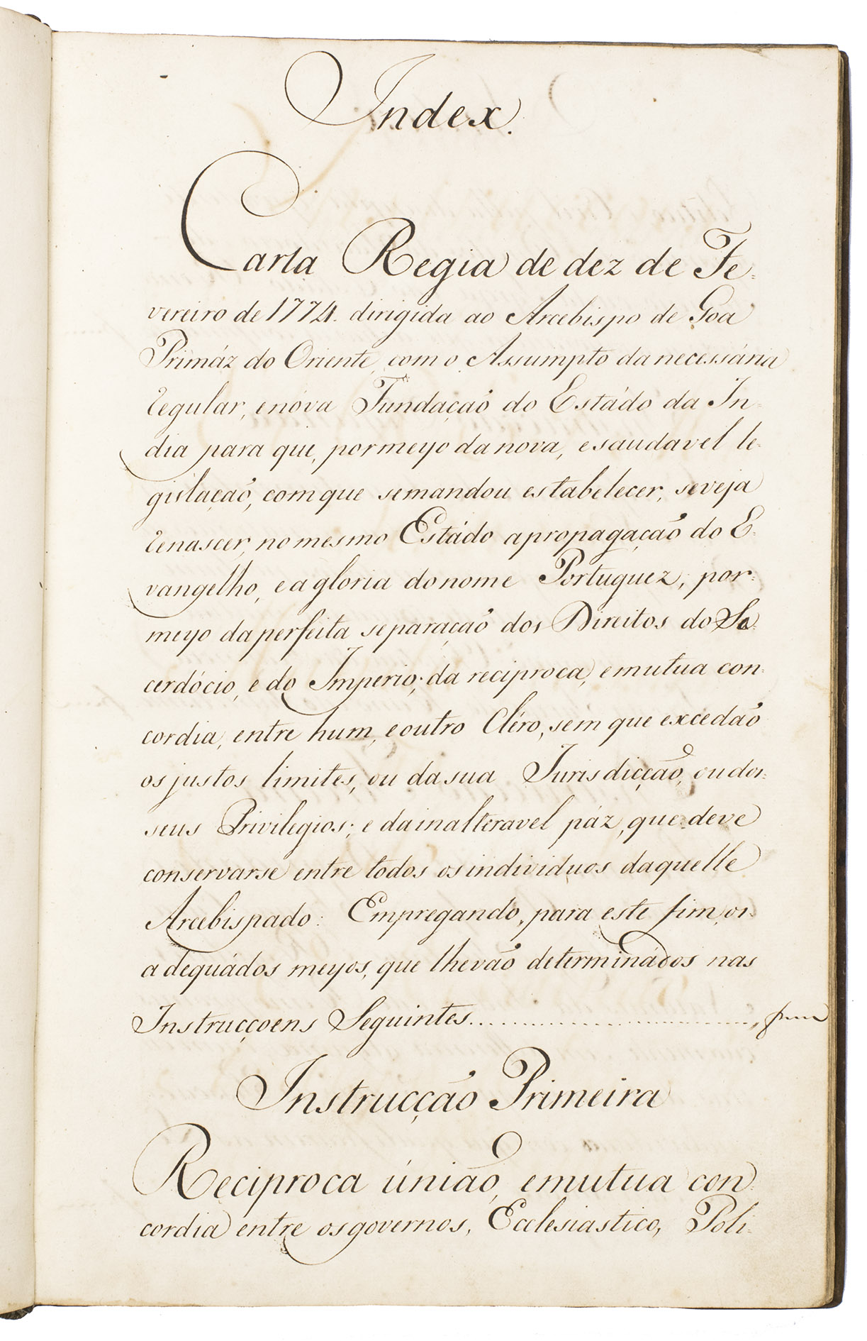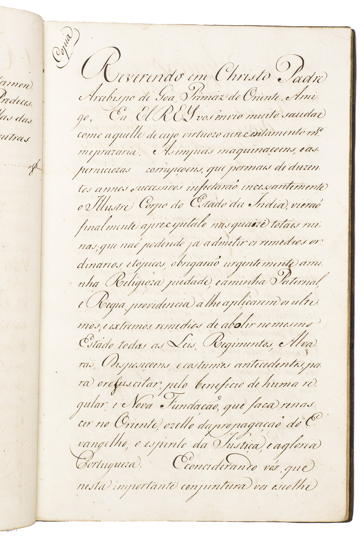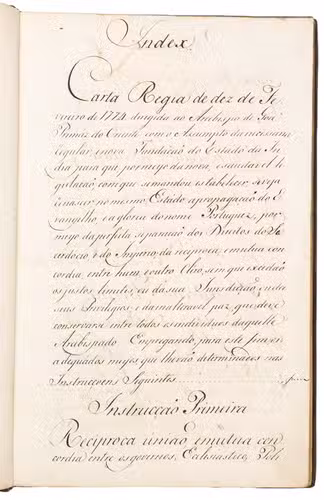 Rare contemporary manuscript of a royal letter addressed to the newly appointed Archbishop of Goa and Primate of the Orient, the Augustinian hermit Dom Frei Francisco da Assunção e Brito, just prior to his departure from Portugal to take up his new post. It outlines a set of ecclesiastic reforms arranged in six instructions. These were part of a series of major reforms introduced by the Portuguese king relating to the governance of the Estado da India: the same day, royal instructions were also sent to the Governor and Captain General of Portuguese India, D. José Pedro da Câmara, regarding military, political and economic reforms.