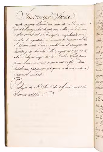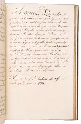 [Lisbon?, dated 10 February 1774 at the foot of the of each of the six Instrucçõens]. Folio. Manuscript on paper, written in a neat secretarial hand. Contemporary gold-tooled brown calf. [2 blank], [4], [68], [2], [4 blank] ll.