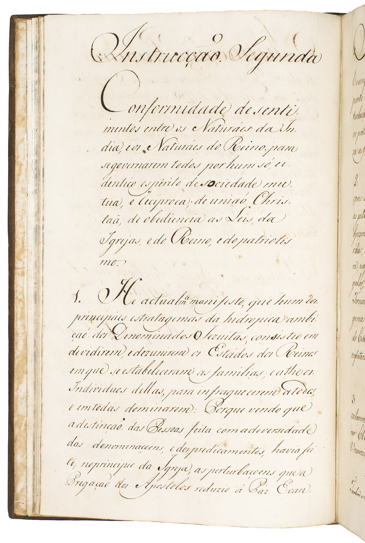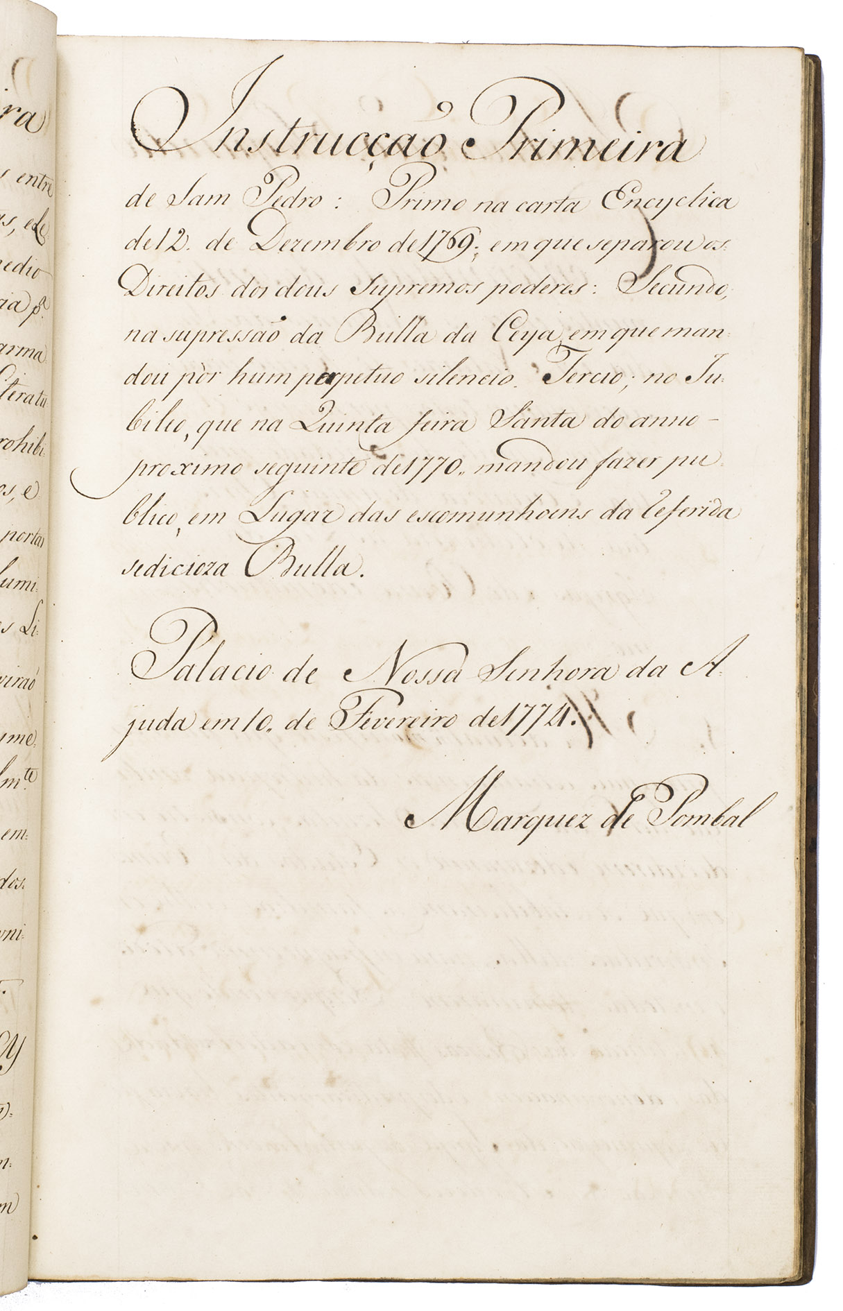 The instructions to the Reverendo Arcebispo de Goa were drafted by the Marquês de Pombal, Sebastião José de Carvalho e Melo, 1st Marquis of Pombal, 1st Count of Oeiras (1699-1782). Carvalho was one of the most influential Portuguese statesmen of the eighteenth century: it was during his term as prime minister earlier in the reign of José I that Portugal had abolished slavery both in Portugal itself and in the Portuguese colonies in India (but, not, however in other parts of its empire), and that autos-de-fé and the Limpeza de Sangue had been phased out. He had also been largely responsible for having the Jesuit Order expelled from Portuguese domains, and he does not conceal his antipathy towards the Order in these instructions to the new Archbishop. Of great interest also are Carvalhos insistence on the removal of any distinction between natives of India and natives of Portugal (second and third instructions), and his condemnation of the level of censorship imposed by the Inquisition and by the Jesuits (fifth instruction).