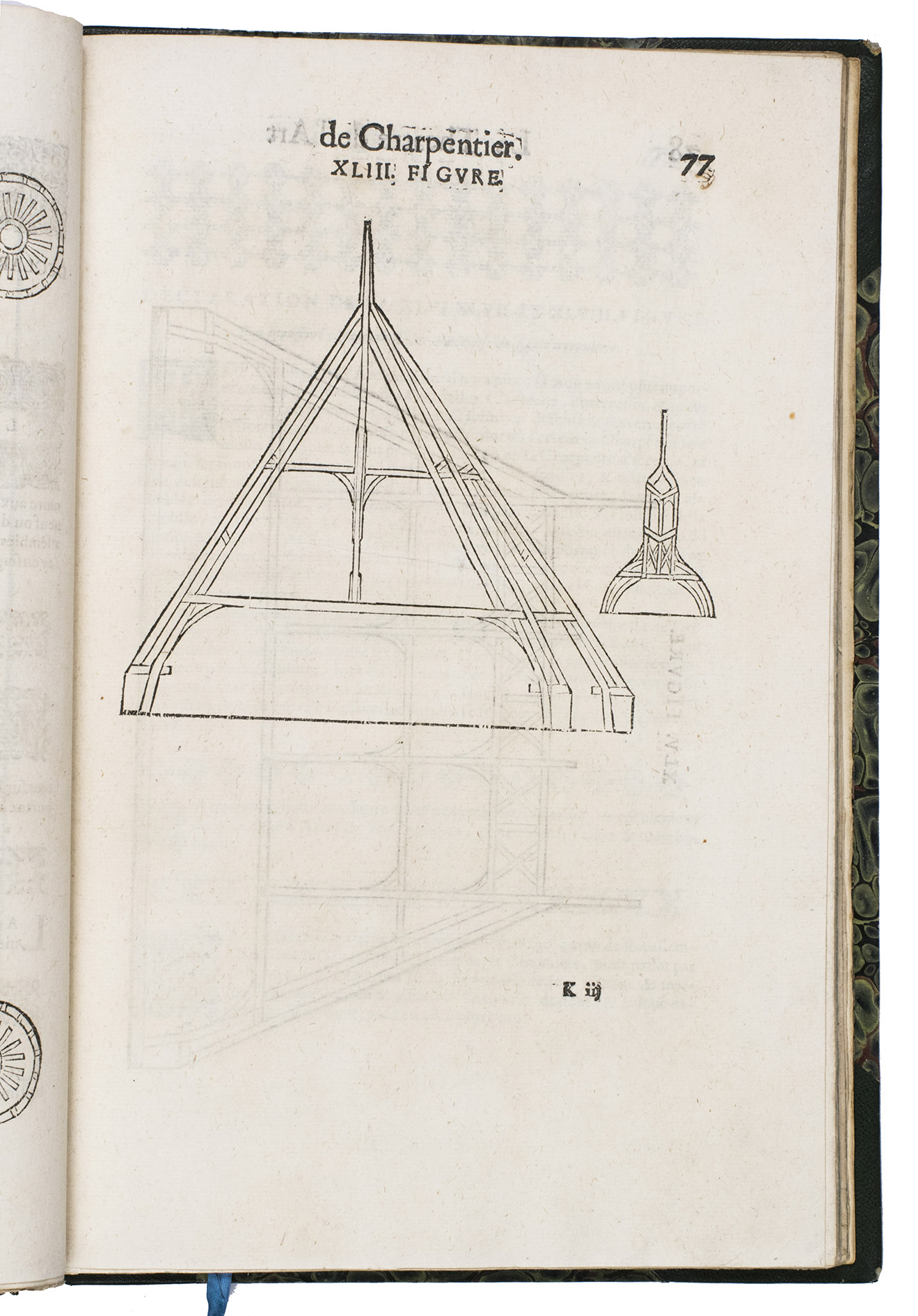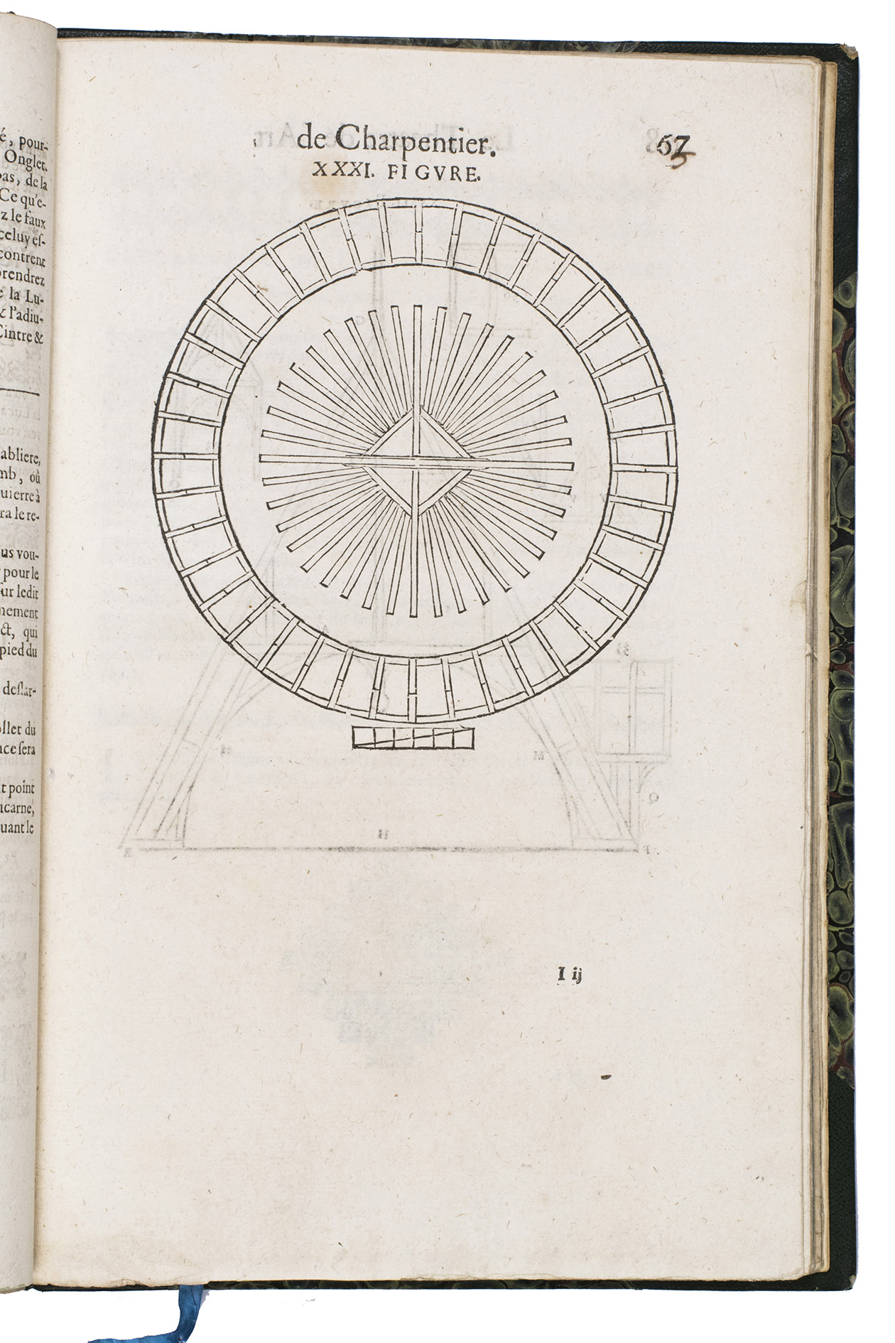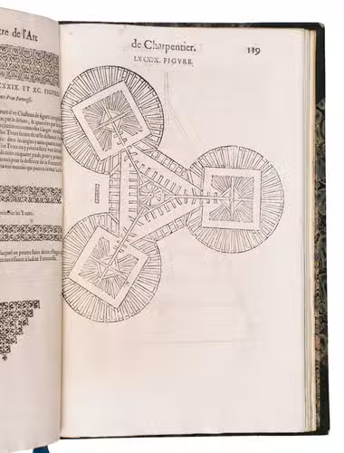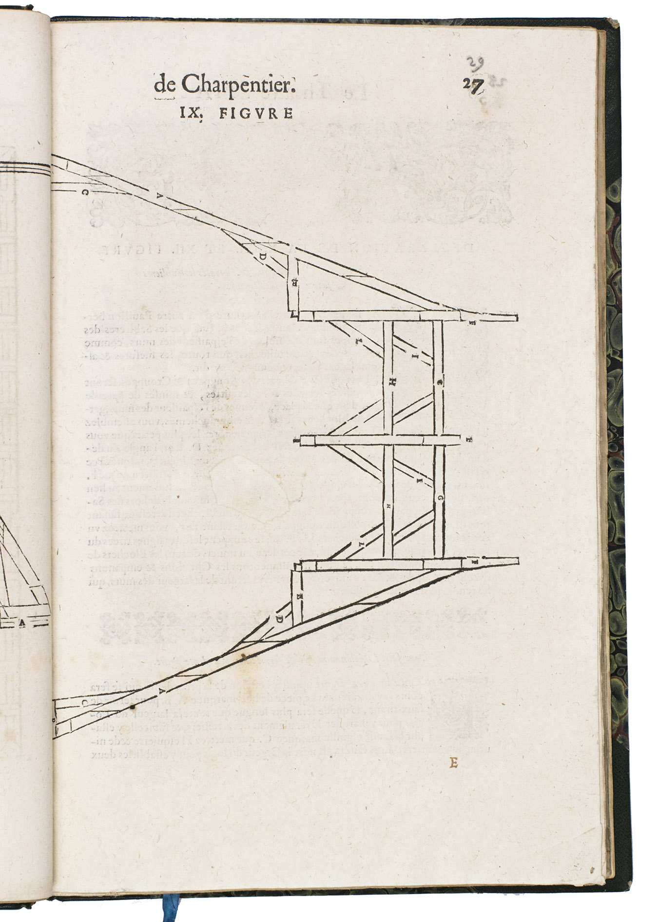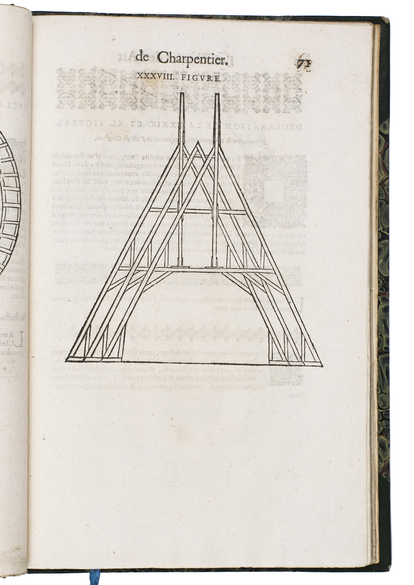 Rare original edition of a very important and most richly illustrated model book on timber frame construction for use of carpenters, beautifully bound by E. Vogel (fl. 1814-1849) from Paris, one of the best French bookbinders from the Romantic era, who signed his name on the spine. The work, in all probability, is the first book devoted entirely to carpentry. It describes no less than 125 different projects by the French architect Mathurin Jousse (1607-1692), offering a wide variety of wooden constructions, from timber-frames for all sorts of buildings, roofs, towers, fortresses, barns, bridges, and theatres, to staircases, balconies, and pigeon coops. Each project is illustrated.