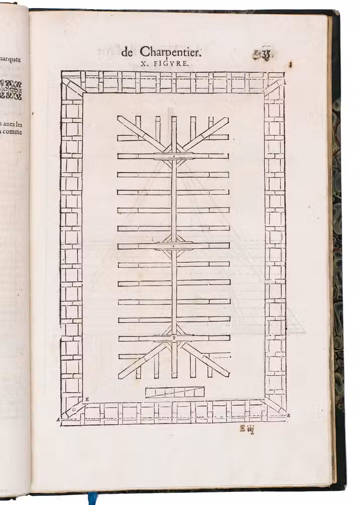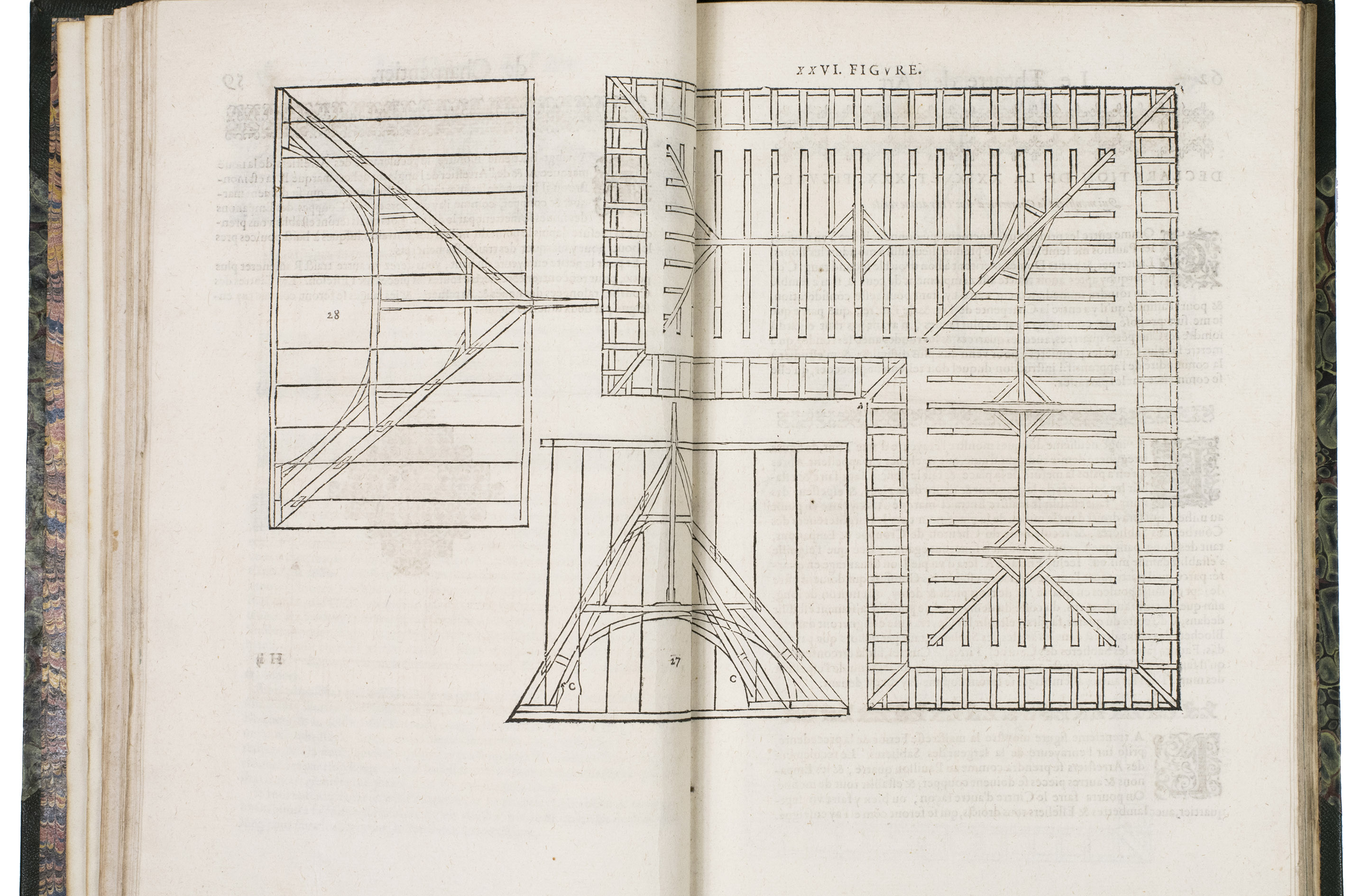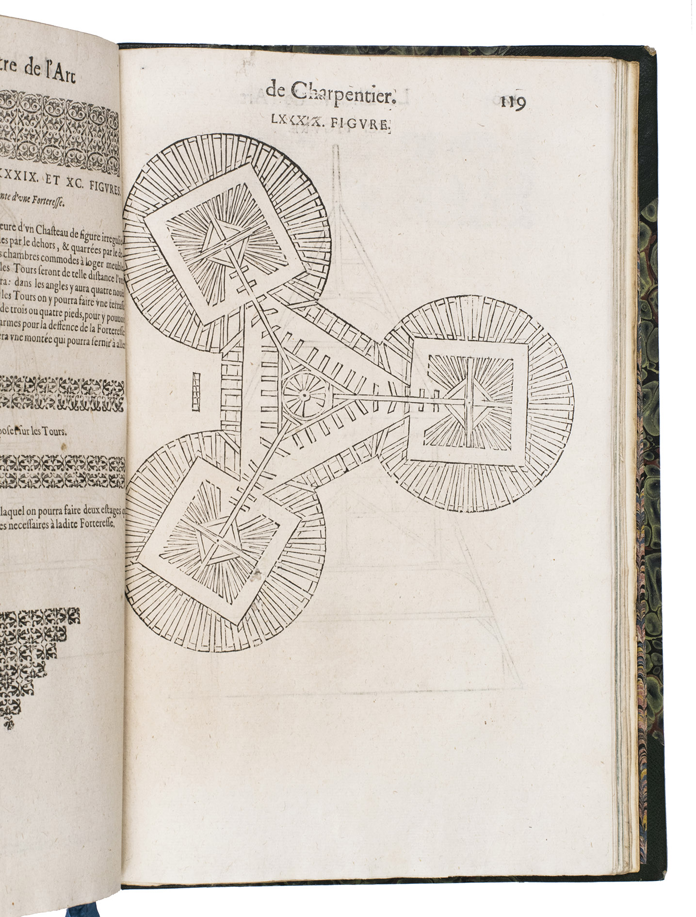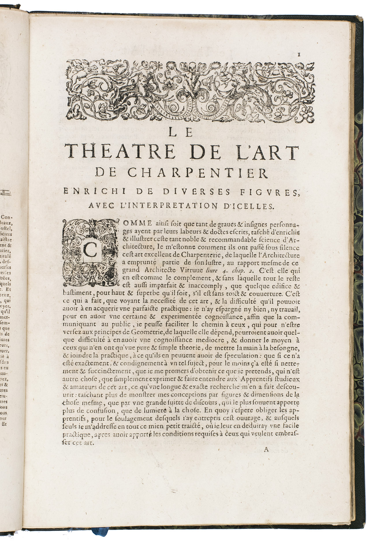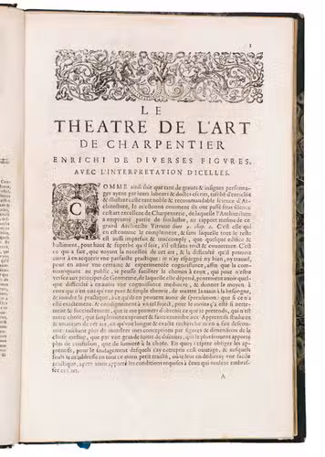Rare original edition of a very important and most richly illustrated model book on timber frame construction for use of carpenters, beautifully bound by E. Vogel (fl. 1814-1849) from Paris, one of the best French bookbinders from the Romantic era, who signed his name on the spine. The work, in all probability, is the first book devoted entirely to carpentry. It describes no less than 125 different projects by the French architect Mathurin Jousse (1607-1692), offering a wide variety of wooden constructions, from timber-frames for all sorts of buildings, roofs, towers, fortresses, barns, bridges, and theatres, to staircases, balconies, and pigeon coops. Each project is illustrated.