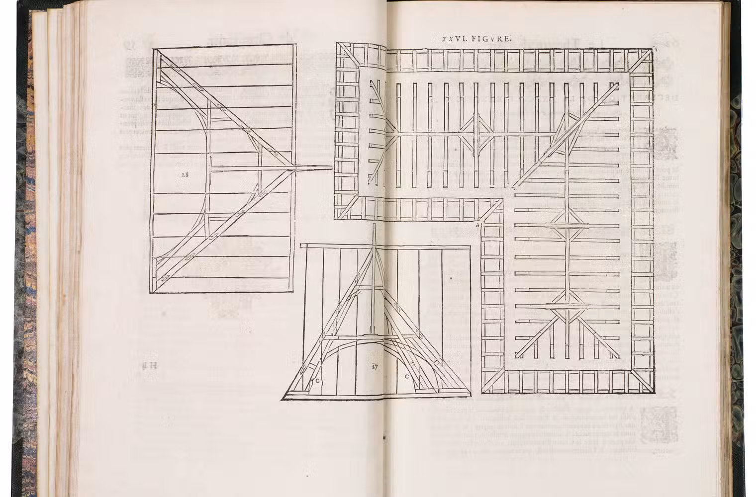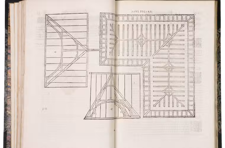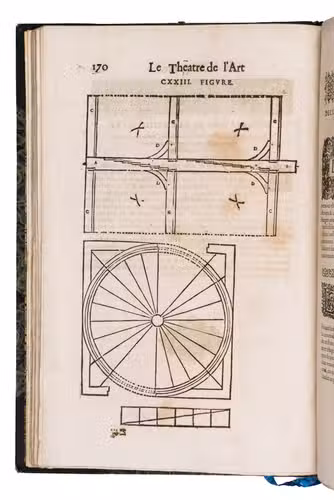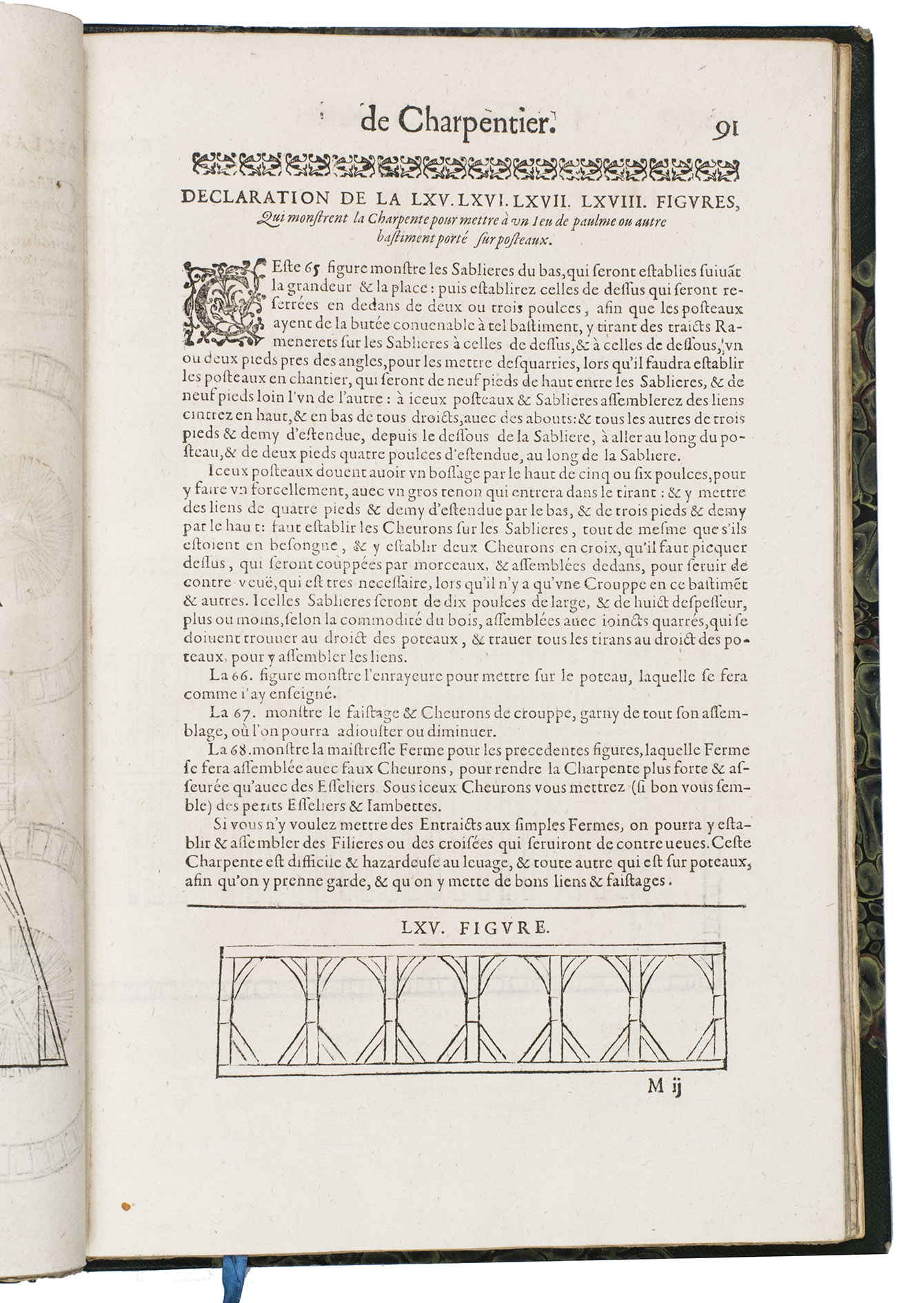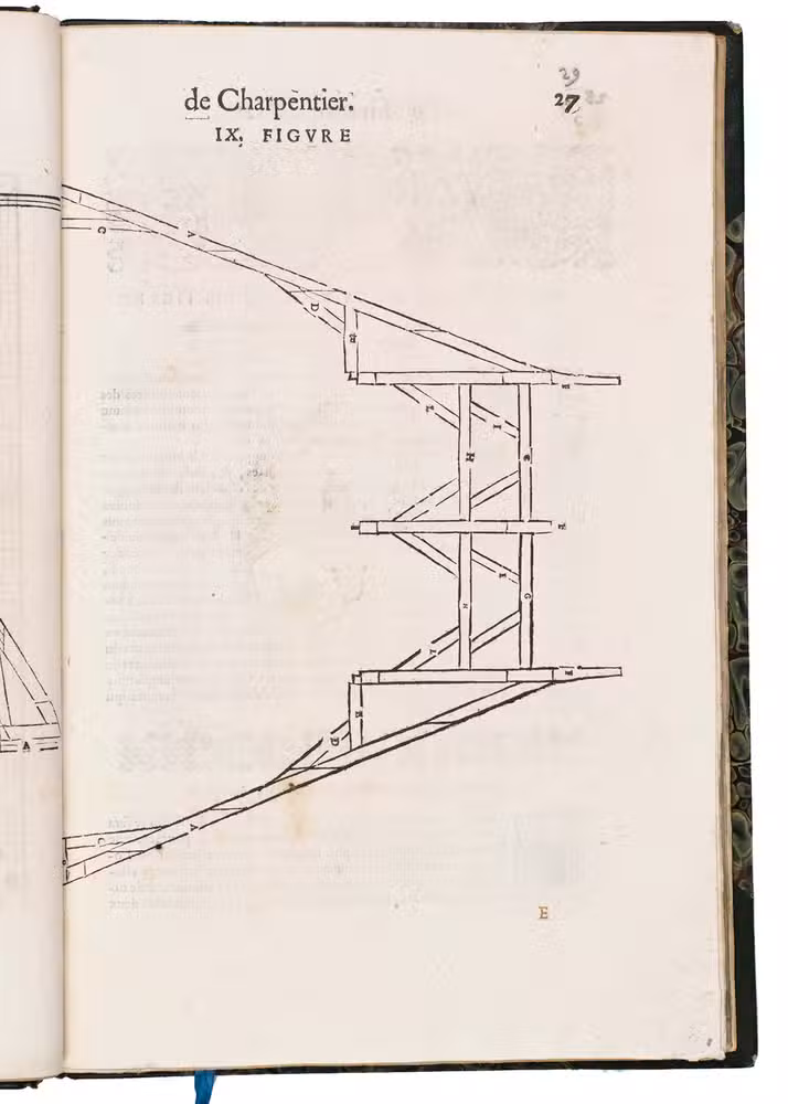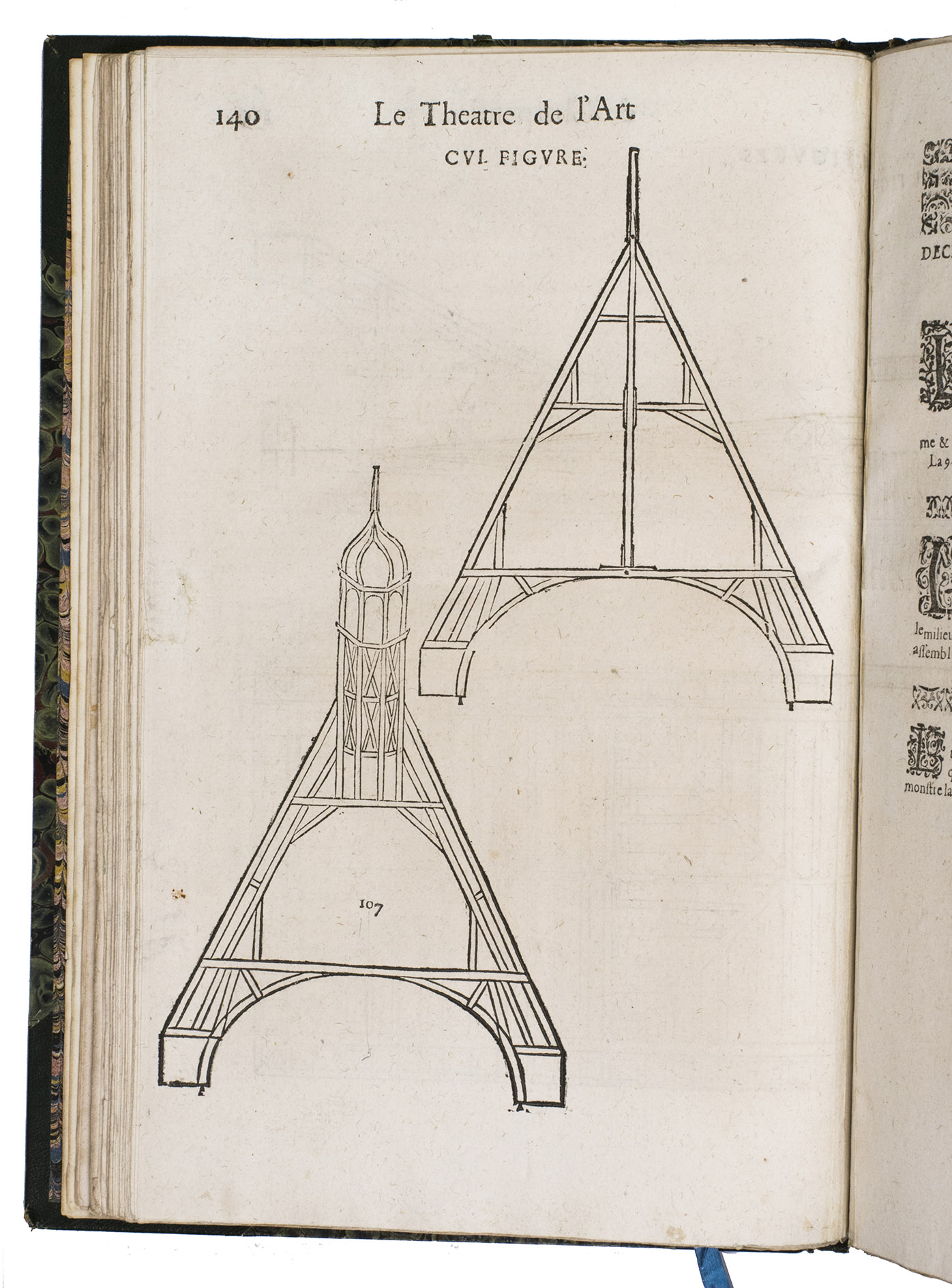 Rare original edition of a very important and most richly illustrated model book on timber frame construction for use of carpenters, beautifully bound by E. Vogel (fl. 1814-1849) from Paris, one of the best French bookbinders from the Romantic era, who signed his name on the spine. The work, in all probability, is the first book devoted entirely to carpentry. It describes no less than 125 different projects by the French architect Mathurin Jousse (1607-1692), offering a wide variety of wooden constructions, from timber-frames for all sorts of buildings, roofs, towers, fortresses, barns, bridges, and theatres, to staircases, balconies, and pigeon coops. Each project is illustrated.