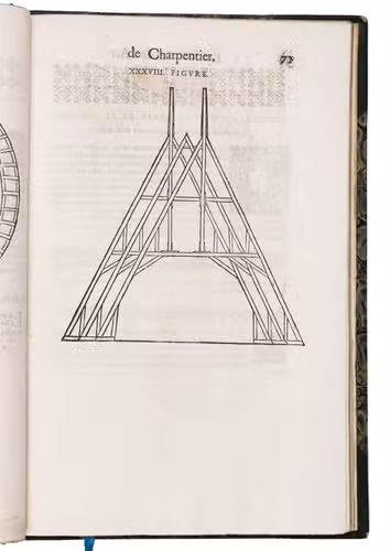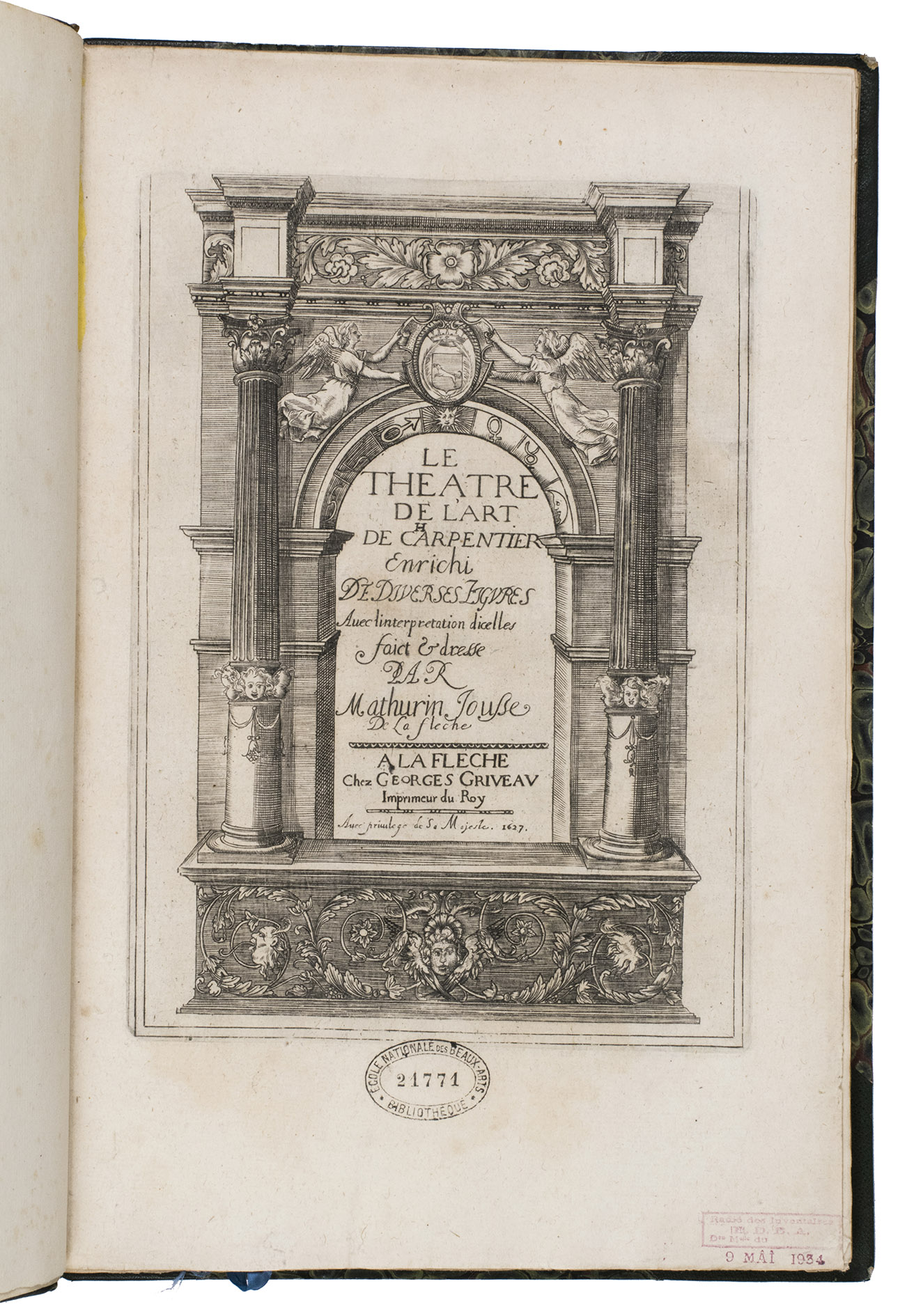 Little is known of the author, who published a treatise on locks and metalwork at Griveau's press in the same year, and a work on stereotomy in 1635. He may have been connected with the Jesuit college at La Fleche, possibly as its architect. Another edition of the present work was published by Griveau in 1650, followed by further editions in 1664, 1692, 1702 and 1751. The treatise added at the end is meant for an extra general instruction on perspective and proportions and the five orders of columns. In the explanation of the plates the specific carpenters jargon is found, which is partly still used and understood until the present day.