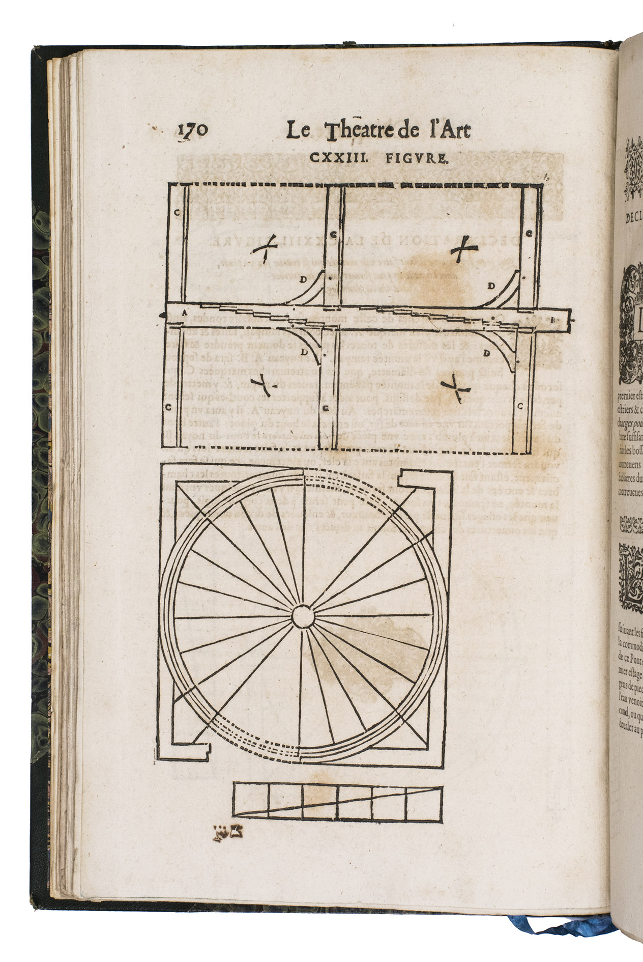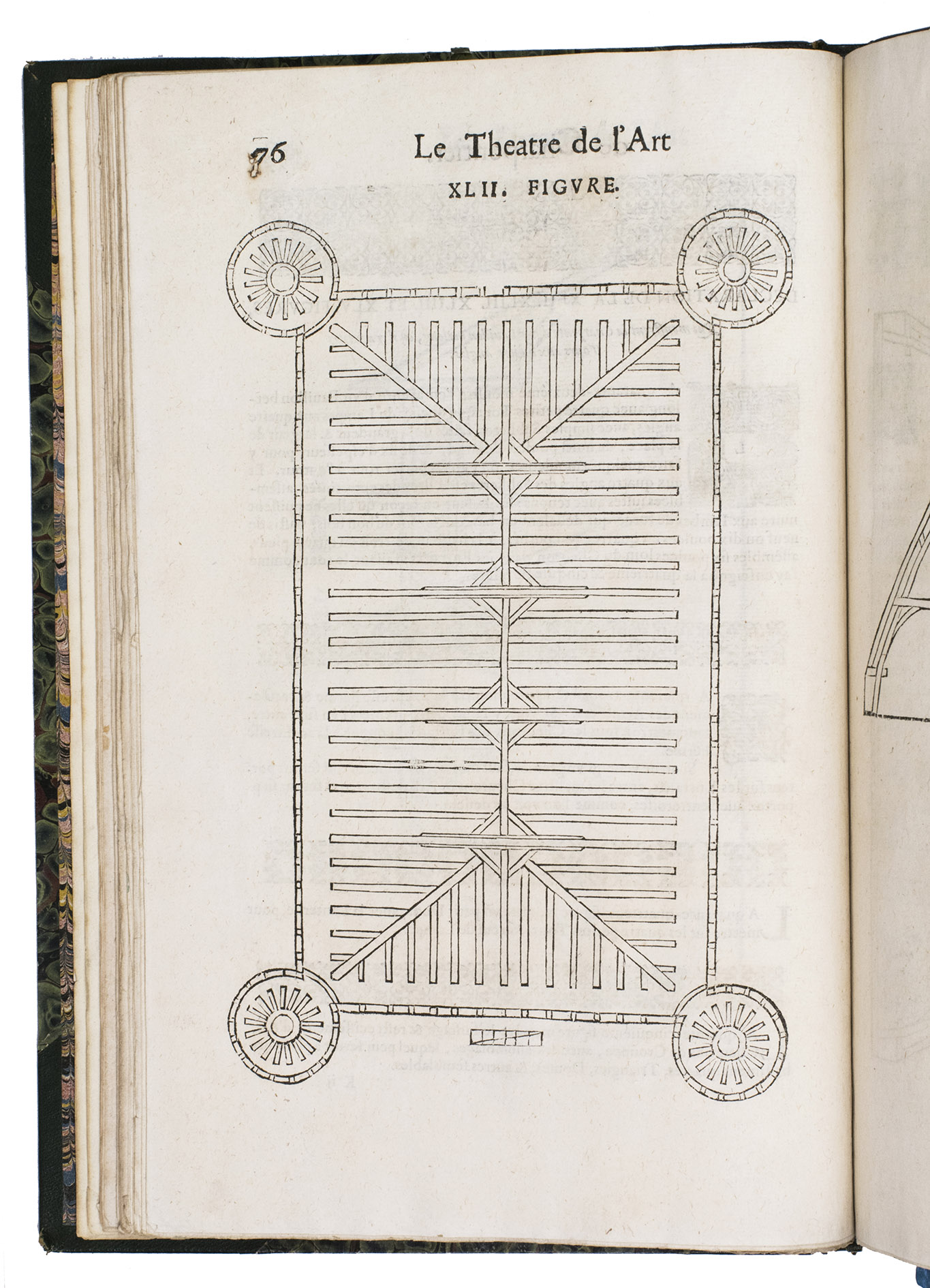 La Fleche, Georges Griveau, 1627. 2 parts in 1 volume. Folio. With a richly engraved title page, 125 woodcut illustrations (7 double page, 118 full-page), and 5 large half-page woodcuts in the main work; 2 general perspectival model designs on 2 full-page plates, and 5 half-page woodcuts in the treatise.