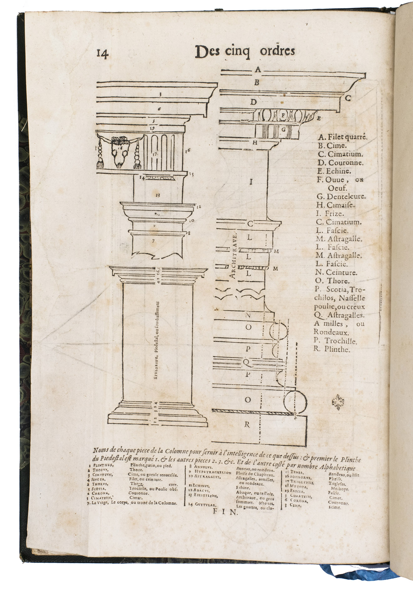 Including: [IDEM]. Brief traicte des cinq ordres des colomnes. 19th-century gold-tooled green half morocco, with the author, title, year of publication, and bookbinder (Vogel) lettered in gold on the spine, marbled paper sides, marbled endpapers. [4], "176" [= 172]; 14 pp.