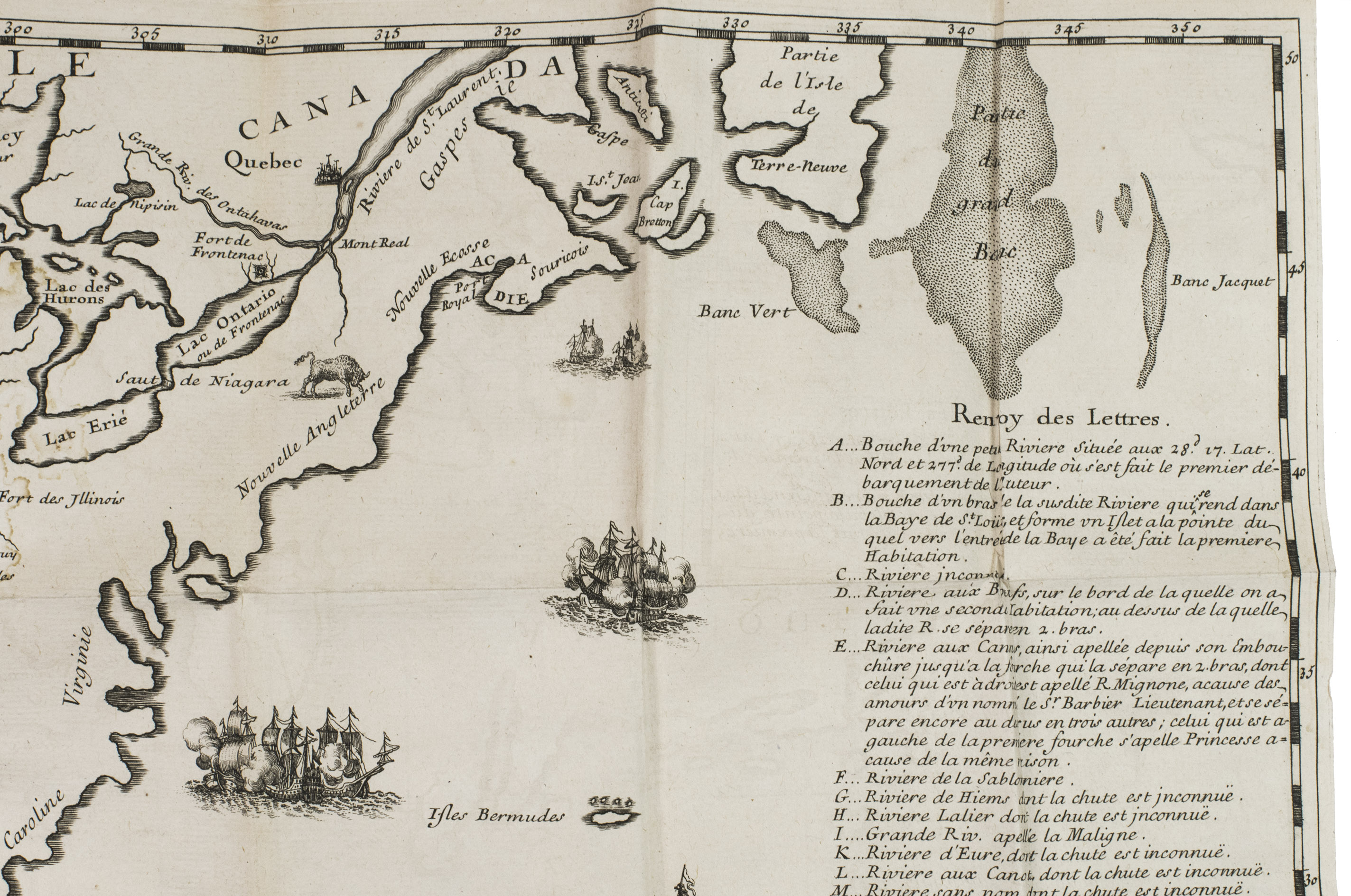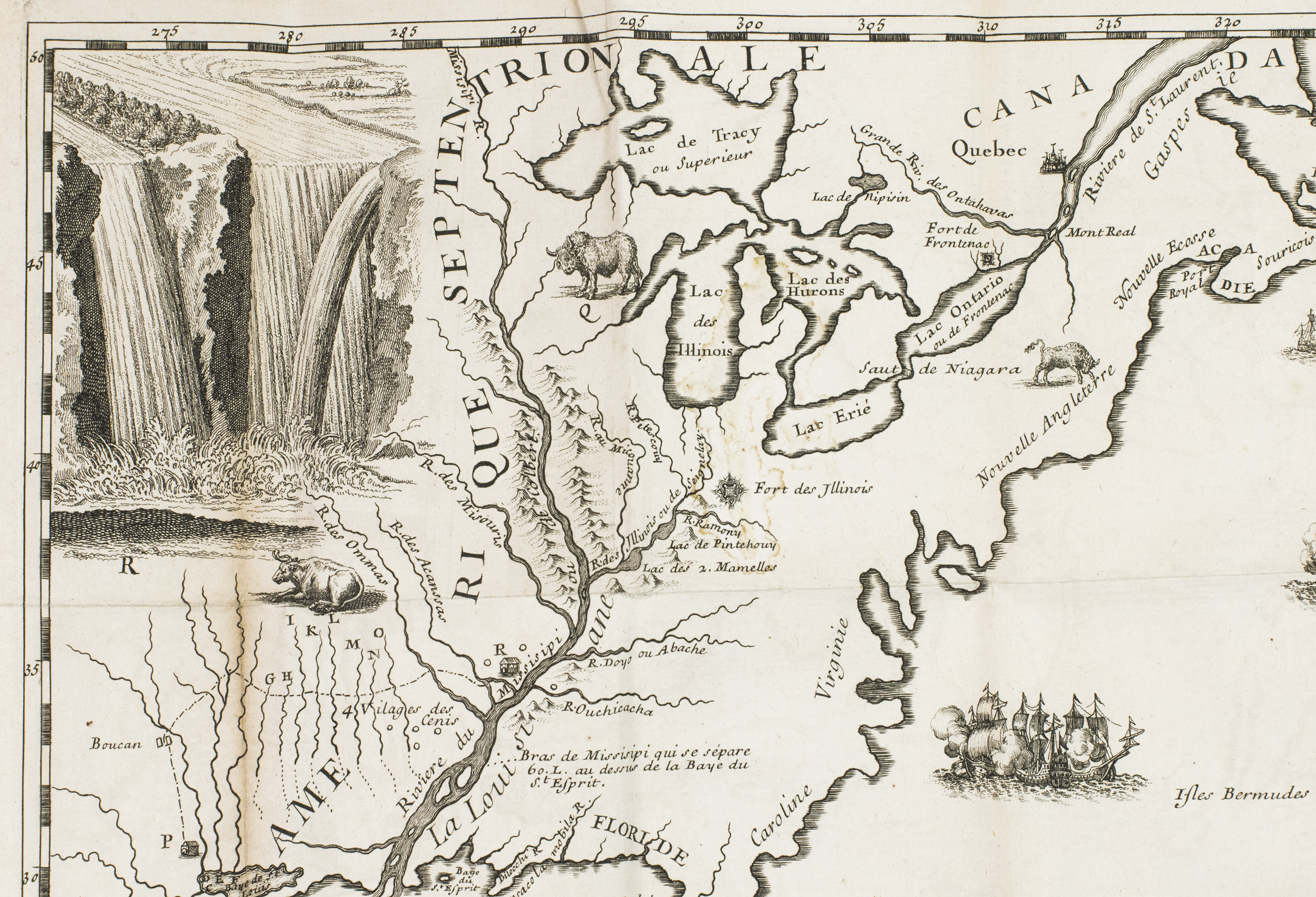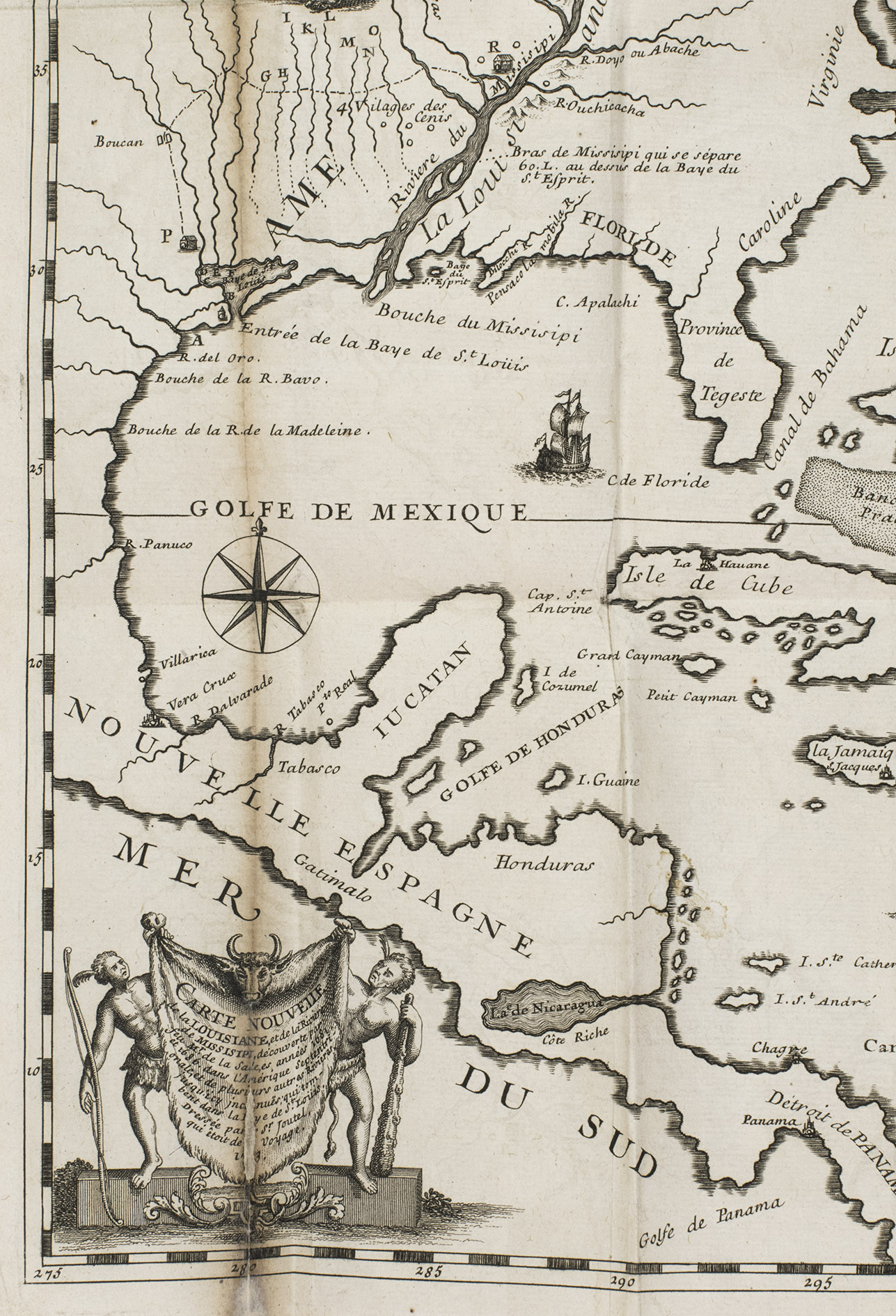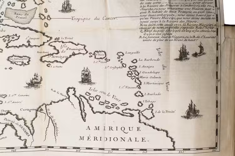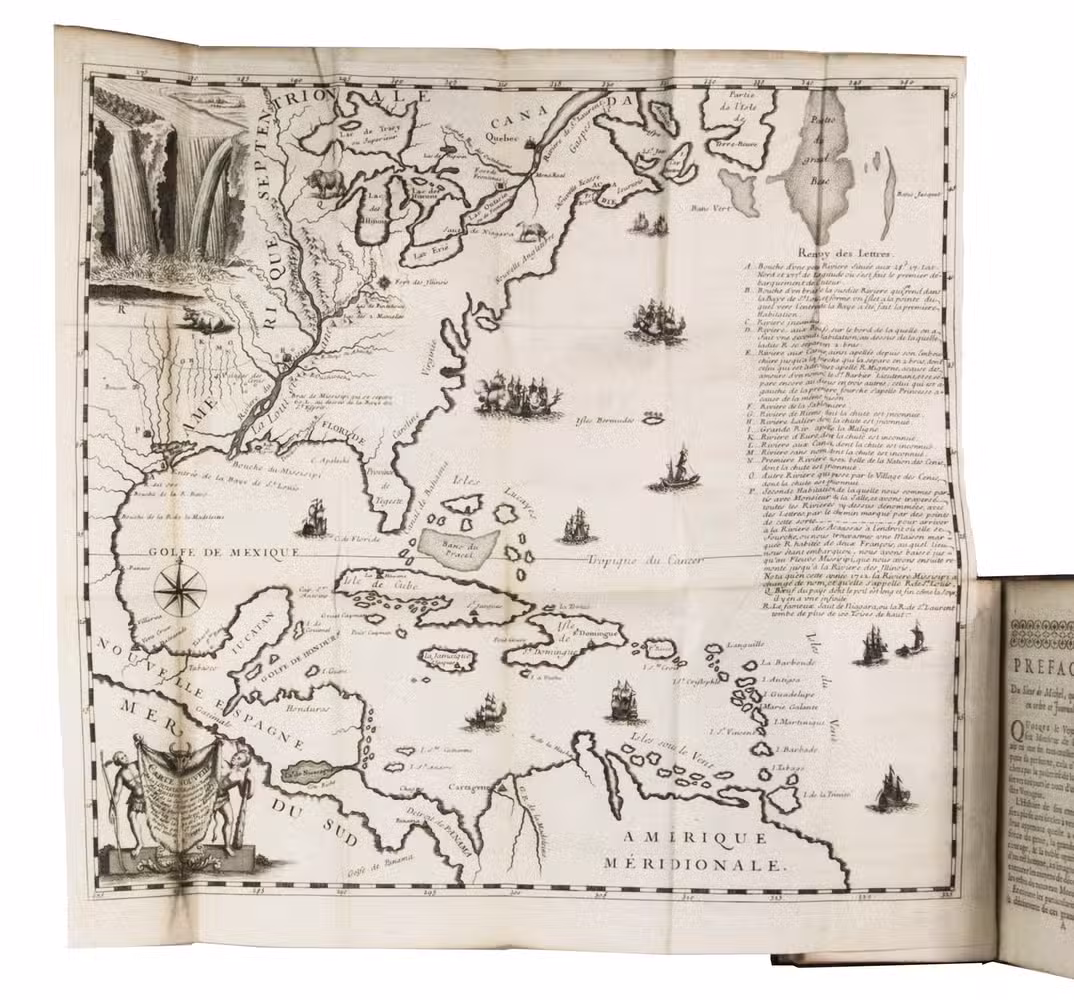 This work is rare as it is, but our copy is of a much greater rarity because it contains the large folding map, which is almost never found with the book. The beautifully designed and engraved map depicts a small view of Nicaragua, part of the Atlantic and the coastal areas of America and Middle America, which are relevant for the expedition. Besides the mouth of the Mississippi it records many other small rivers, described for the first time by De la Salle.