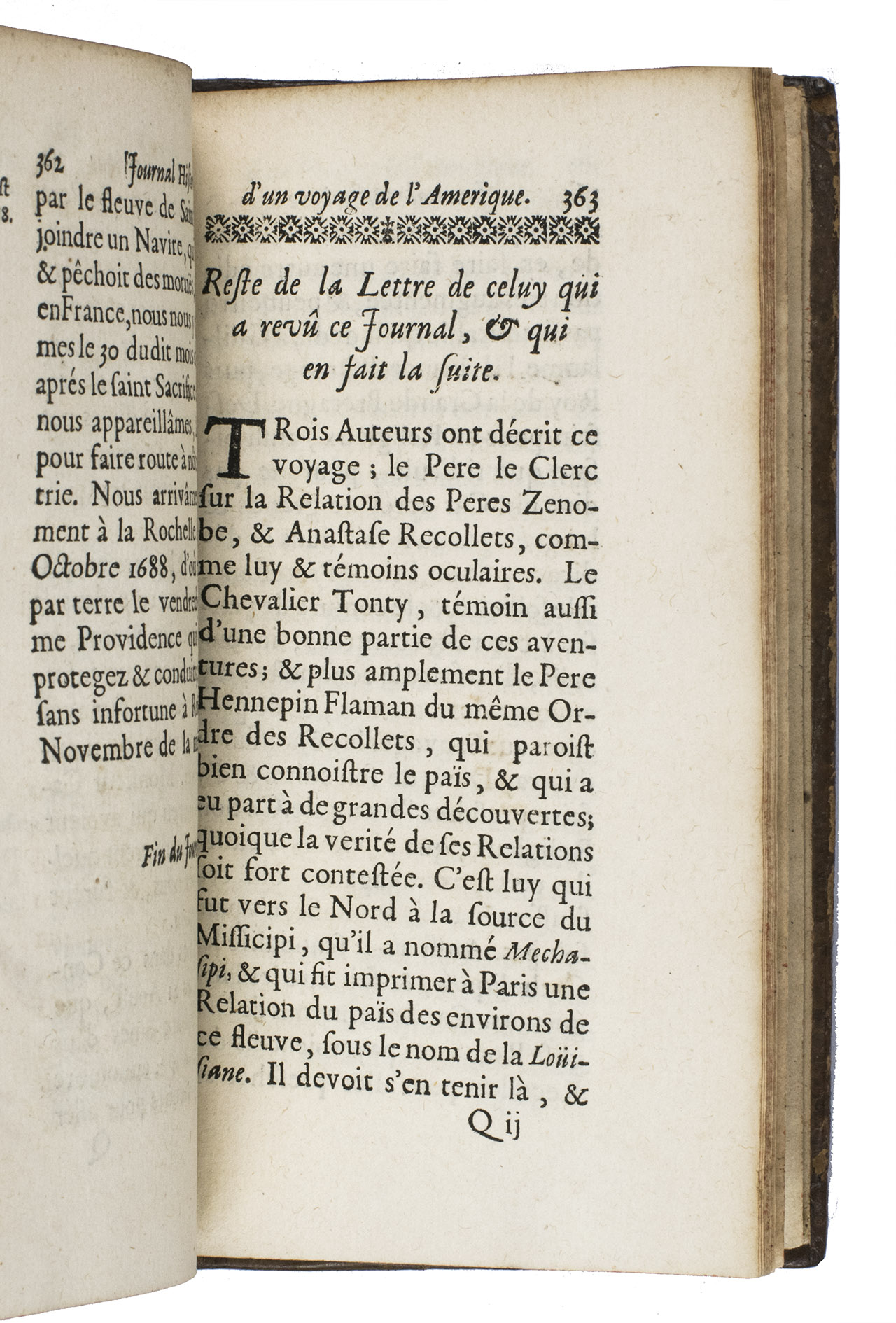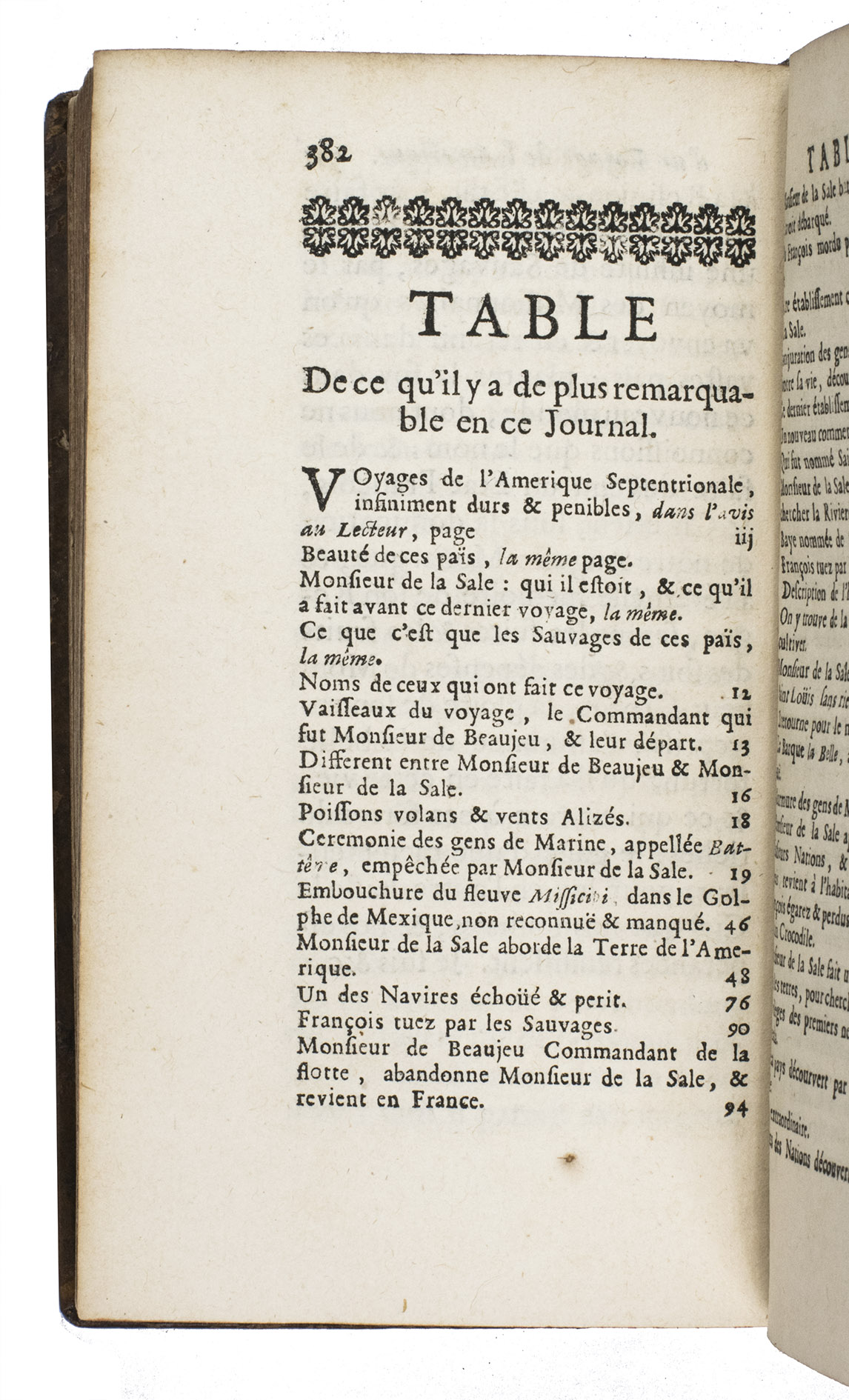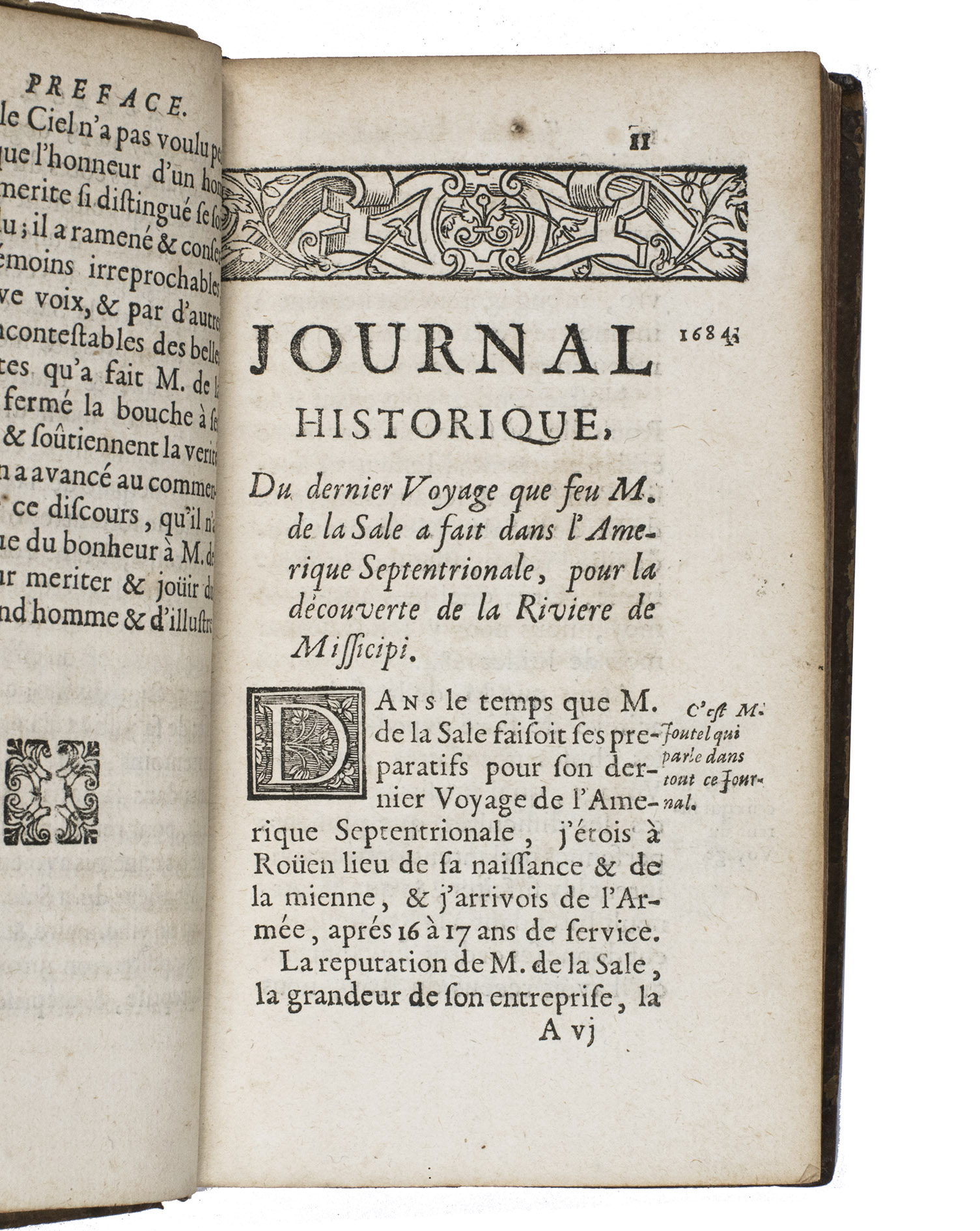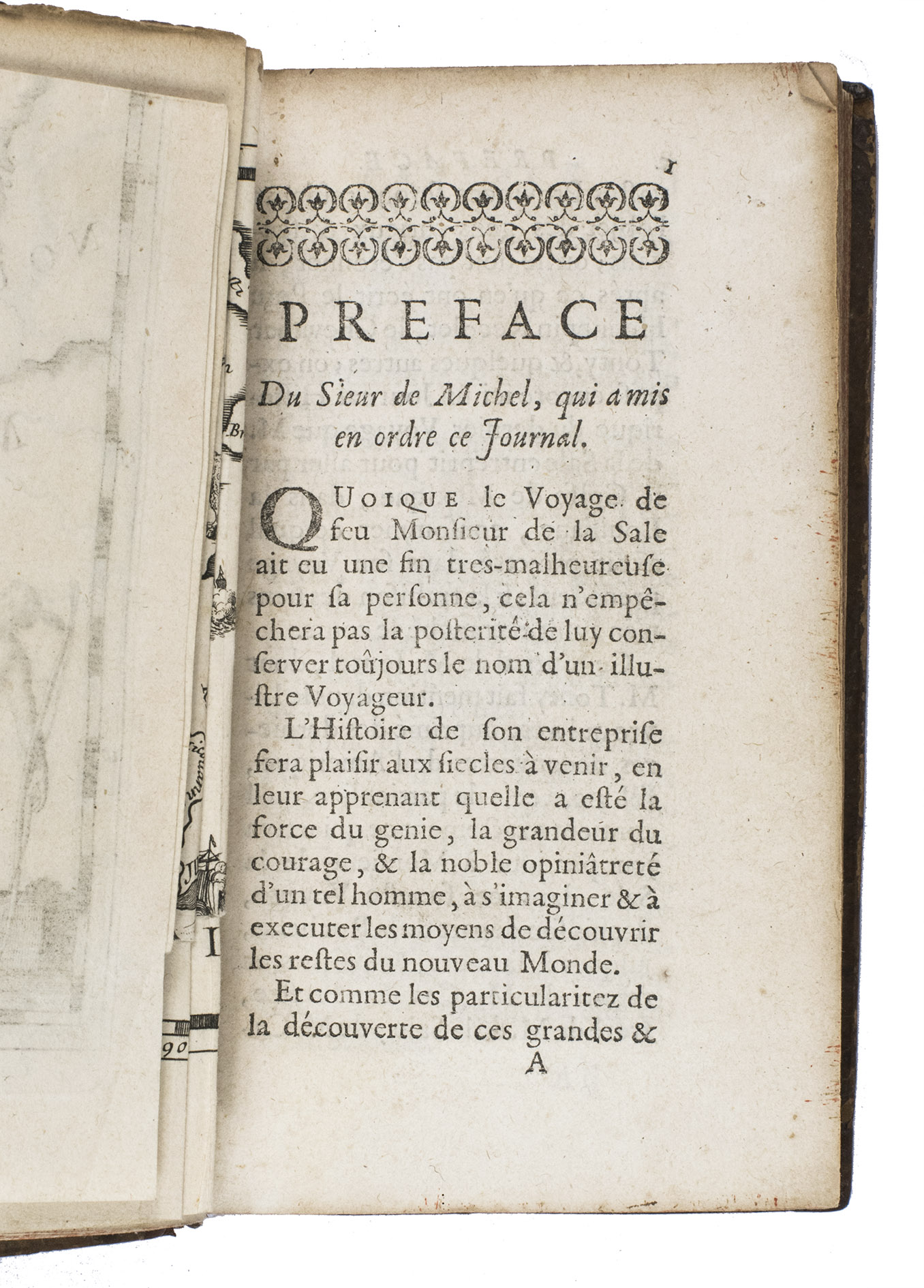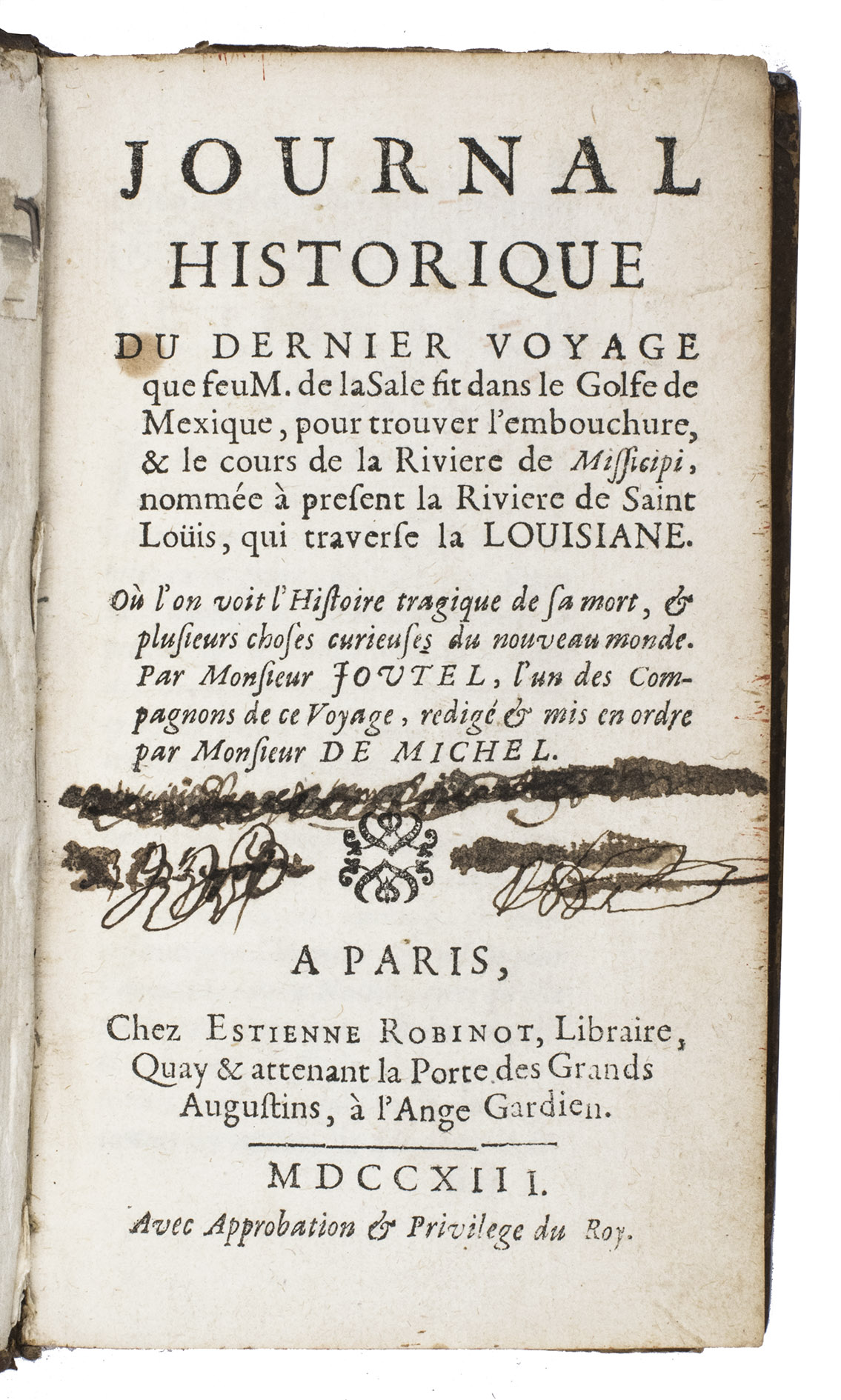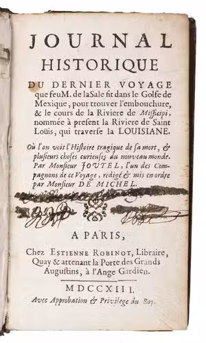 Extremely rare first edition of the journal of the last voyage made by De La Salle to America and the Gulf of Mexico to explore the Mississippi River and Louisiana. The expedition turned out tragically, for De La Salle was murdered by his own men during the journey on 19 March 1687. This account is written by Henri Joutel, one of his companions and probably the only person on board whom he could rely on. Charlevoix, who knew Joutel personally, once described him as a very upright man.