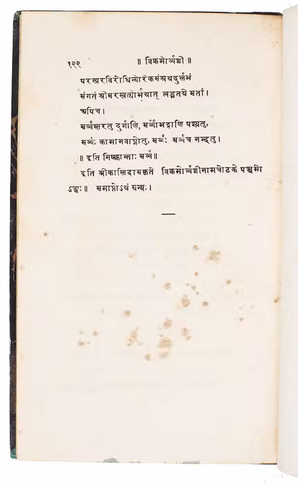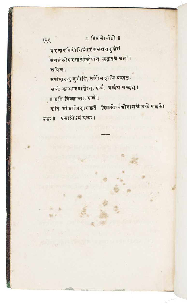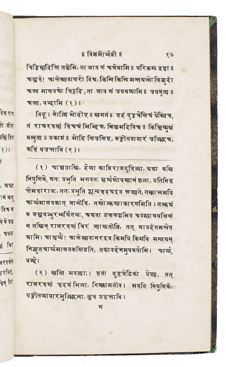 The first Prákrit edition, printed in 1830 in Calcutta, of one of the three dramas we can attribute to the classical Sanskrit poet Kálidása. In five plays, it tells the Vedic love story, founded on a legend related in the Satapatha-Brâhmana, of King Pururavas (or Vikrama) and an Aspara, the celestial nympf Urvasi. The drama tells of the tragic love between the mortal Pururavas and the divine nympf Urvasi, where Pururavas has to lift the curse on Urvasi by showing valour. The play is remarkable because of the richness of the Prákrit (an Indian dialect that can be regarded as the language of the lower orders) in both structure and metrical code.