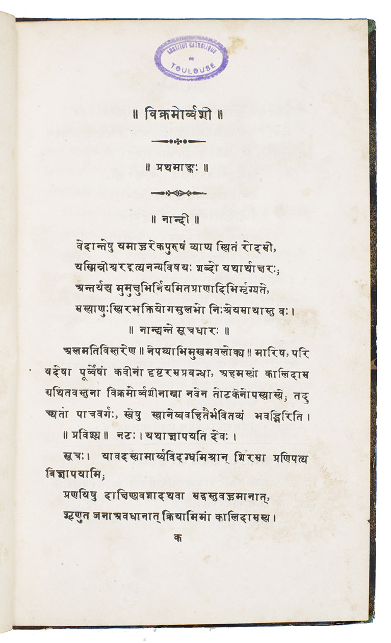 With the library stamp of the Institut Catholique Toulouse. Binding slightly worn, a little piece of the spine lost, but otherwise in good condition. Ancient and Mediaeval India II, pp. 191-206; Luthra, Tales from Kalidasa (2006), p. 76; preface to the 1826 English ed. by Horace Hayman Wilson (Calcutta, V. Holcroft, Asiatic Press), pp. 3-11.