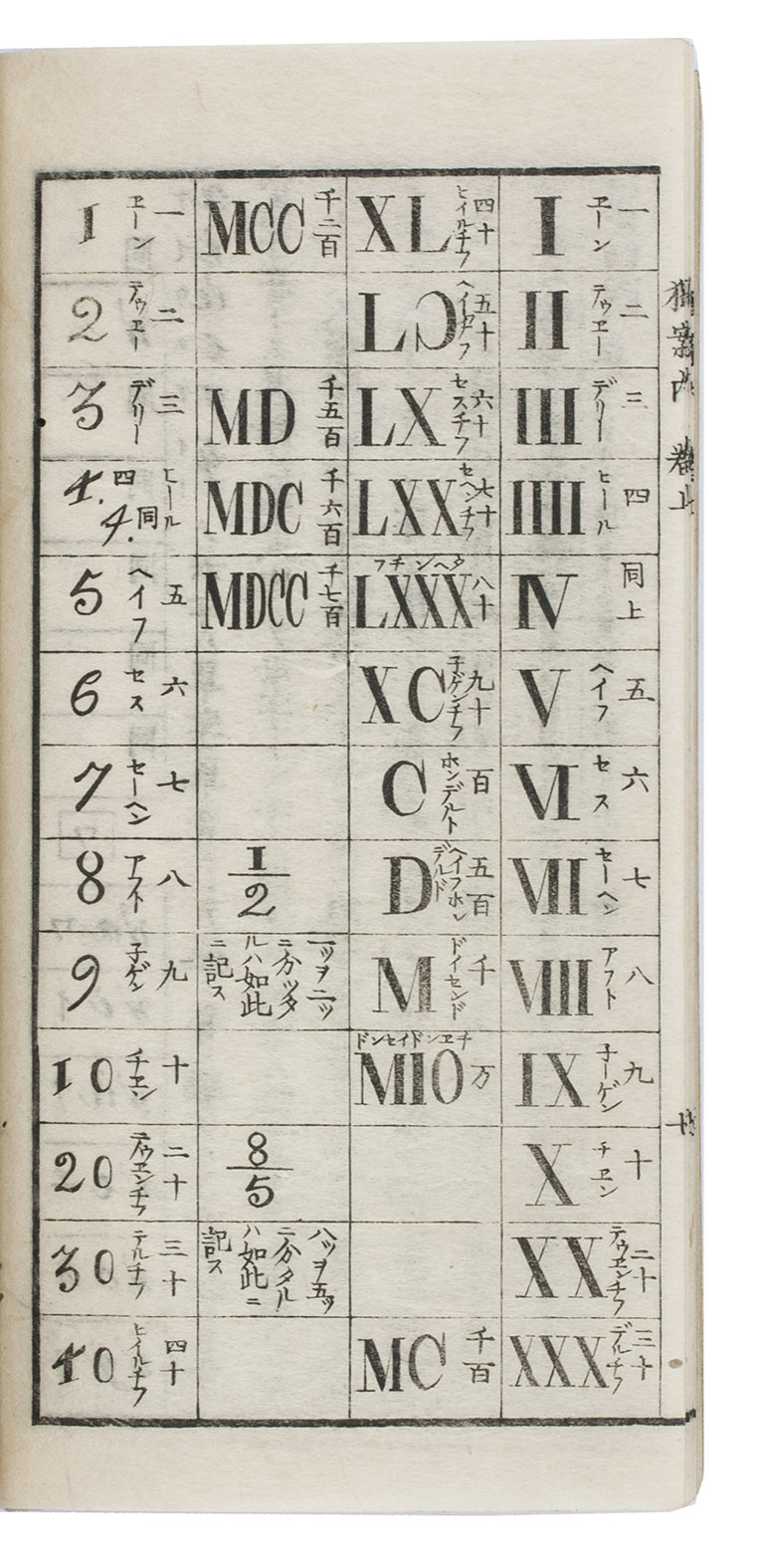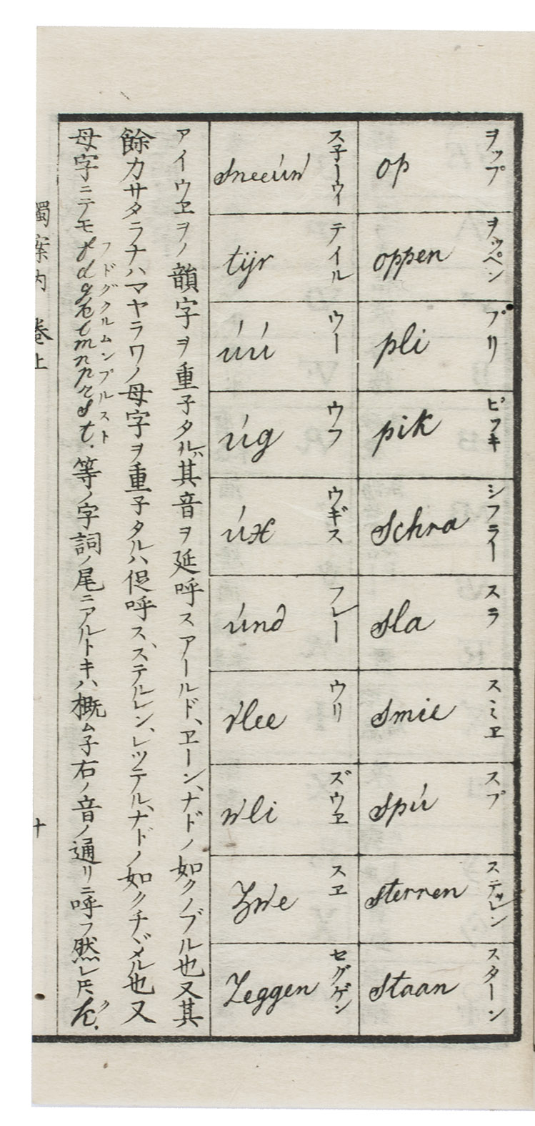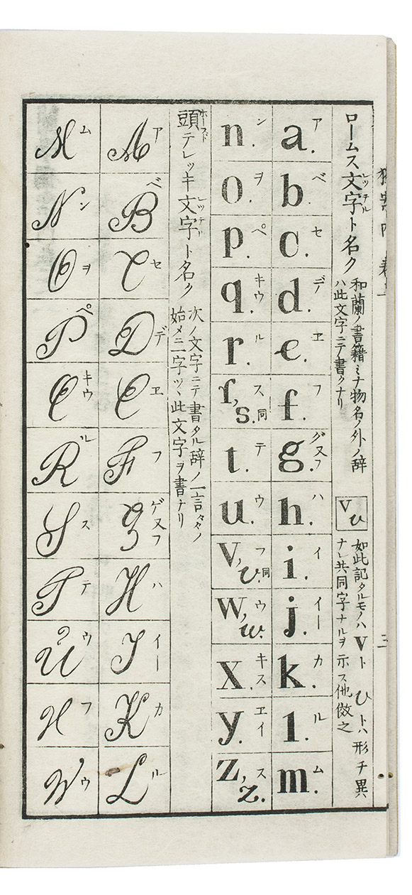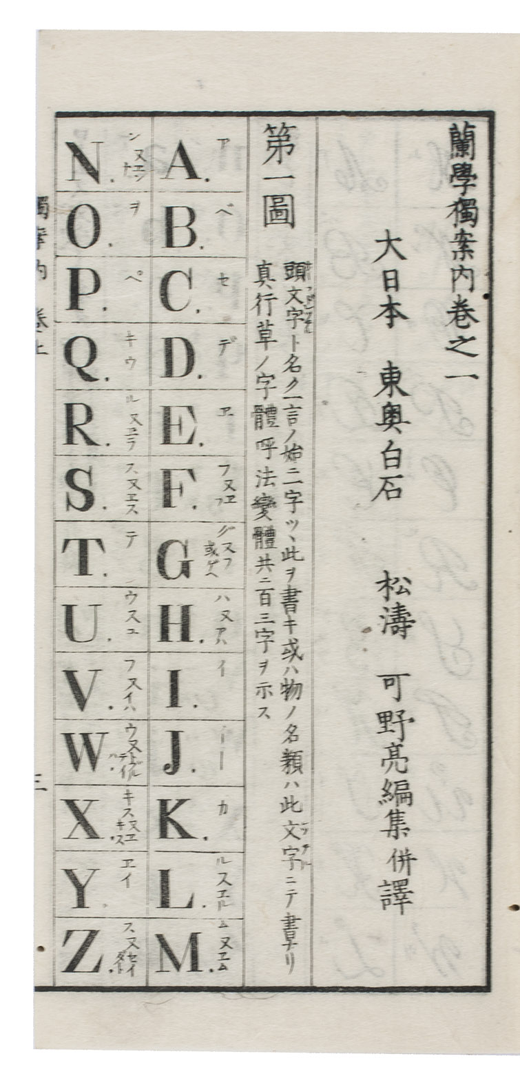 Japanese-Dutch manual or guide intended for Japanese people who wish to use Dutch in commercial trade. "Rangaku" means "Dutch studies" and "hitori annai" means "guide". Intended as an aid to reading, writing and speaking. After the title-page, the first part gives a four-page introduction, then presents the Latin alphabet in two forms: one like a 19th-century roman printing type (capitals and lowercase) and the other like 19th-century script handwriting (capitals and lowercase), with the corresponding Japanese characters to indicate the pronunciation. It also presents roman and arabic numerals; the pronunciation of vowels, consonants and various syllables; some simples words; punctuation; symbols for weights, measures, monetary units and other symbols, marks and abbreviations; the names of months, seasons and four elements; names and signs of zodiac figures and planets. The second part presents more complicated words with Japanese translations, and the third part about 150 one- or two-line phrases in Dutch, often dividing words into separate syllables (with some words misspelled or arbitrarily divided at the end of a line).