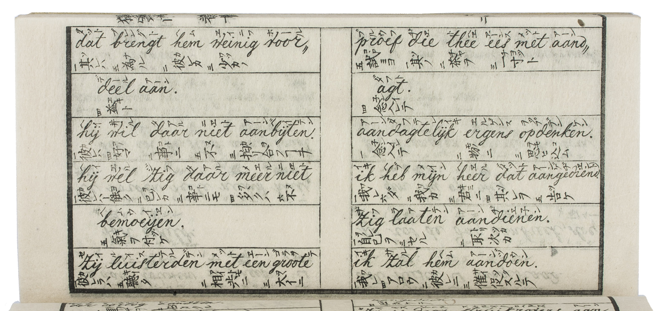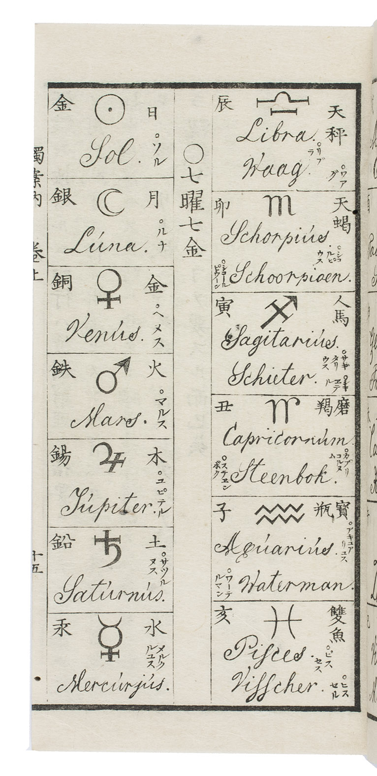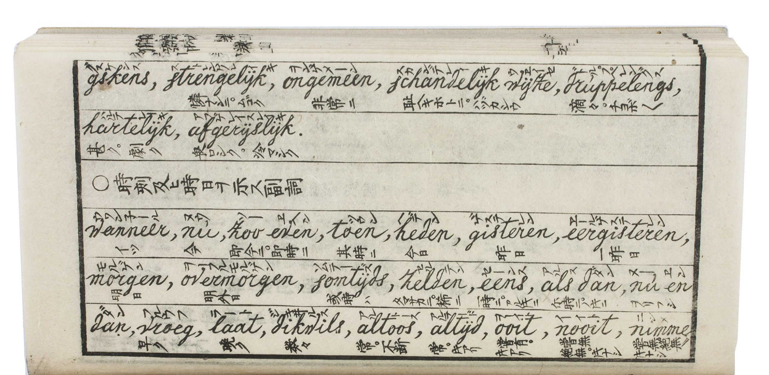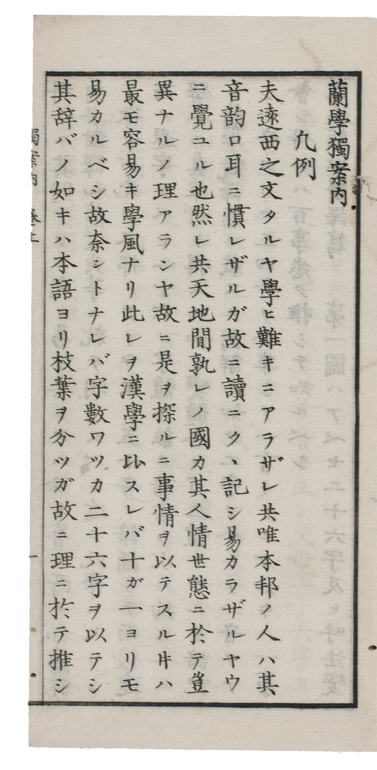 Japanese-Dutch manual or guide intended for Japanese people who wish to use Dutch in commercial trade. "Rangaku" means "Dutch studies" and "hitori annai" means "guide". Intended as an aid to reading, writing and speaking. After the title-page, the first part gives a four-page introduction, then presents the Latin alphabet in two forms: one like a 19th-century roman printing type (capitals and lowercase) and the other like 19th-century script handwriting (capitals and lowercase), with the corresponding Japanese characters to indicate the pronunciation. It also presents roman and arabic numerals; the pronunciation of vowels, consonants and various syllables; some simples words; punctuation; symbols for weights, measures, monetary units and other symbols, marks and abbreviations; the names of months, seasons and four elements; names and signs of zodiac figures and planets. The second part presents more complicated words with Japanese translations, and the third part about 150 one- or two-line phrases in Dutch, often dividing words into separate syllables (with some words misspelled or arbitrarily divided at the end of a line).