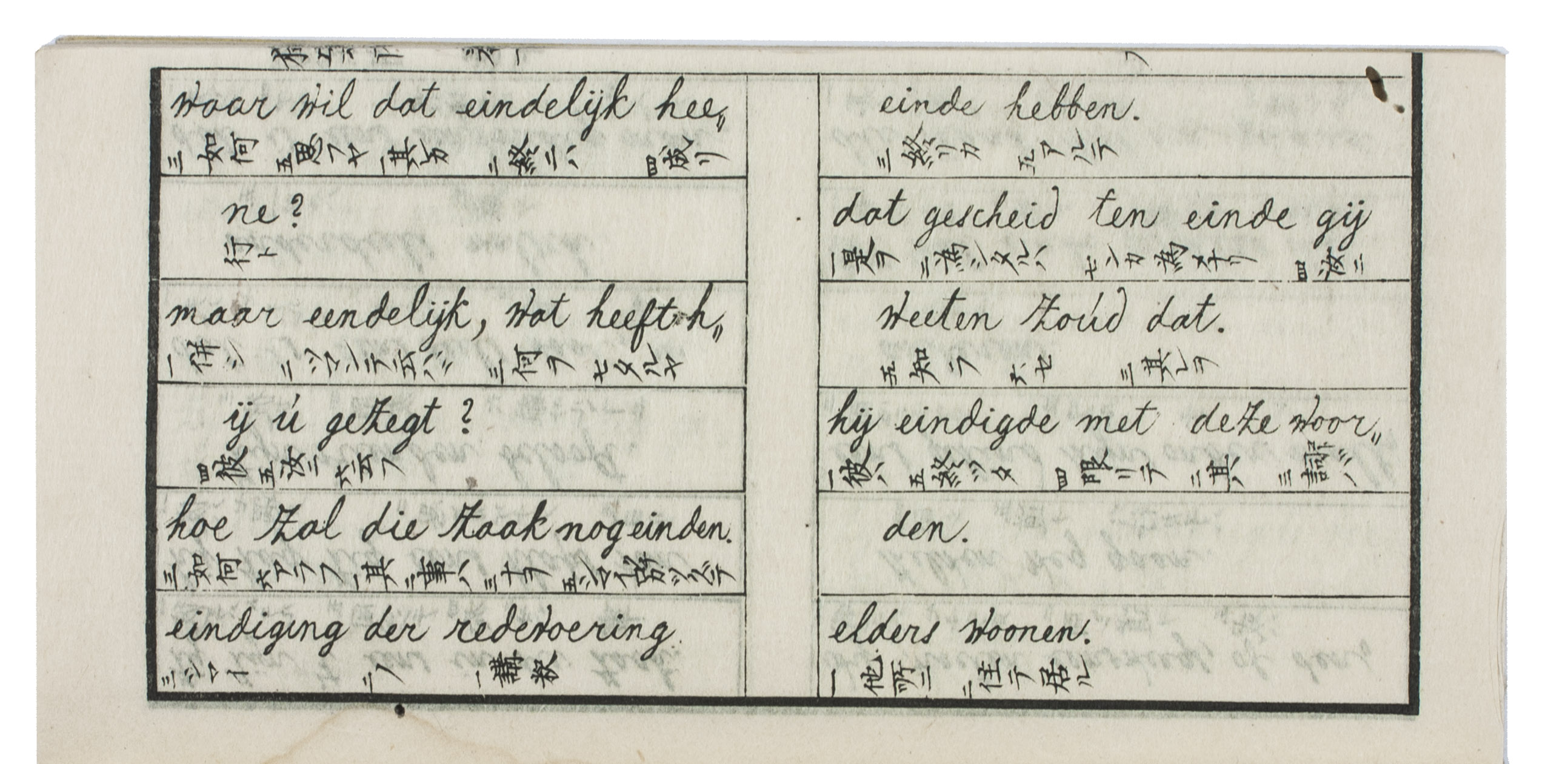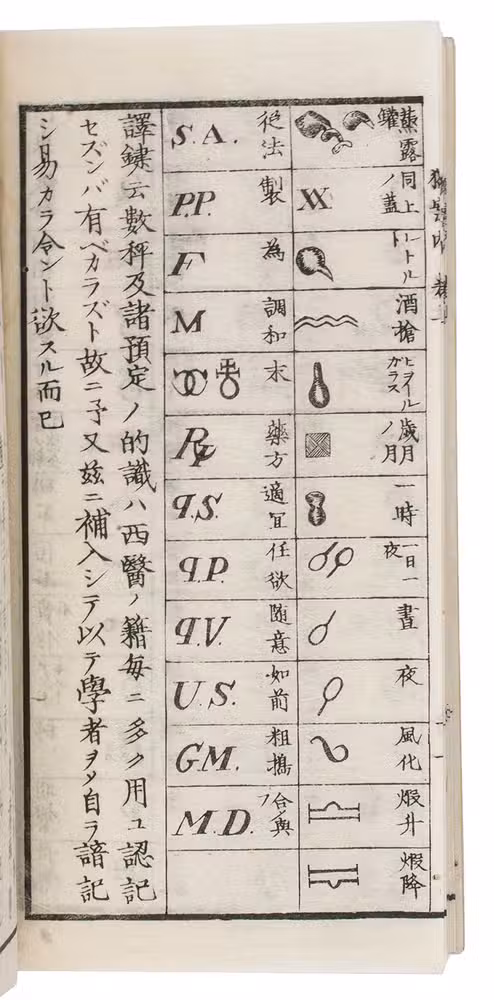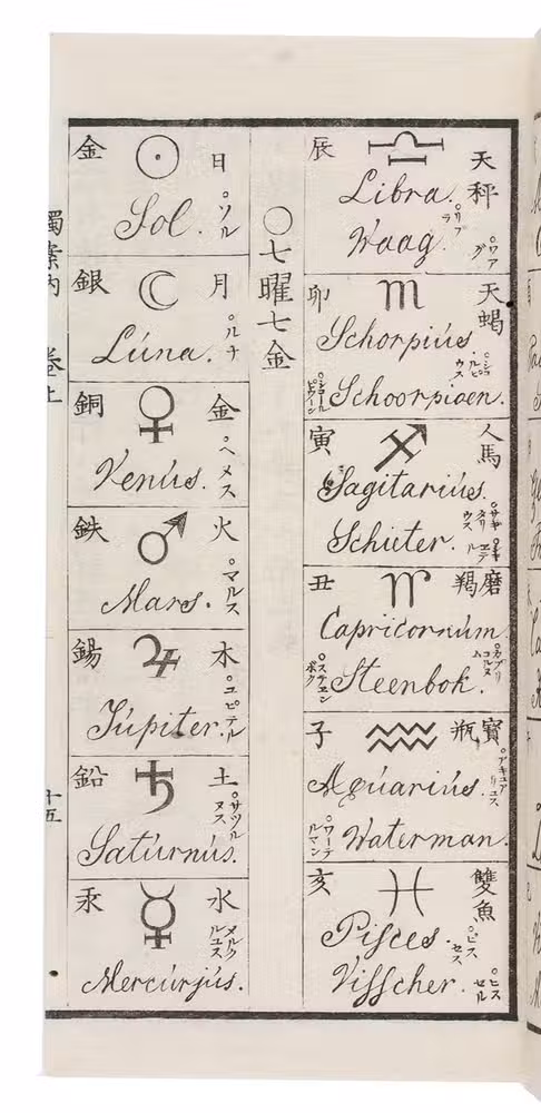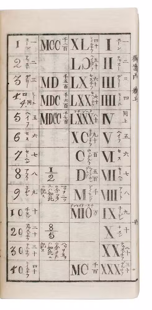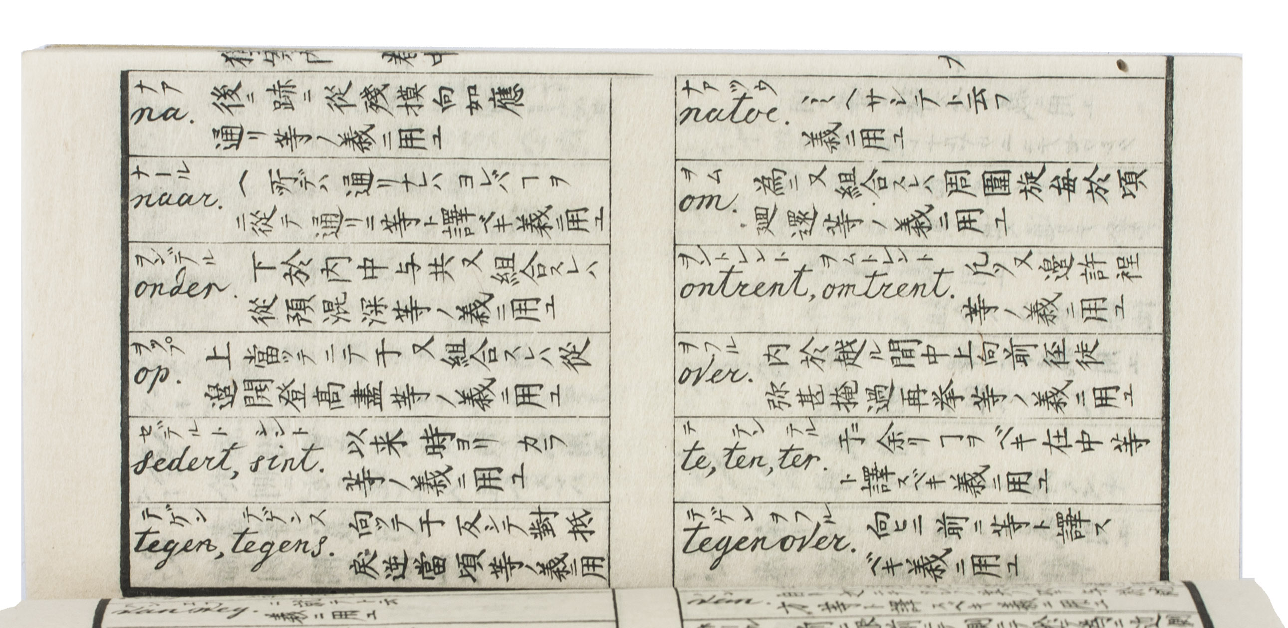 Japanese-Dutch manual or guide intended for Japanese people who wish to use Dutch in commercial trade. "Rangaku" means "Dutch studies" and "hitori annai" means "guide". Intended as an aid to reading, writing and speaking. After the title-page, the first part gives a four-page introduction, then presents the Latin alphabet in two forms: one like a 19th-century roman printing type (capitals and lowercase) and the other like 19th-century script handwriting (capitals and lowercase), with the corresponding Japanese characters to indicate the pronunciation. It also presents roman and arabic numerals; the pronunciation of vowels, consonants and various syllables; some simples words; punctuation; symbols for weights, measures, monetary units and other symbols, marks and abbreviations; the names of months, seasons and four elements; names and signs of zodiac figures and planets. The second part presents more complicated words with Japanese translations, and the third part about 150 one- or two-line phrases in Dutch, often dividing words into separate syllables (with some words misspelled or arbitrarily divided at the end of a line).