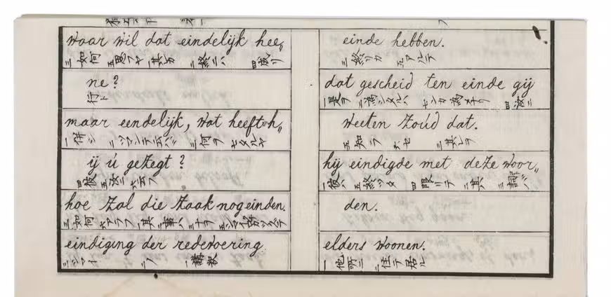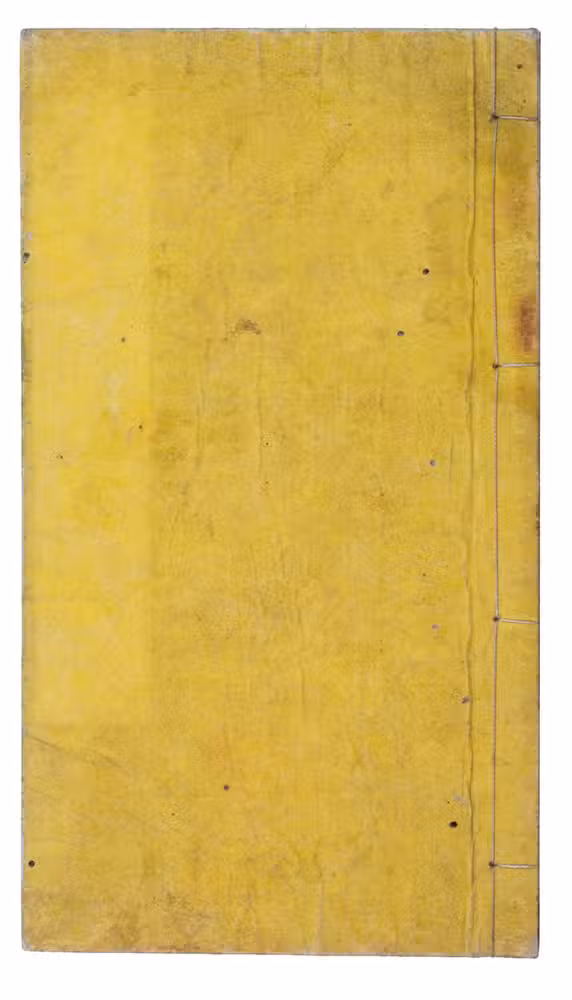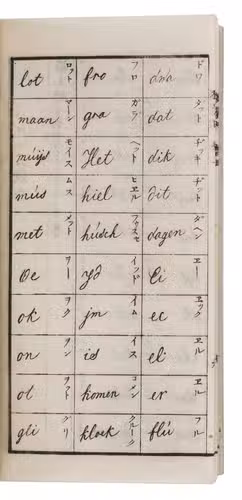 [Tokyo?], Shimogakudo, [ca. 1856]. Small 8vo. Japanese introduction to the Dutch language, comprising 37 printed and 1 blank double leaves (with the fold at the fore-edge) printed from 37 woodblocks (35 double-page plus the first and last single-page), with the first double leaf (with the title page) and the last double leaf (blank) serving as a pastedowns. With a second copy of the double-leaf with the title page, loosely inserted. Side stitched and oversewn, with the original publishers yellow wrappers (without any label) and a contemporary wrap-around sleeve (fukuro), preserved in a brown cloth slip-case in Japanese style. [1], 15, 10, 10, [1], [1 blank] ll.