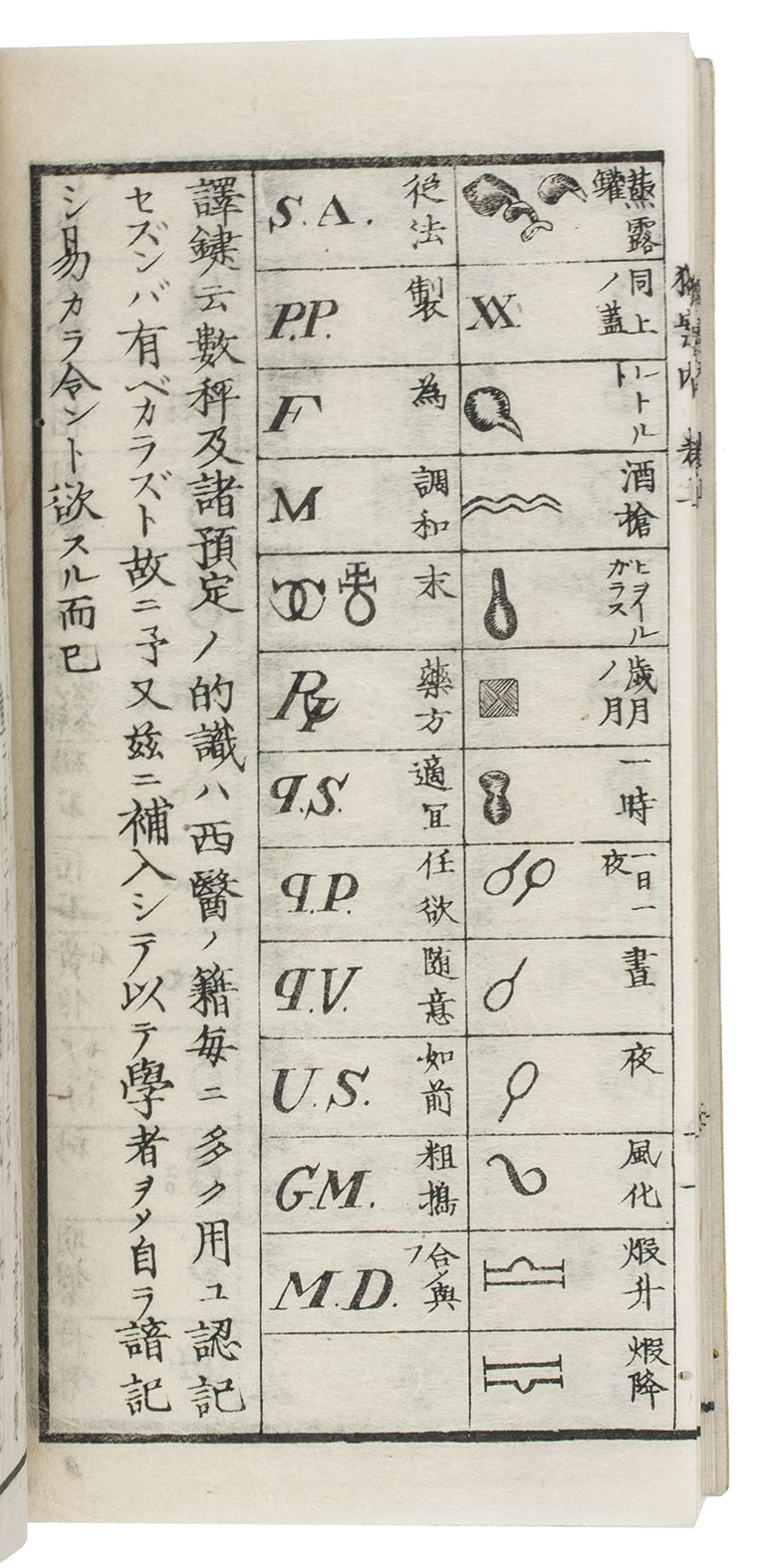 Each copy of the title page shows two Japanese owners red ink-stamped seals (inkans or hankos), one above right (red on white) and the other below left (white on red), all with rounded corners and their texts in seal characters, in the bound-in title page: rectangular with a single column of 2 characters (upper right) and square with two columns of 1 and 3 characters(?) (lower left); in the loosely inserted title-page: rectangular with 2 columns of 4 and 4(?) characters (upper right) and rectangular with 1 and 3(?) characters (lower right). The loosely inserted title page has a third stamp on the back, rectangular with rounded corners, with a single column of 3 kanji(?) characters (red on white). With a few minor worm holes, one slightly affecting the border of the bound-in title-page and some other pages, and some minor water stains in the margins and the last (blank) leaf, but generally in fine condition. www.wul.waseda.ac.jp (under bunko 08 C0560: see ho 10 01917 for the 1856 ed.); cf. Martin J. Heijdra, "At the shores of the sky", in: Polyglot translators, pp. 62-75, at pp. 74-75 (1856 ed.); not in WorldCat.