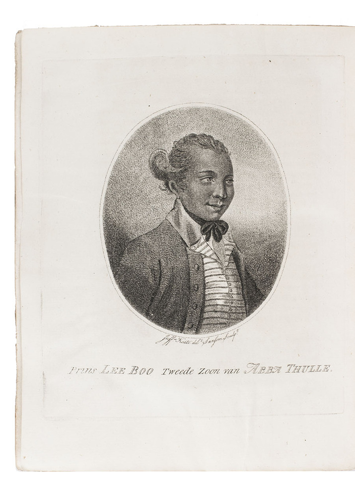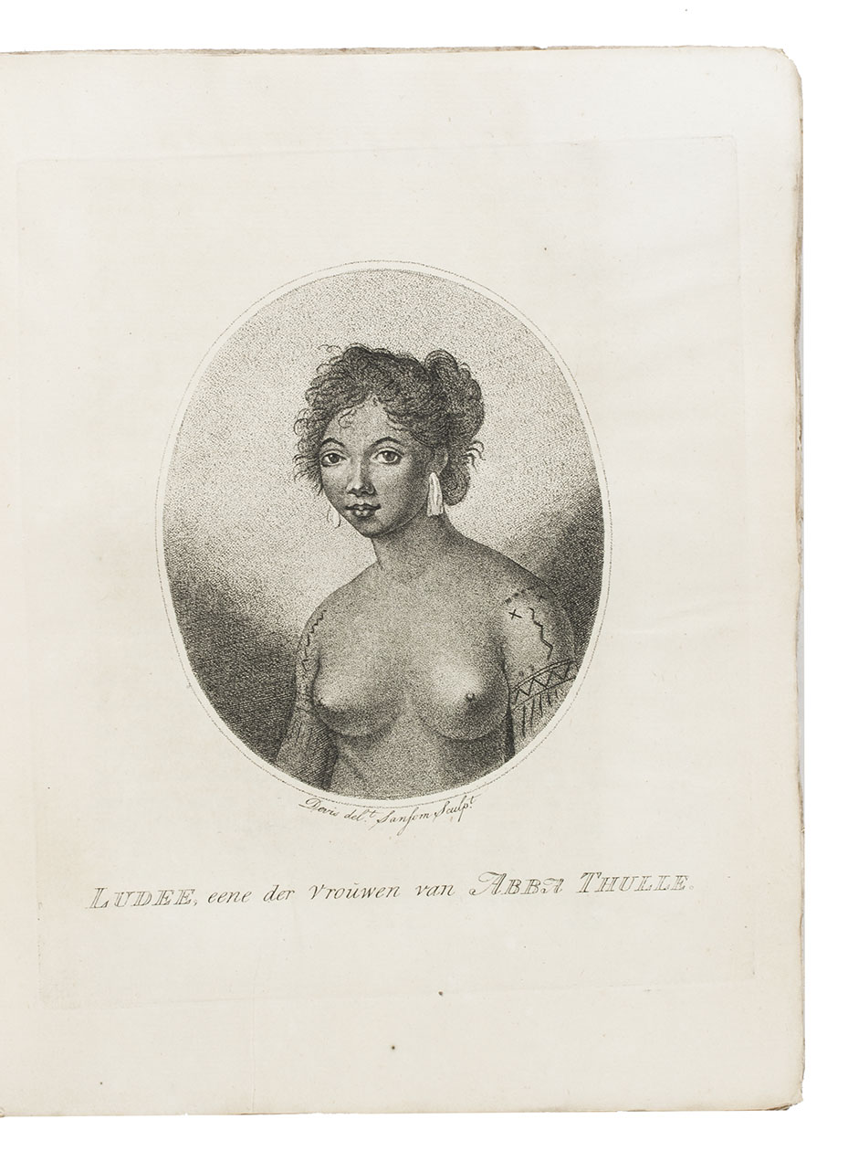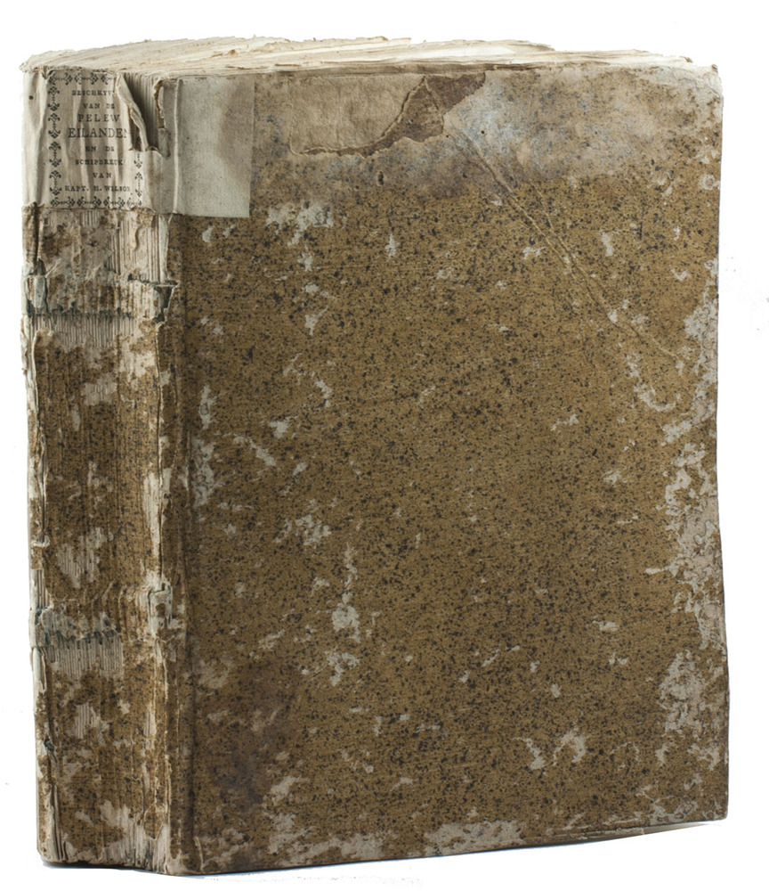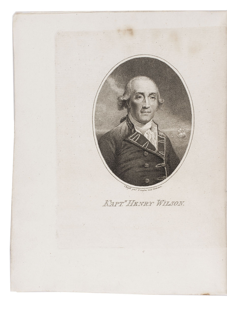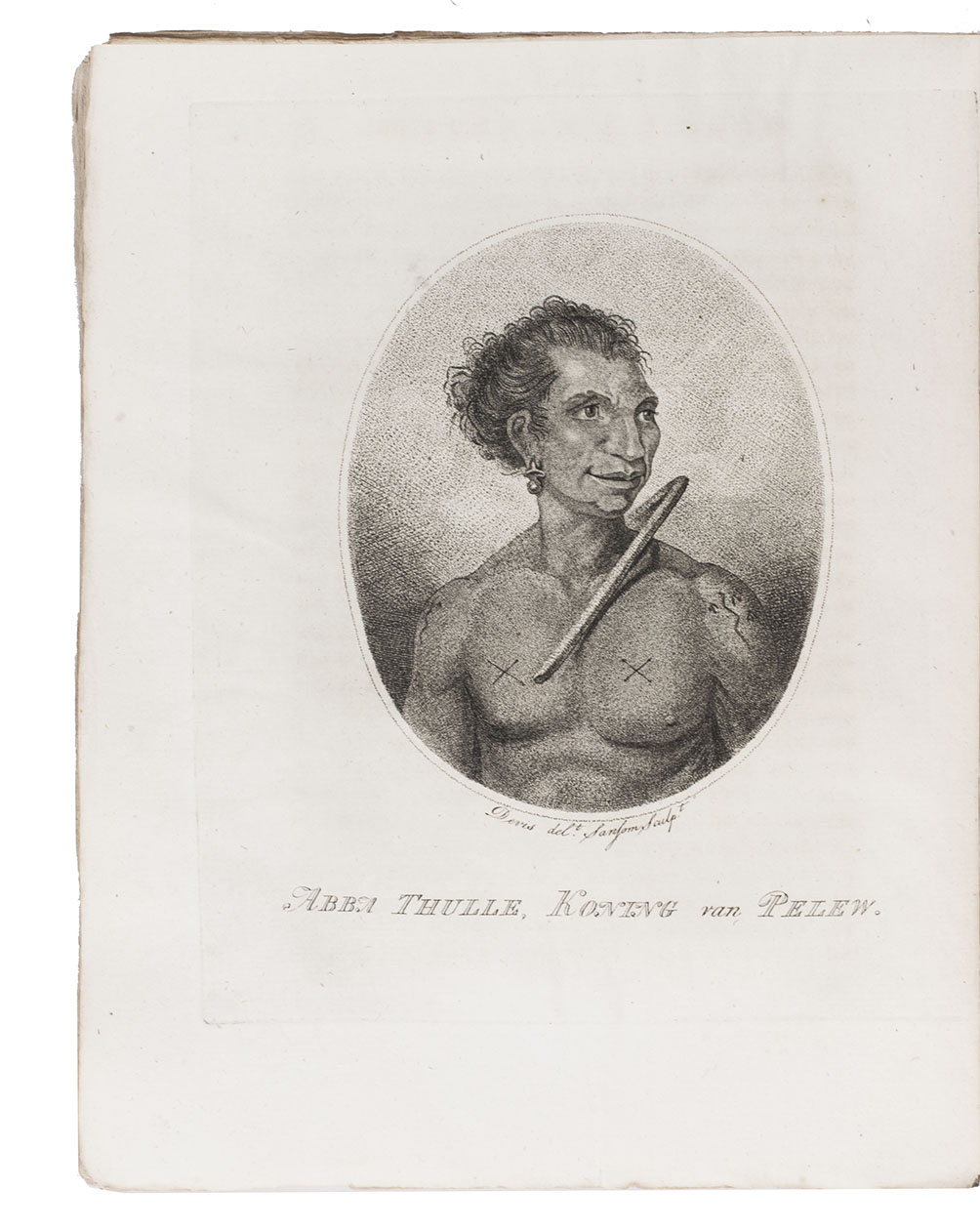 Rotterdam, Gerard Abraham Arrenberg, 1789. 4to. With 8 plates: 4 mixed technique (partly stipple-engraved) portraits, 1 large folding engraved map of the Palau Islands and western equatorial Pacific, and 3 folding engraved views. Contemporary boards. XXXII, 365, [1] pp.