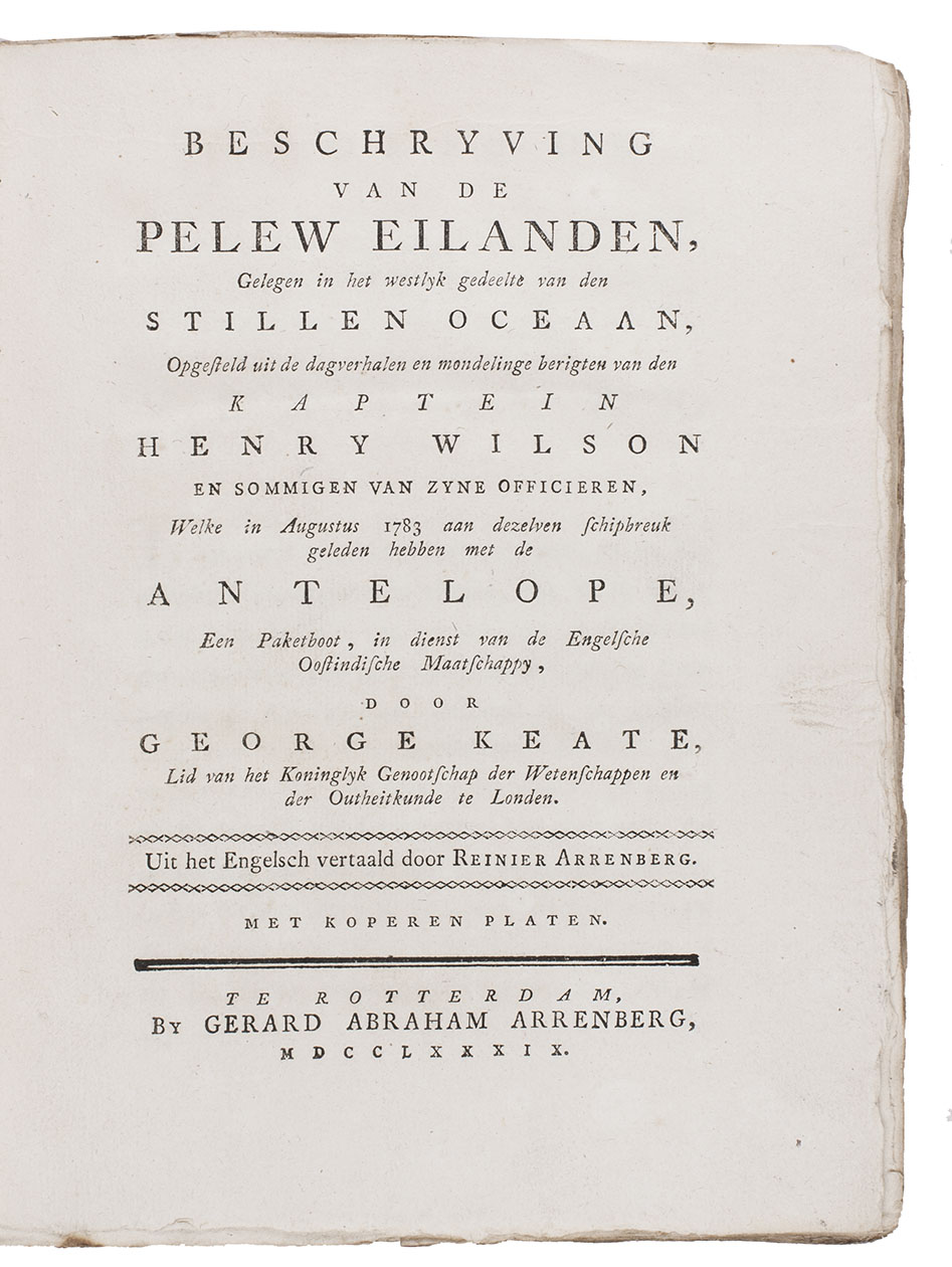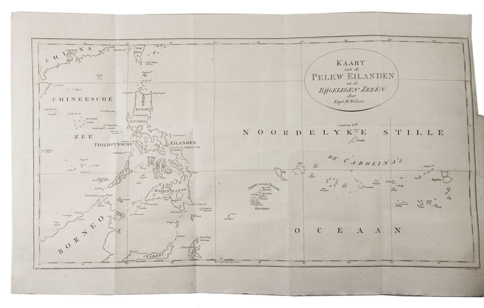 First Dutch translation of one of the most popular 18th-century books on the Pacific, and the main source of early knowledge of the Pelew or Palau Islands in Micronesia, first published in London as An account of the Pelew Islands (1788). In 1773, the Antelope under command of Captain Henry Wilson was shipwrecked near one of the Palau Islands, a previously unexplored group. The crew managed to reach shore, where they were well treated by the natives. They built a small boat from the wreck, in which they reached Macao. They took Lee Boo, the son of Abba Thulle, King of the Palau Islands, with them to England where he made a very good impression. Unfortunately, he soon died of smallpox. The map covers from the equator to 24°N latitude and from 110 to 159°E longitude (from Borneo and the south coast of China in the west to the western Caroline Islands).