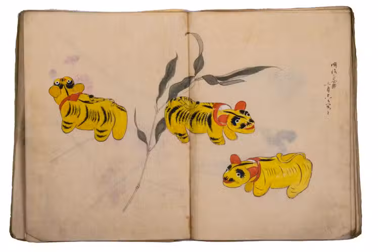 A set of excellent Japanese drawings on Japanese paper, nearly all in colour, the dated ones mostly from 1901 to 1903, though one apparently 1898. Most show flowers, but some also or instead show fruits, vegetables, berries, roots, tree branches, grasses, etc., all in a consistent style and format and botanically accurate. One includes a butterfly, four show birds or feathers in great detail (with or without flowers) and one shows three kubi furi tora (bobbing-head tigers) that would have been carved out of wood or made of papier maché and then painted. Most double-page spreads are clearly planned as a single composition, sometimes with one large drawing across both pages and sometimes with three drawings with the centre one across the fold, but some have two drawings, one on the right page and one on the left page. Some also have additional detail drawings. Although the title calls the collection morning glory sketches, other flowers are just as frequent and prominent. Flowers shown include camellia, cherry, hibiscus, crocosmia, narcissus, peony, iris and many more. In addition to flowers, the botanical drawings include bananas, sweet potato, melon, bamboo shoots, ginger, saffron, some sort of cabbage, peas(?) growing in a pot and others. Three double-page spreads contain very fine drawings of birds and another of bird feathers (including a peacock feather).