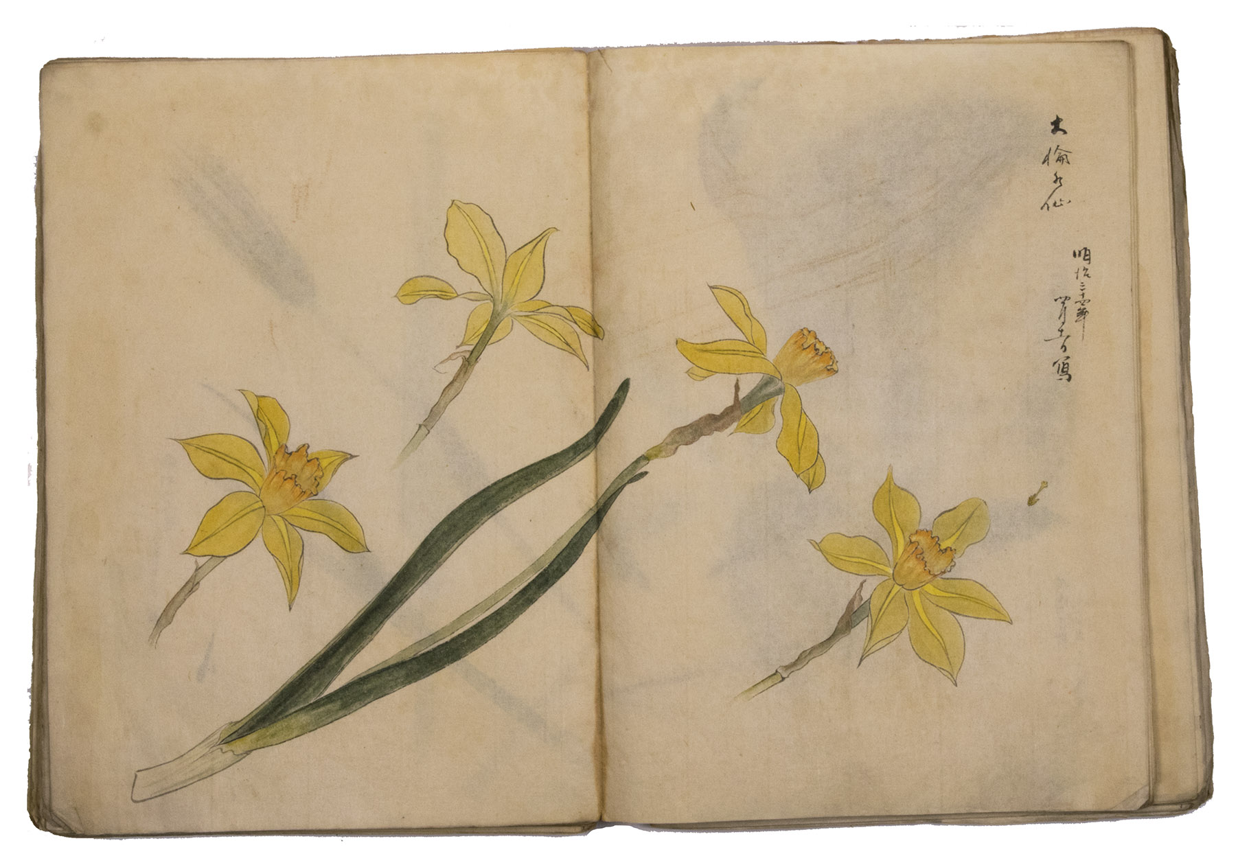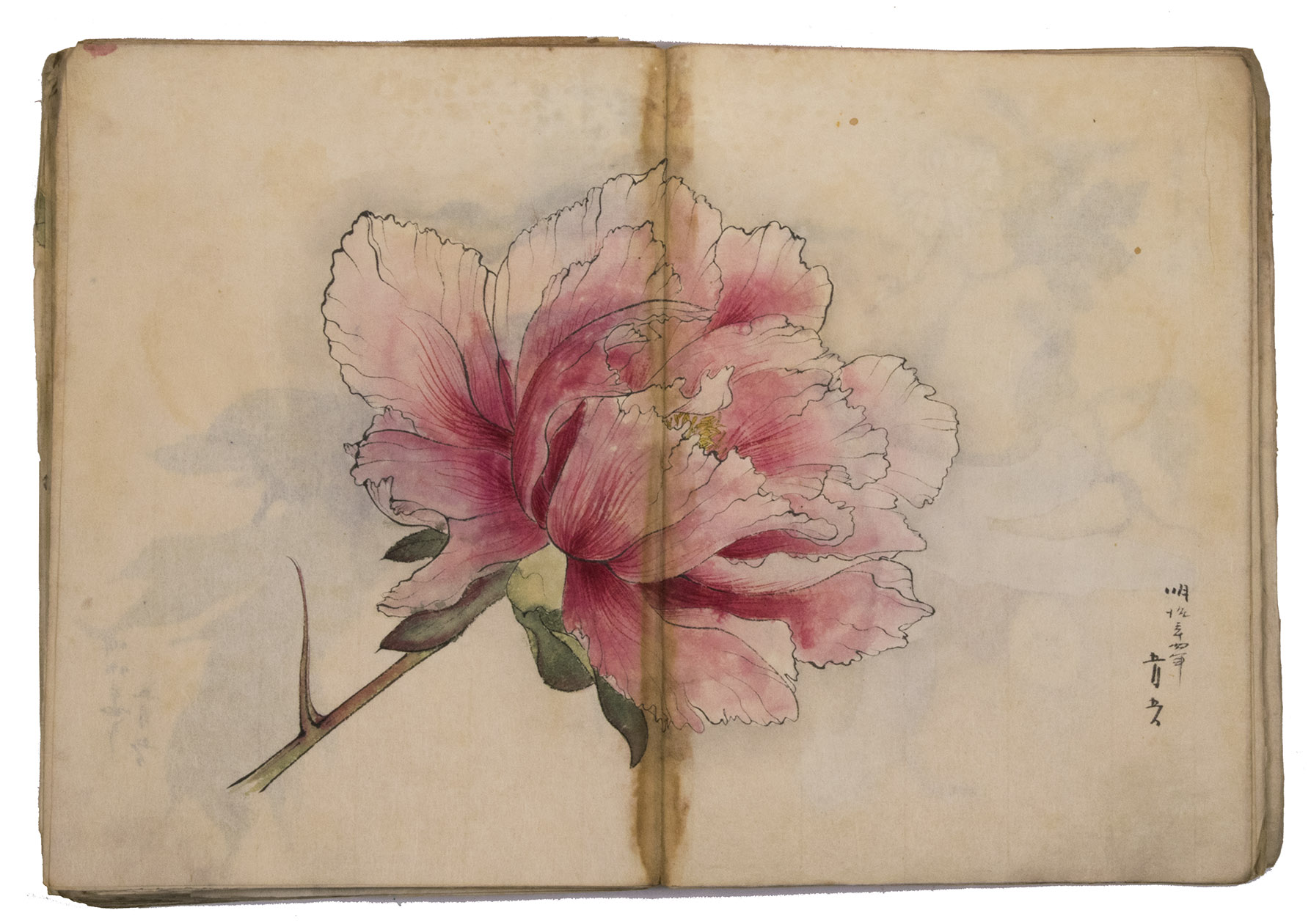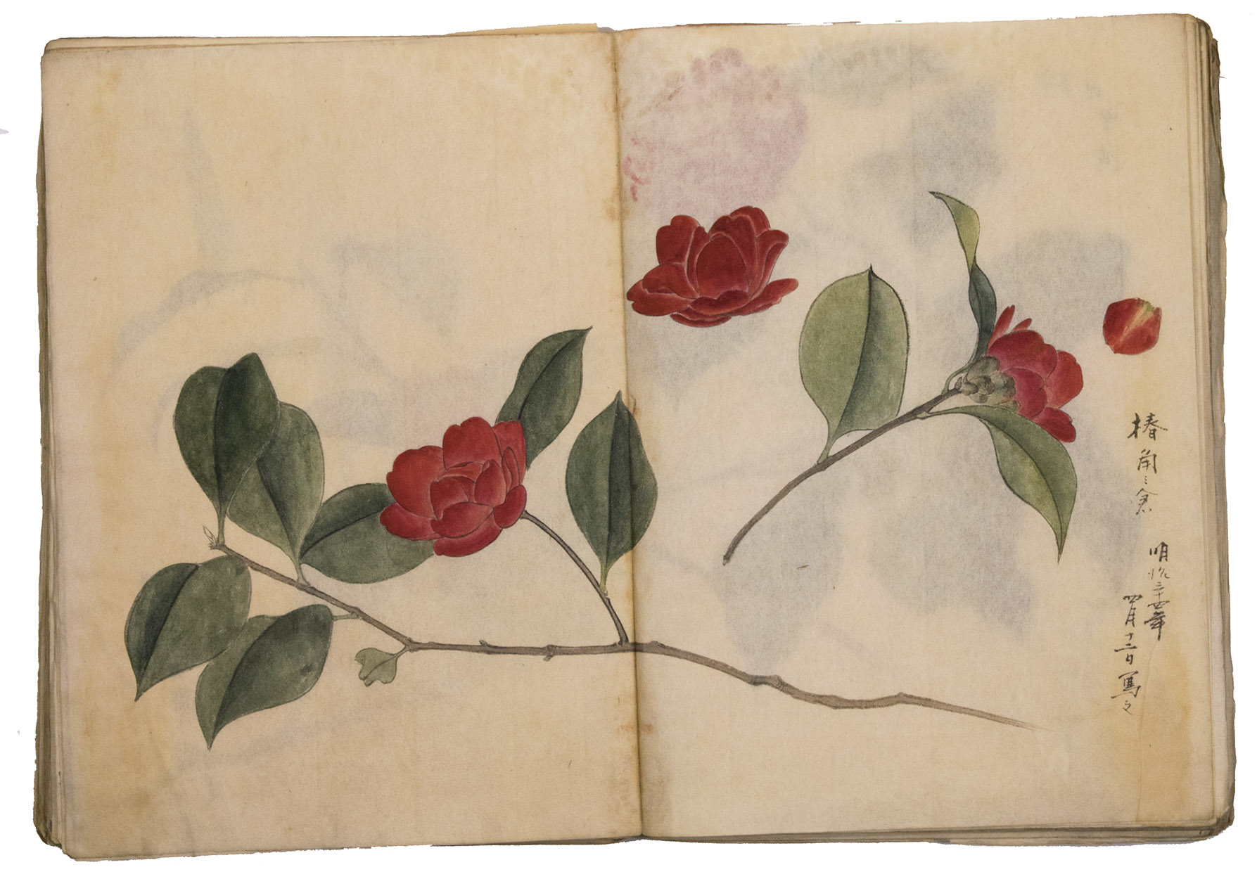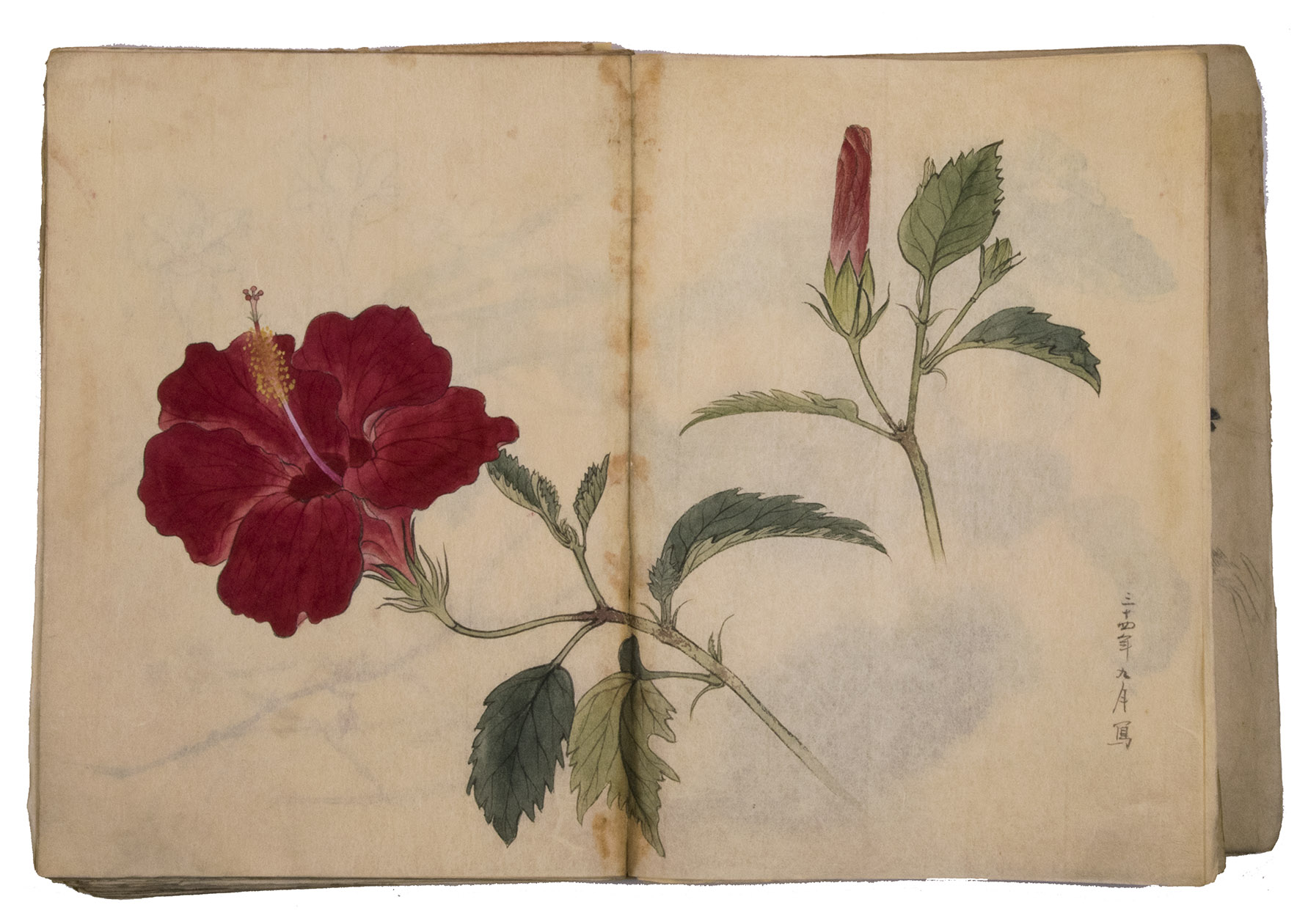 Japan, Meiji 31?, 34-36 [=1898?, 1901-1903]. Very large 8vo? (28 x 20.5 cm). With 85 double-page (mostly botanical) drawings in black ink on Japanese paper, each showing 1, 2 or 3 figures, sometimes with additional detail drawings, nearly all coloured in watercolour and/or gouache and most with captions identifying the subject and/or giving the date. Front wrapper with the title in Japanese in black ink. Wrapper-title plus [85] double-page spreads.