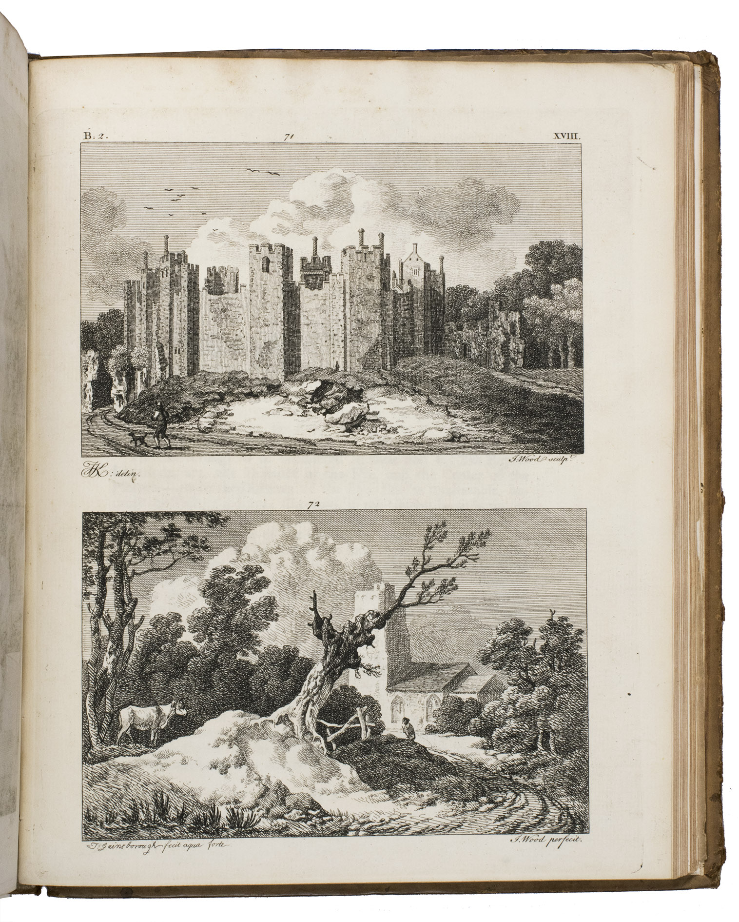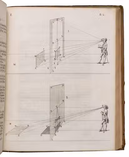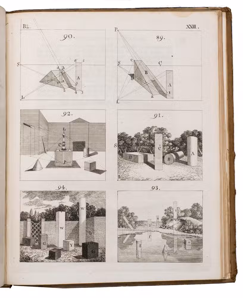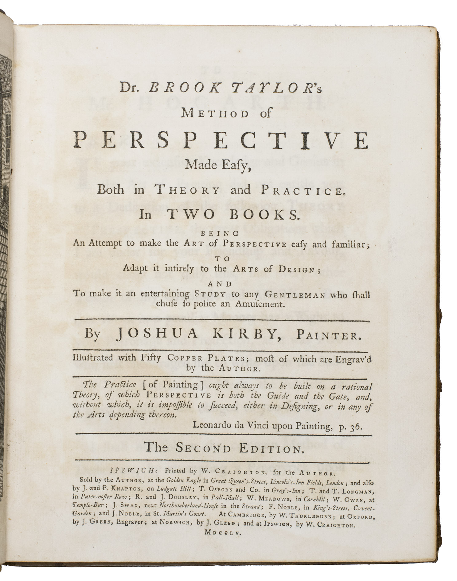 Kirby's book represented the first and very successful attempt by an English artist to present Brook Taylor's New Principles of Linear Perspective, first published in 1719, in a clear and simple manner for the benefit of artists, as Brook Taylor's mathematical theories had proved rather too abstract for many of them. The first edition of Kirby's work had been published in Ipswich in 1754, also at the author's own expense. It was divided into two parts, the first part concerning the theory and the second part concerning the practice of perspective. The work was sold out almost instantly. Its success caused the author to add an appendix to the work, discussing some additional problems of perspective, illustrated with two extra engraved plates. The list of subscribers includes Thomas Gainsbourough, who contributed a finely etched landscape to the work, one of only three etchings Gainsbourough ever executed. Kirby himself was drawing master to the Prince of Wales, the later King George III.