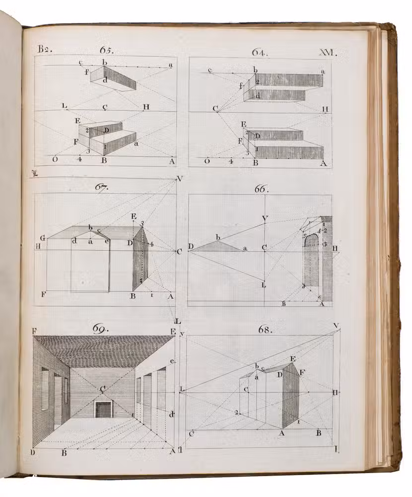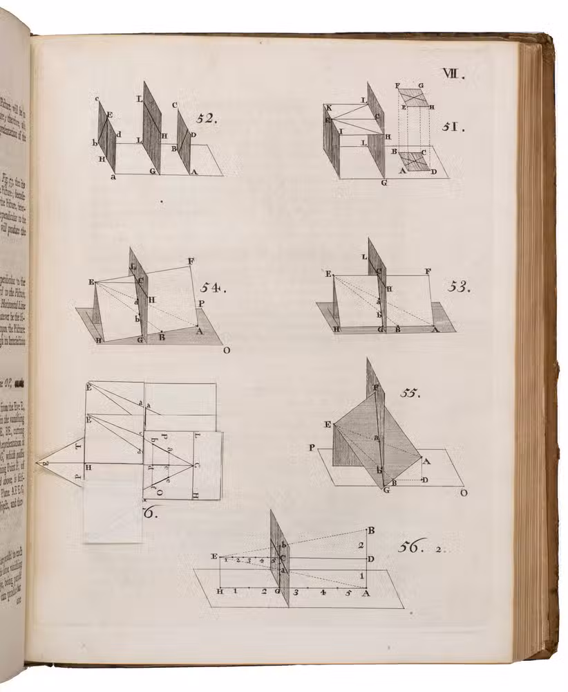Second enlarged edition of a famous work on perspective by Joshua Kirby (1716-1774), dedicated to William Hogarth, the author's close friend. Hogarth designed the delightful frontispiece, warning all draughtsmen: "Whoever makes a design without the knowledge of perspective will be liable to such absurdities as are shewn in this frontispiece".